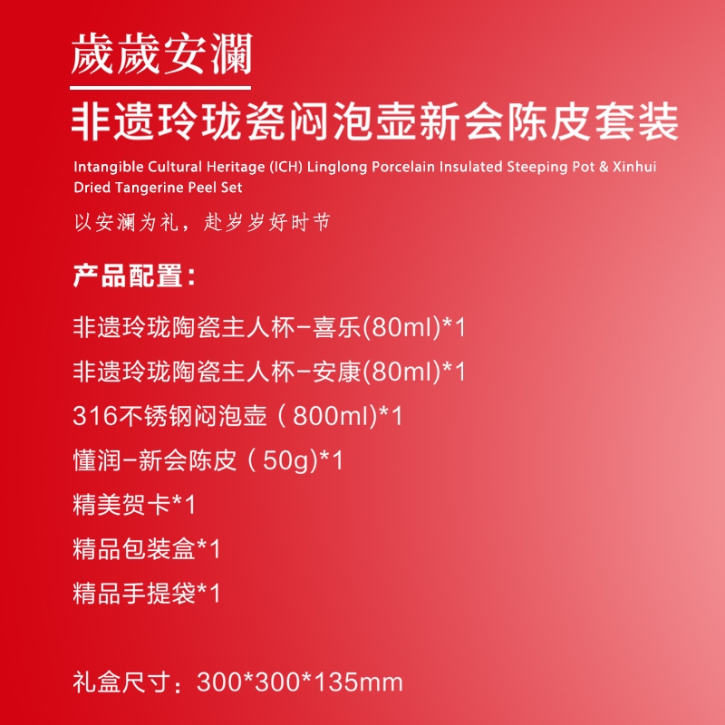 配置清单:非遗玲珑陶瓷主人杯-喜乐(80ml)*1 非遗玲珑陶瓷主人杯-安康(80ml)*1 316不锈钢闷泡壶(800ml)*1 懂润-新会陈皮(50g)*1 精美贺卡*1 精品包装盒*1 精品手提袋*1