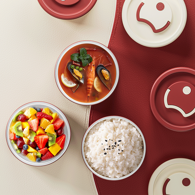 304不锈钢+PP;双层不锈钢抽真空工艺,有效锁住热量,保温时长可达4;保温保冷两用:夏季可携带冰镇饮品或水果