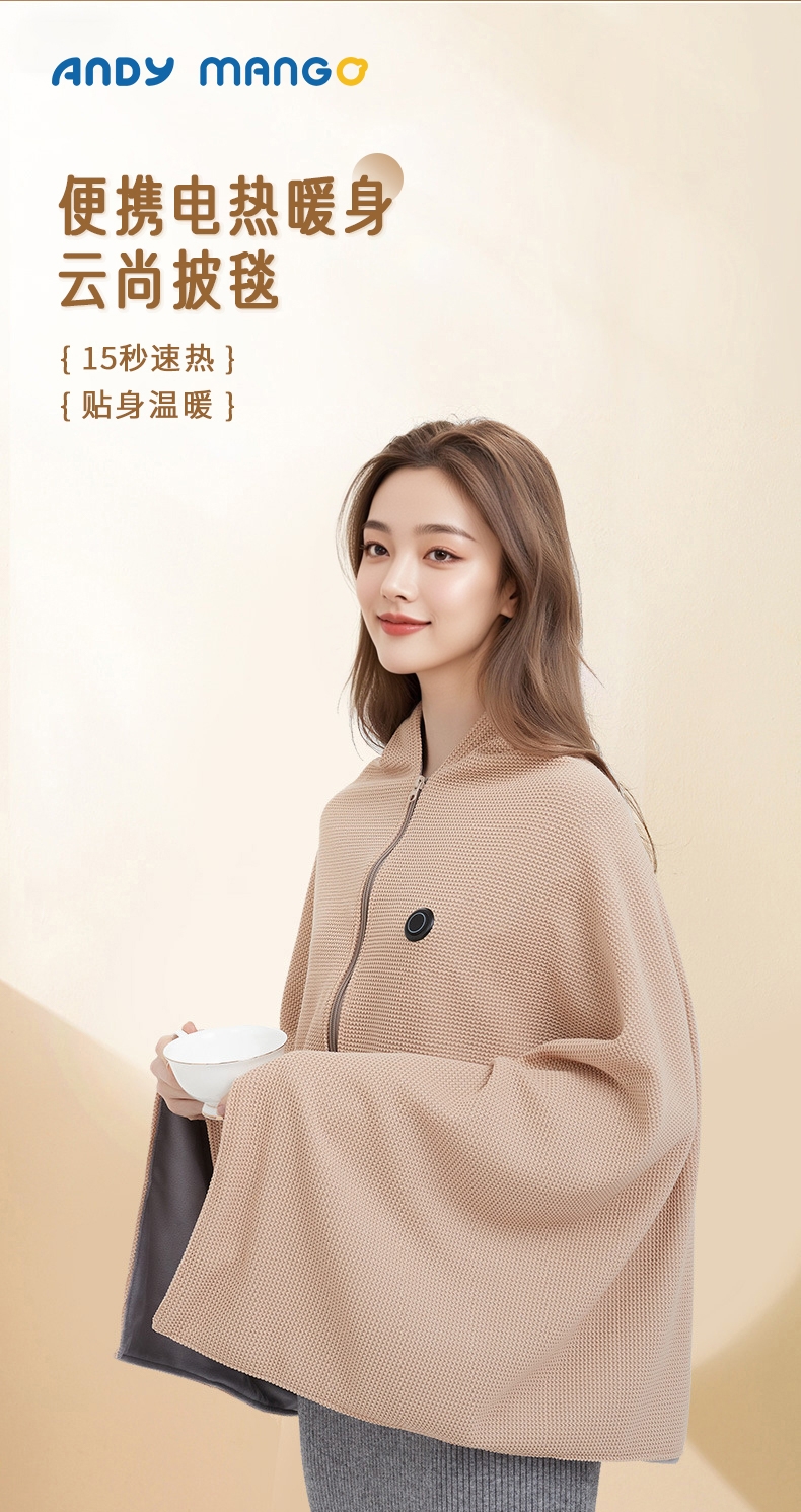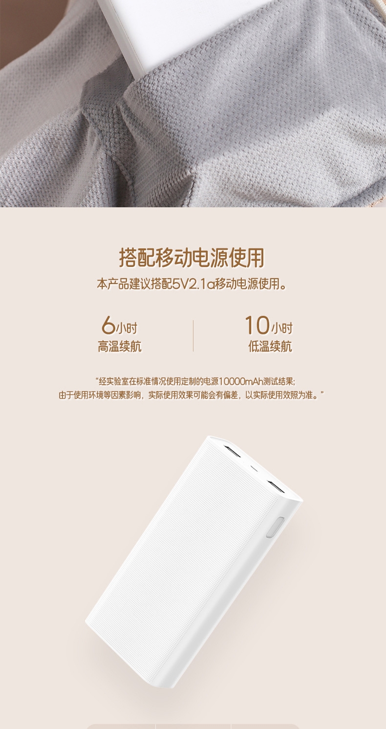 双面高棉度针织料织造,无甲醛等有害物质;3秒速热,根据自身需求,多档温度可调,保暖舒适;升级拉链设计,不易脱落解放双手;可拆卸水洗,柔软可折叠,便携随身收纳