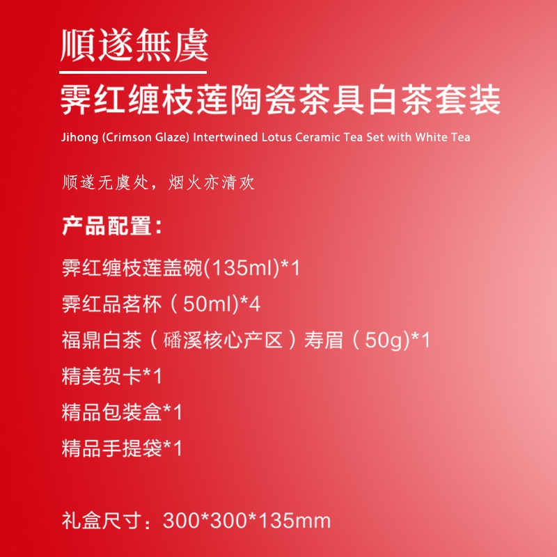 配置清单:霁红缠枝莲盖碗(135ml)*1 霁红品茗杯(50ml)*4 福鼎白茶(磻溪核心产区)寿眉(50g)*1 精美贺卡*1 精品包装盒*1 精品手提袋*1
