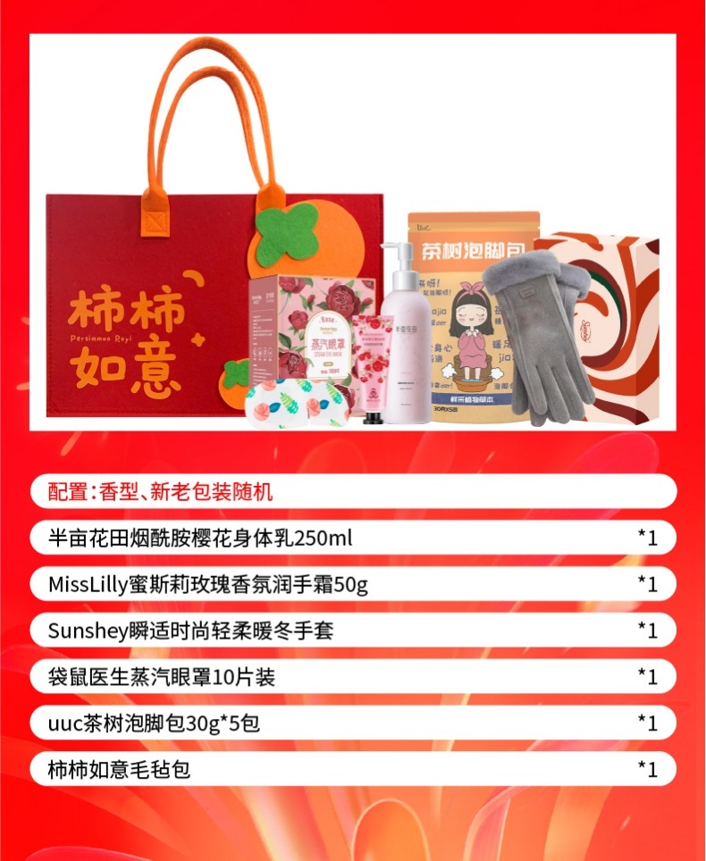 配置清单:半亩花田烟酰胺樱花身体乳250ml*1 MissLilly蜜斯莉玫瑰香氛润手霜50g*1 Sunshey瞬适时尚轻柔暖冬手套*1双 袋鼠医生蒸汽眼罩10片装*1 uuc茶树泡脚包30g*5包*1 柿柿如意毛毡包*1