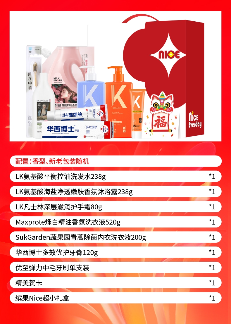 配置清单:LK氨基酸平衡控油洗发水238g*1 LK氨基酸海盐净透嫩肤香氛沐浴露238g*1 LK 凡士林深层滋润护手霜 80g*1 Maxprote烁白精油香氛洗衣液520g*1 SukGarden蔬果园青蒿除菌内衣洗衣液200g*1 华西博士多效优护牙膏120g*1 优至弹力中毛牙刷单支装*1 精美贺卡*1(量大可定制) 缤果Nice超小礼盒ZS176*1