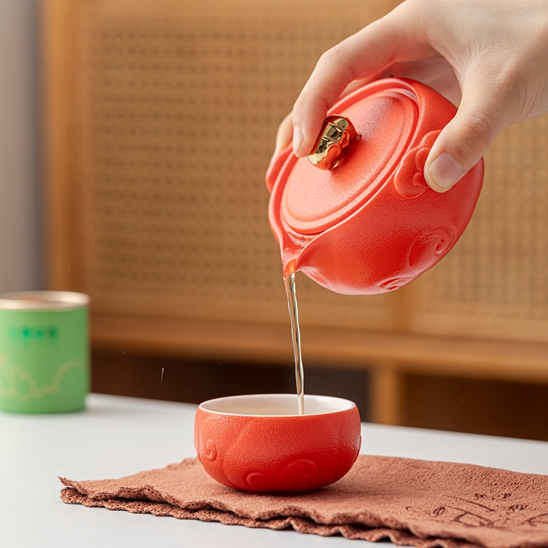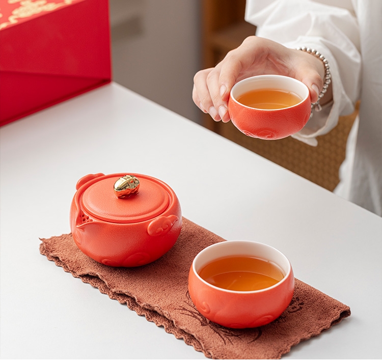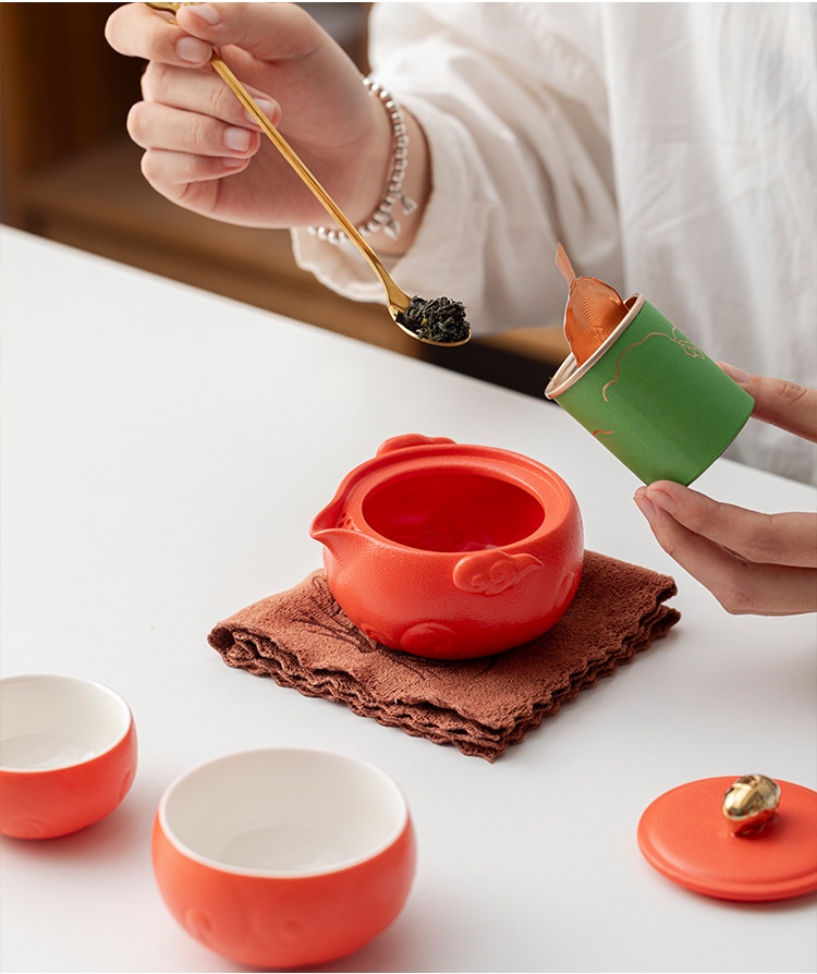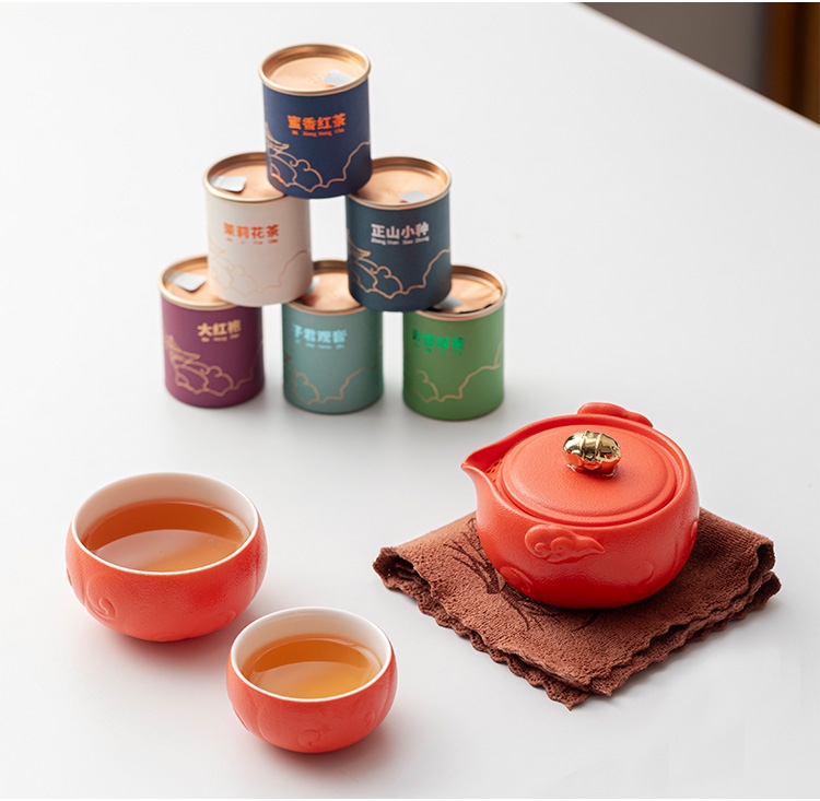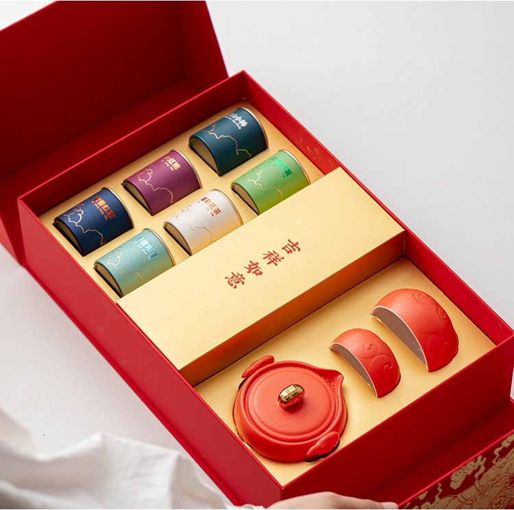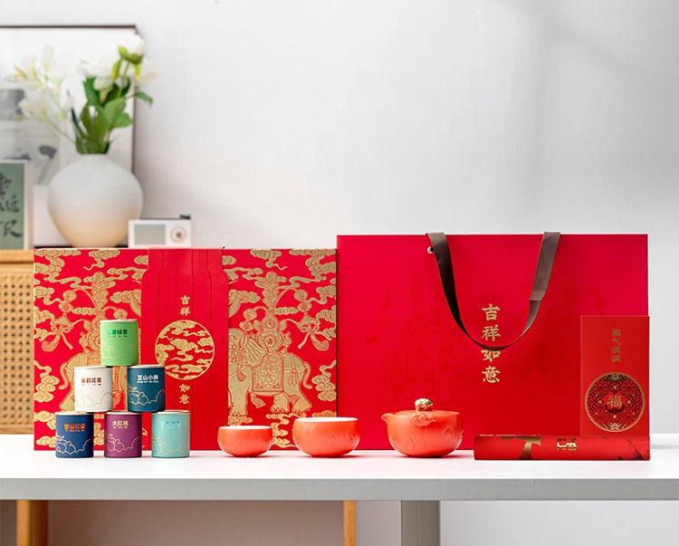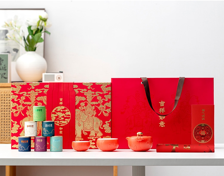 配置:吉象茶壶*1、客杯*1、主人杯*1、对联*1、红包*6、小罐茶*6(赠:大红袍、子君观音、云雾绿茶、正山小种、茉莉花茶、蜜香红茶各一罐)、浮雕烫金礼盒、礼袋