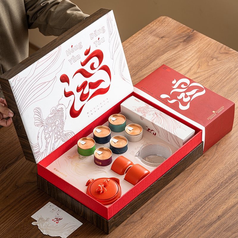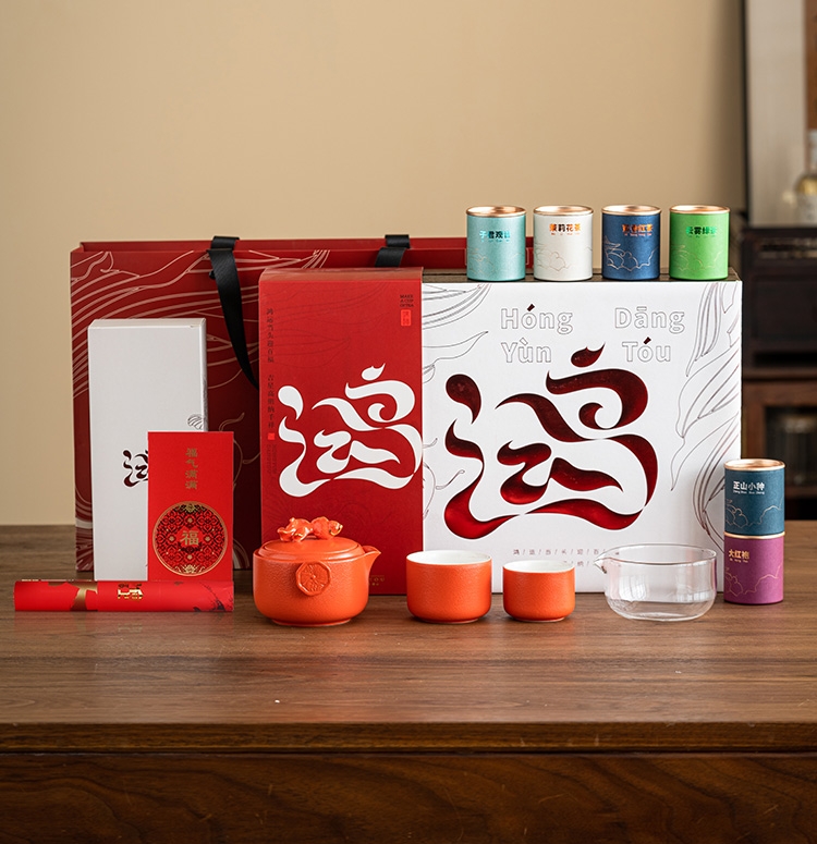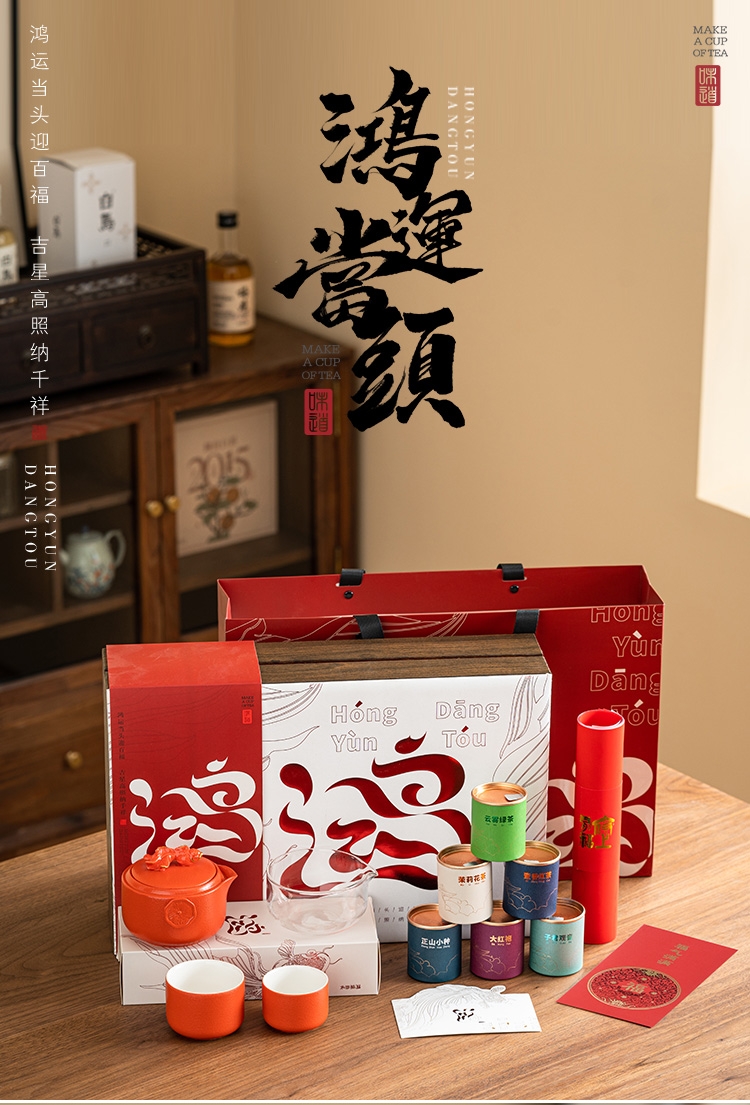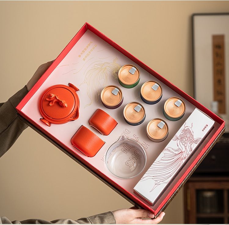 配置清单:锦鲤茶壶*1、主人杯*1、客杯*1、公道杯*1 、小罐装茶*6罐(赠:大红袍、子君观音、云雾绿茶、正山小种、茉莉花茶、蜜香红茶各一罐)、对联*1、红包*6、设计理念卡片*1、精致木纹礼盒、礼袋