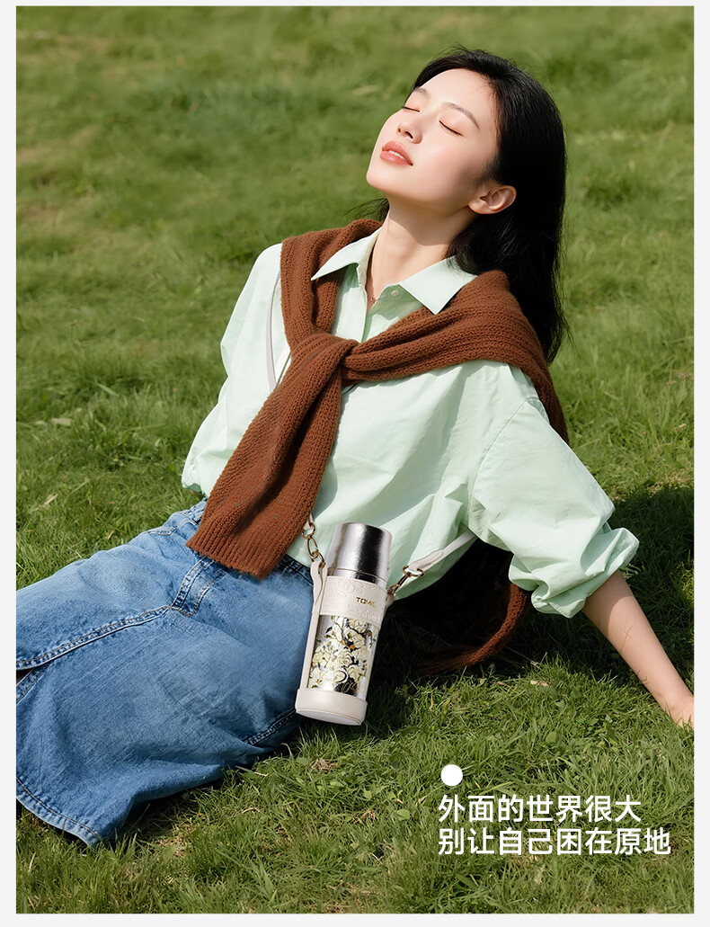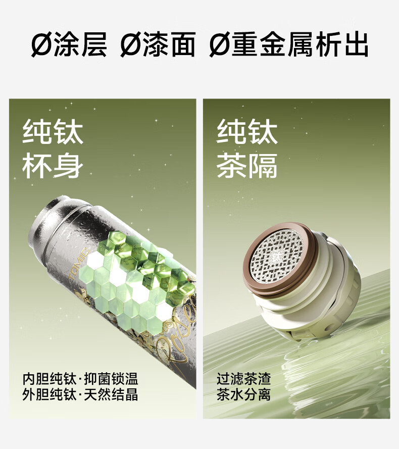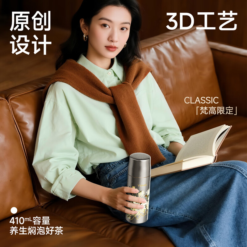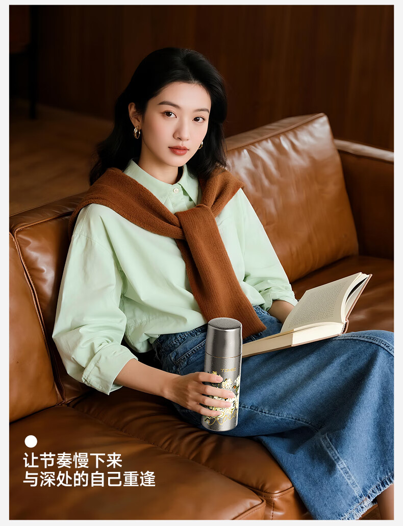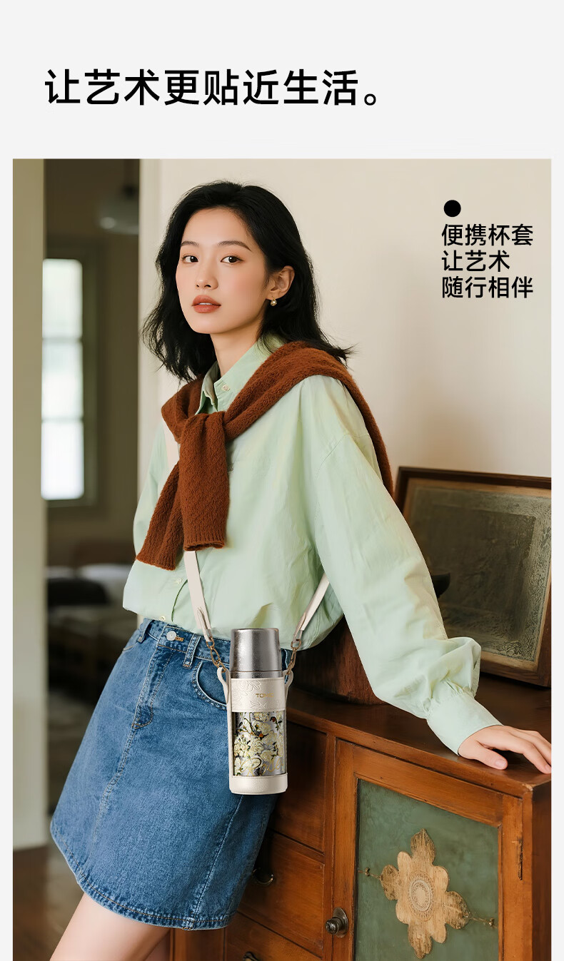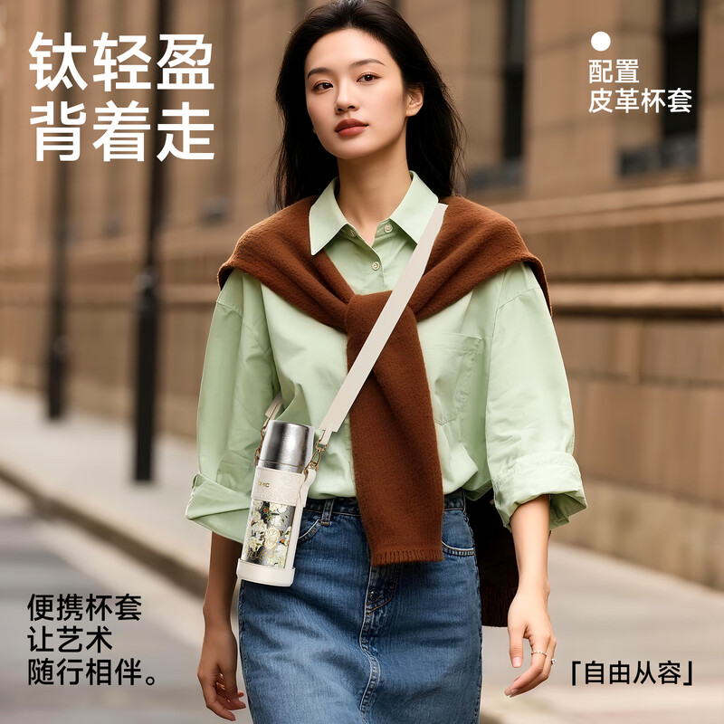 时尚压花手拎杯套;纯钛茶隔,轻松过滤;5D纳米鎏金真空技术