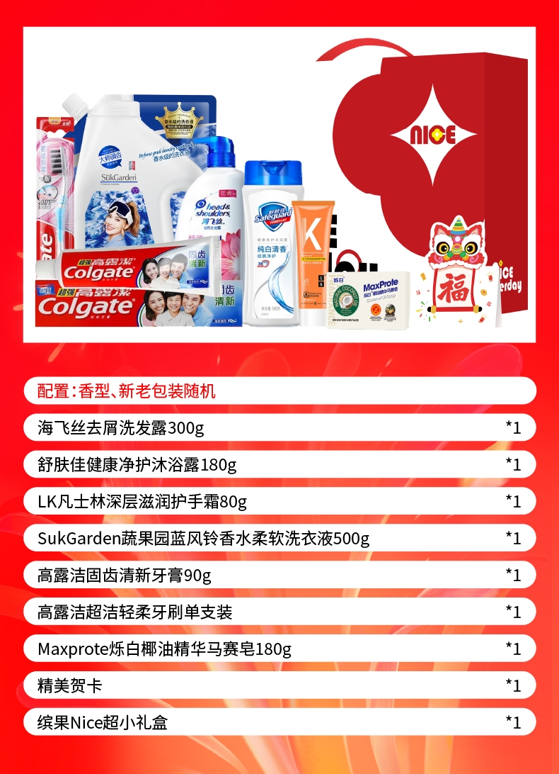 配置清单:海飞丝去屑洗发露300g*1 舒肤佳健康净护沐浴露180g*1 LK 凡士林深层滋润护手霜80g*1 SukGarden蔬果园蓝风铃香水柔软洗衣液(持久留香)500g*1 高露洁固齿清新牙膏90g*1 高露洁超洁轻柔牙刷单支装*1 Maxprote烁白椰油精华马赛皂180g*1 精美贺卡*1(量大可定制) 缤果Nice超小礼盒ZS176*1