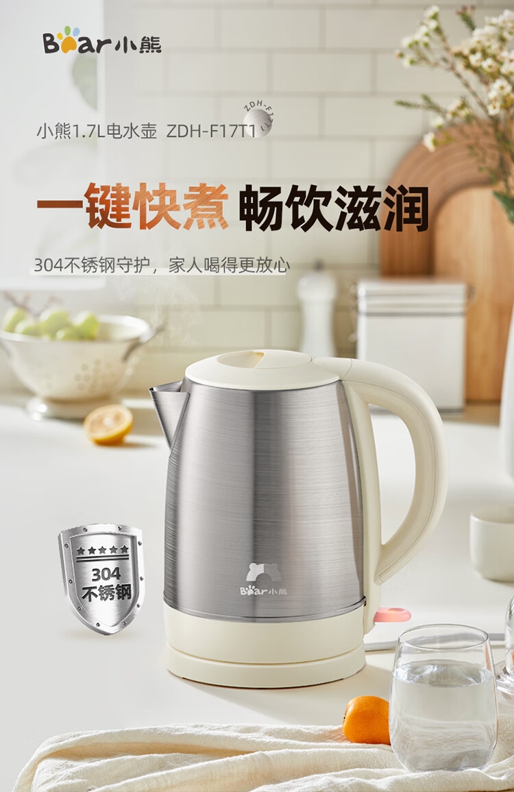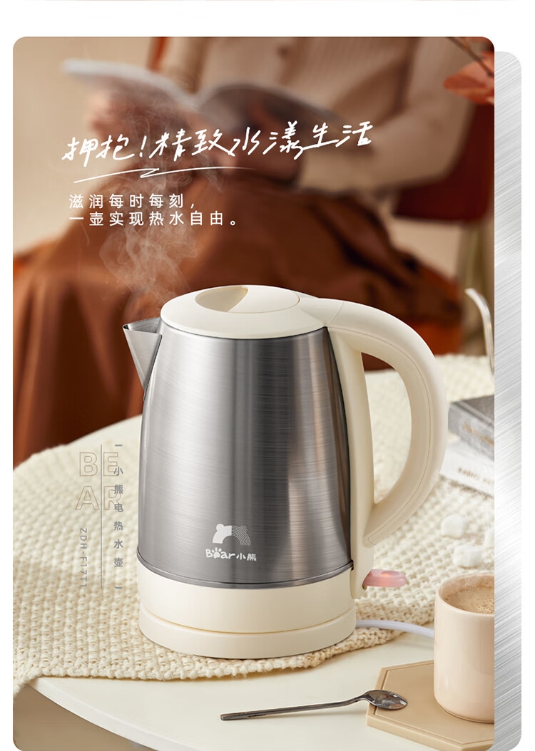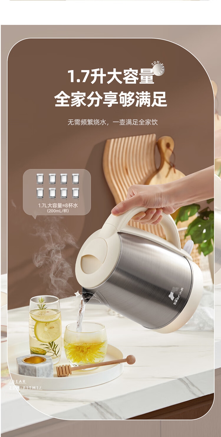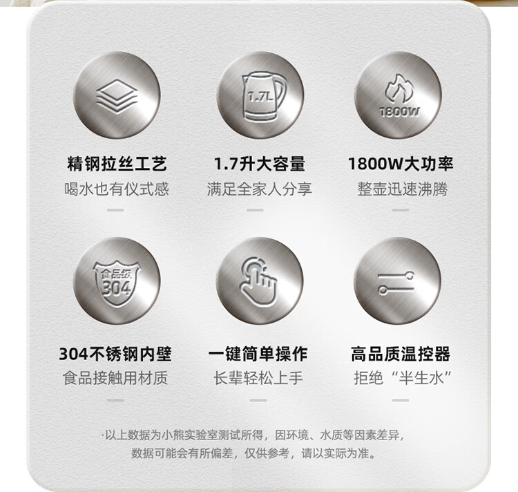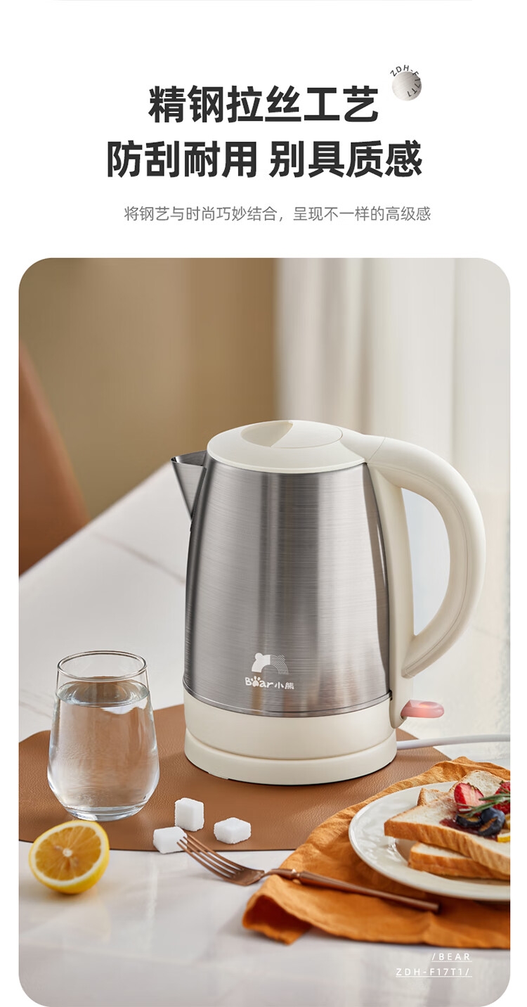 精钢拉丝工艺,喝水有仪式感;1.7 升大容量,满足全家人分享 ;1800W 大功率,整壶迅速沸腾