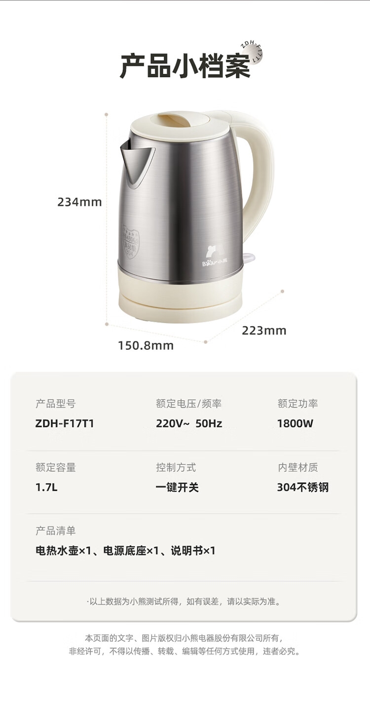 配置清单:电热水壶:1、电源底座:1、说明书:1