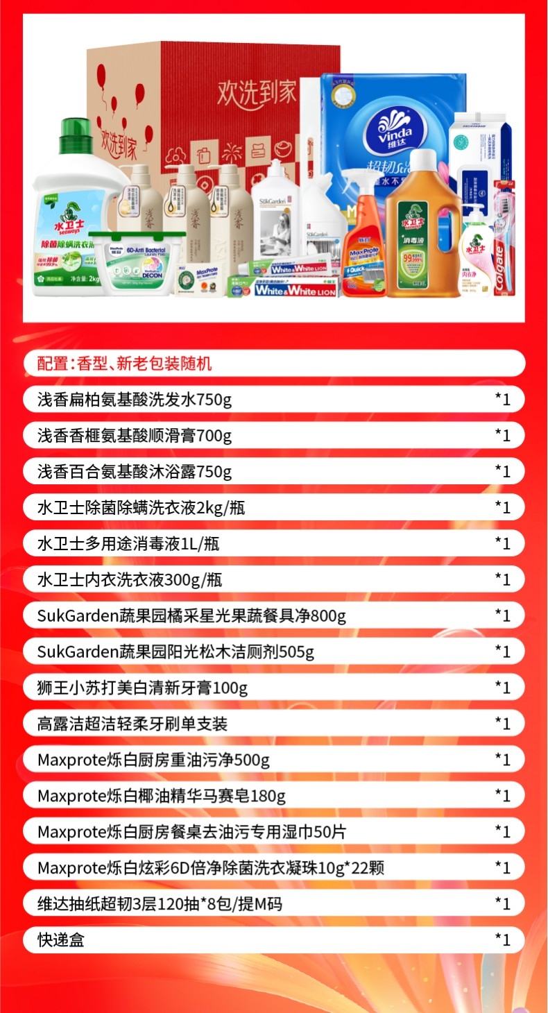 配置清单:浅香扁柏氨基酸洗发水750g*1 浅香香榧氨基酸顺滑膏700g*1 浅香百合氨基酸沐浴露750g*1 水卫士除菌除螨洗衣液2kg/瓶*1 水卫士多用途消毒液1L/瓶(可衣物除菌)*1 水卫士内衣洗衣液300g/瓶*1 SukGarden蔬果园橘采星光果蔬餐具净800g*1 SukGarden蔬果园阳光松木洁厕剂(强效去垢型)505g*1 狮王(Lion)小苏打美白清新牙膏100g*1 高露洁超洁轻柔牙刷单支装*1 Maxprote烁白厨房重油污净500g*1 Maxprote烁白椰油精华马赛皂180g*1 Maxprote烁白厨房餐桌去油污专用湿巾50片*1 Maxprote烁白炫彩6D倍净除菌洗衣凝珠10g*22颗*1 维达(Vinda)抽纸 超韧3层120抽*8包/提M码*1提 快递盒*1