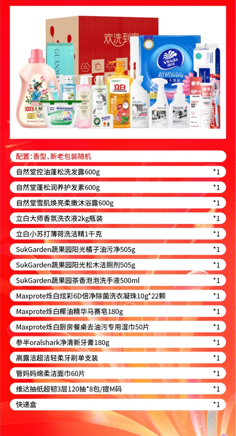 配置清单:自然堂控油蓬松洗发露600g*1 自然堂蓬松润养护发素600g*1 自然堂雪肌焕亮柔嫩沐浴露600g*1 立白大师香氛洗衣液2kg瓶装*1 立白小苏打薄荷洗洁精1千克*1 SukGarden蔬果园阳光橘子油污净(强效洁净型)505g*1 SukGarden蔬果园阳光松木洁厕剂(强效去垢型)500g*1 SukGarden蔬果园茶香泡泡洗手液 500ml*1 Maxprote烁白炫彩6D倍净除菌洗衣凝珠10g*22颗*1 Maxprote烁白椰油精华马赛皂180g*1 Maxprote烁白厨房餐桌去油污专用湿巾50片*1 参半oralshark净清新牙膏180g*1 高露洁超洁轻柔牙刷单支装*1 管妈妈绵柔洁面巾60片*1 维达(Vinda)抽纸 超韧3层120抽*8包/提M码*1提 快递盒*1