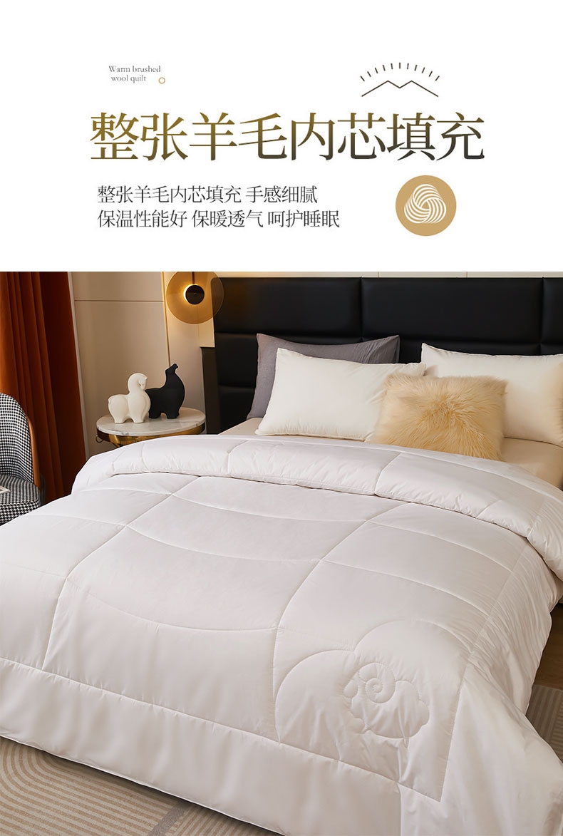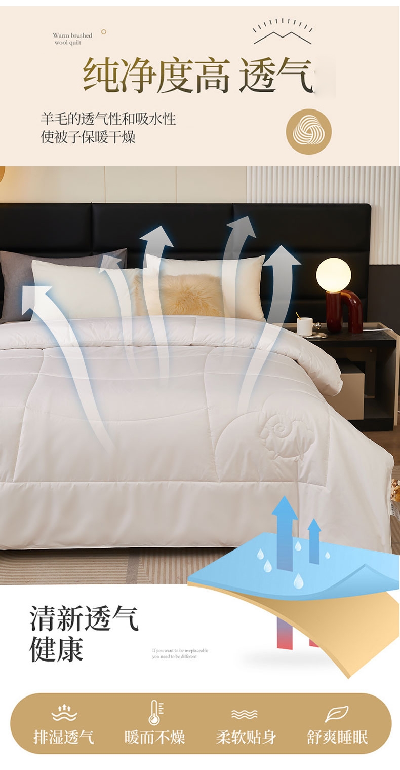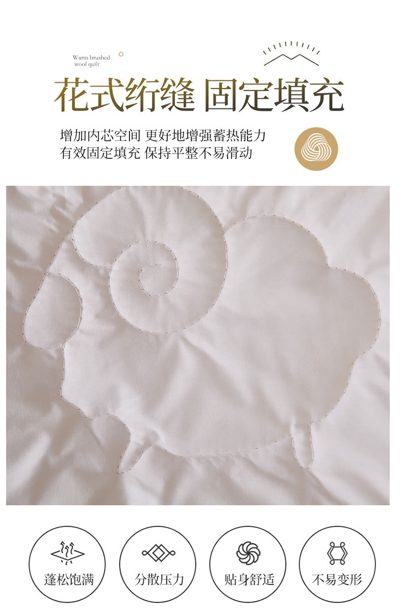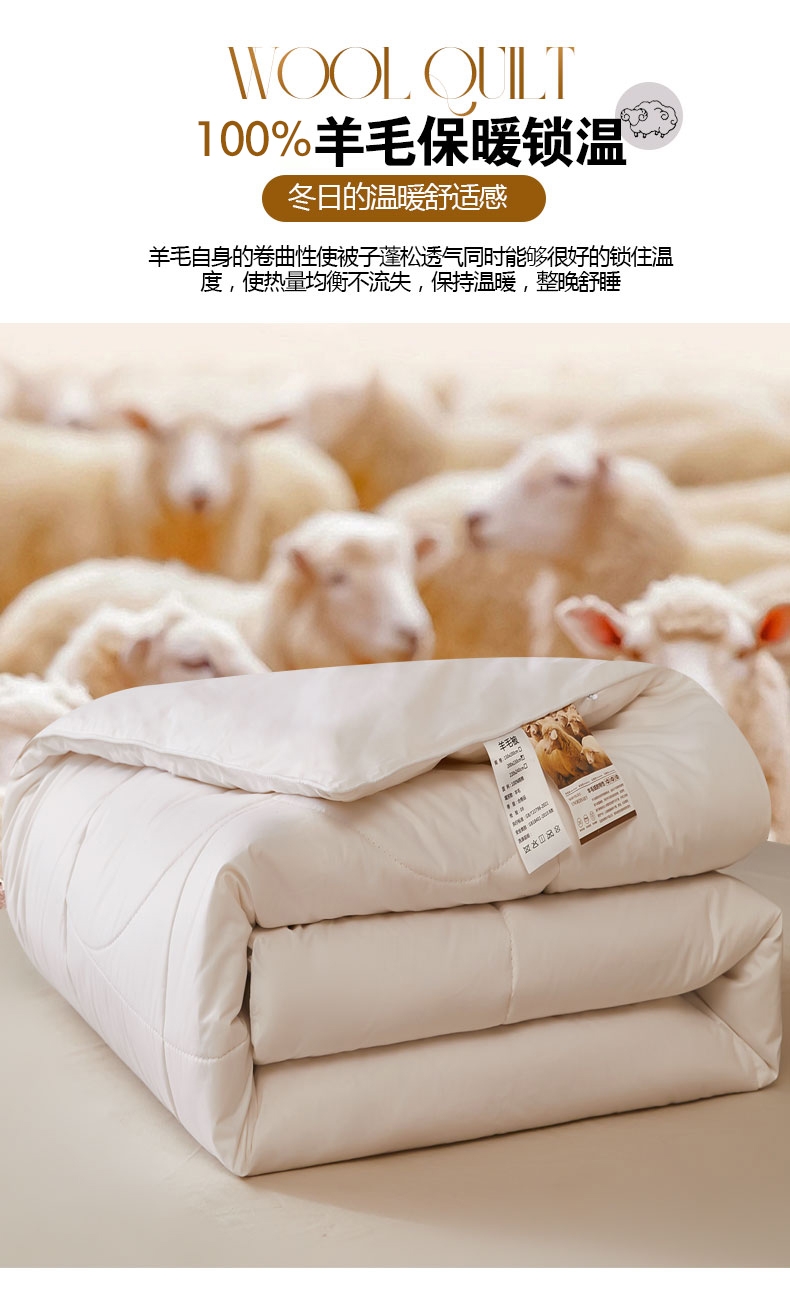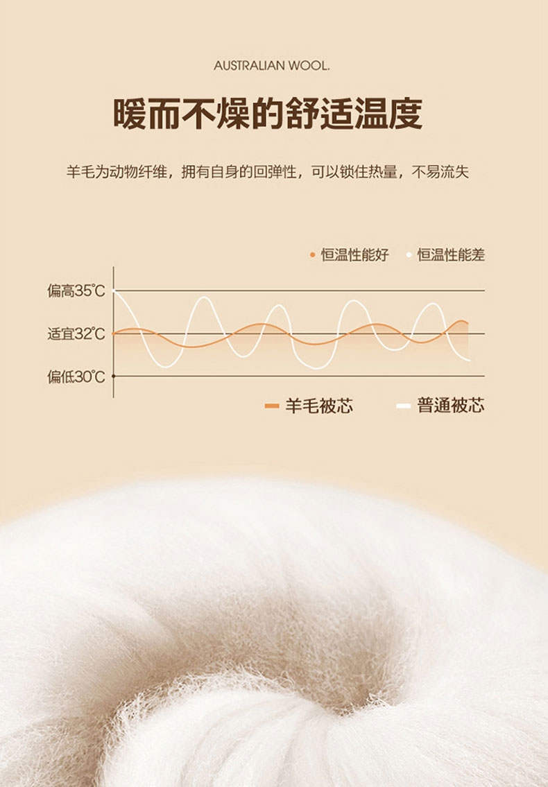 填充物精选澳大利亚羊毛填充;毛质柔软细腻,吸湿能力强,恒温保暖;柔软度.强度.耐用性和外观持久性方面均较为出色