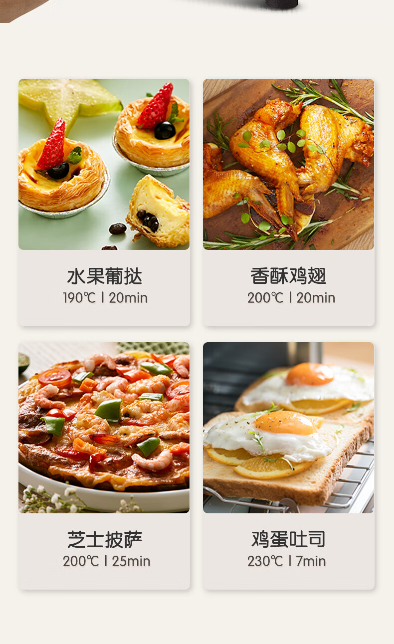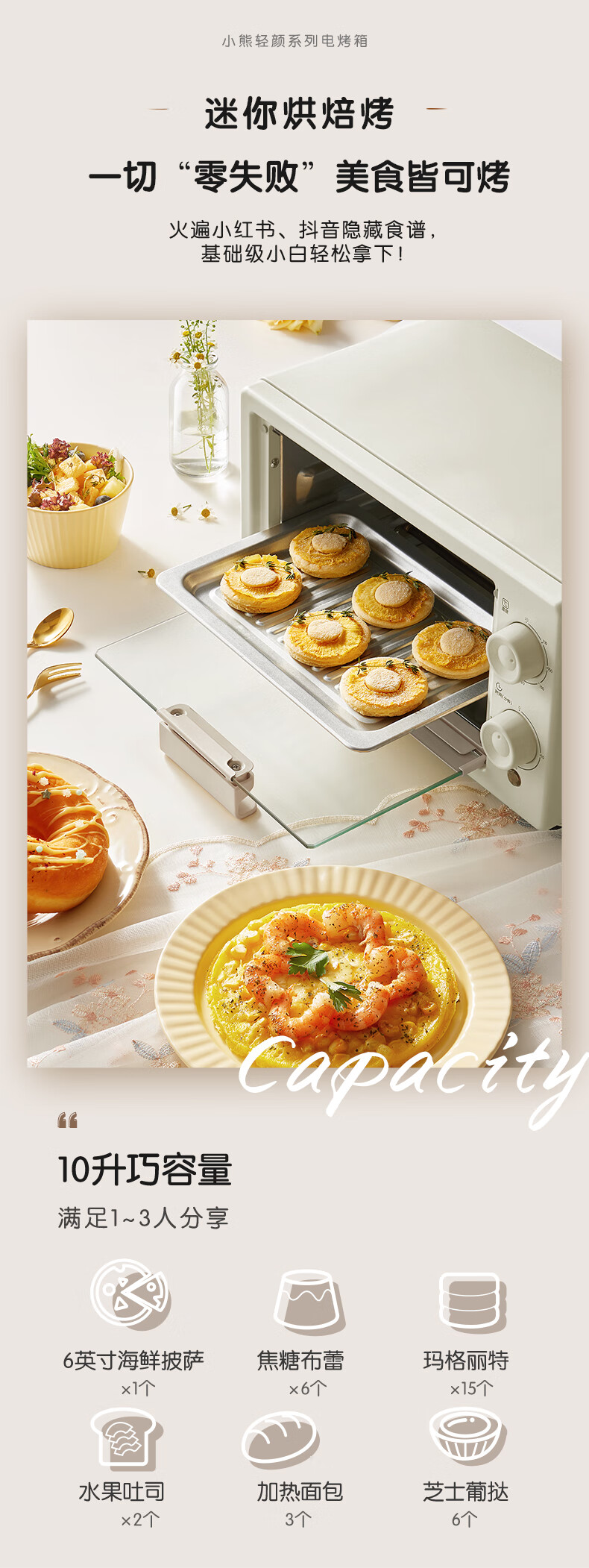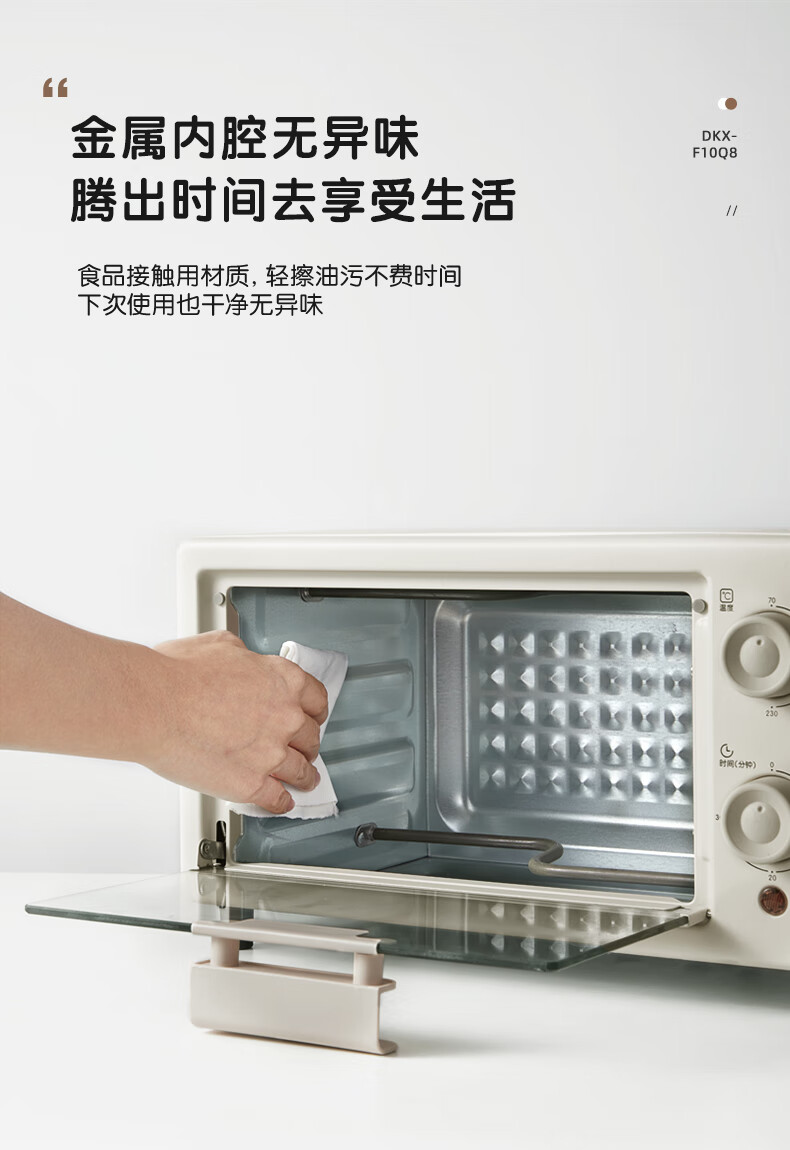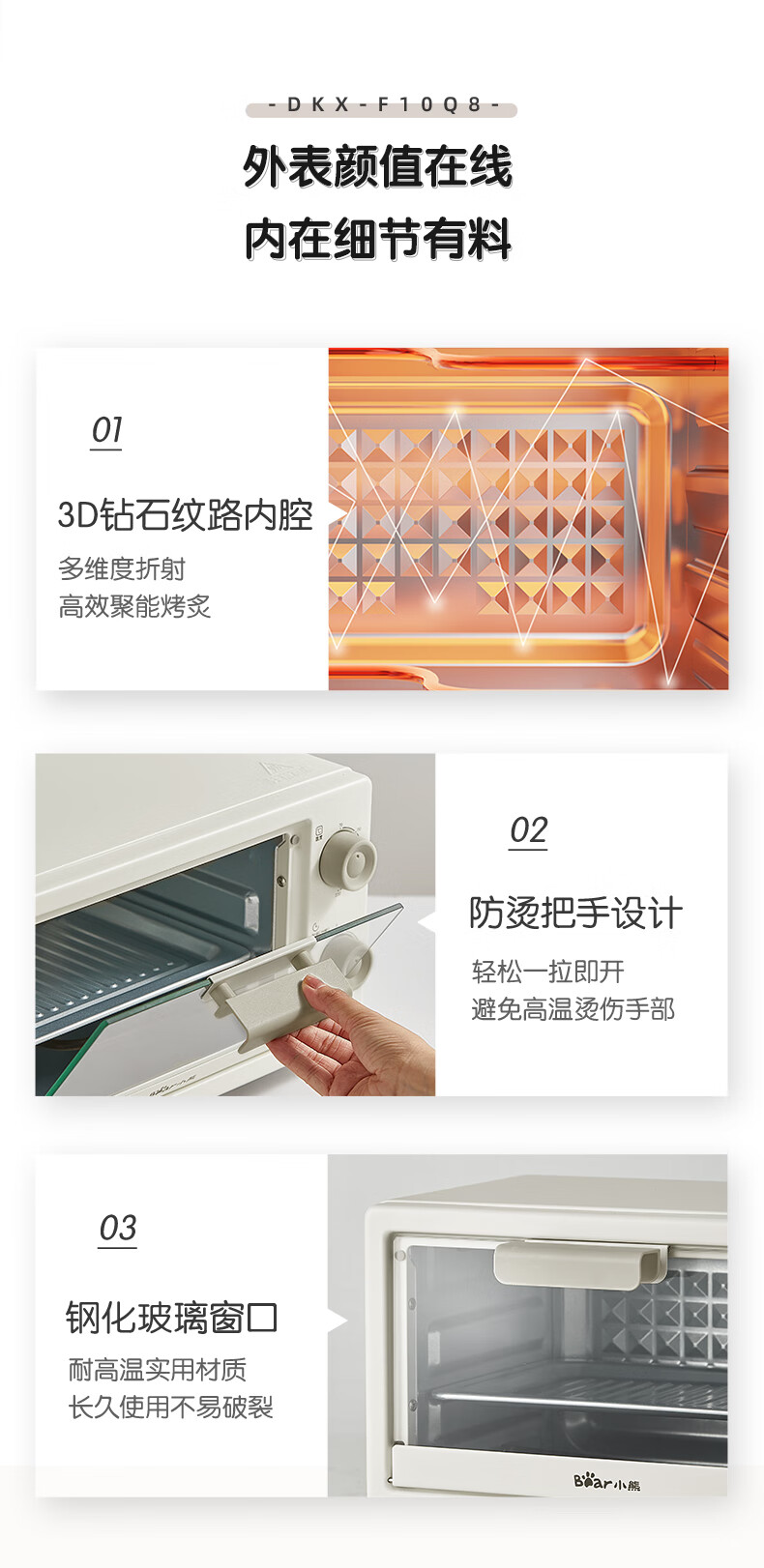 10L小巧容量设计,易收纳;70-230°C调温,0-30min定时;菱形钻石纹内腔,烤炙更均匀