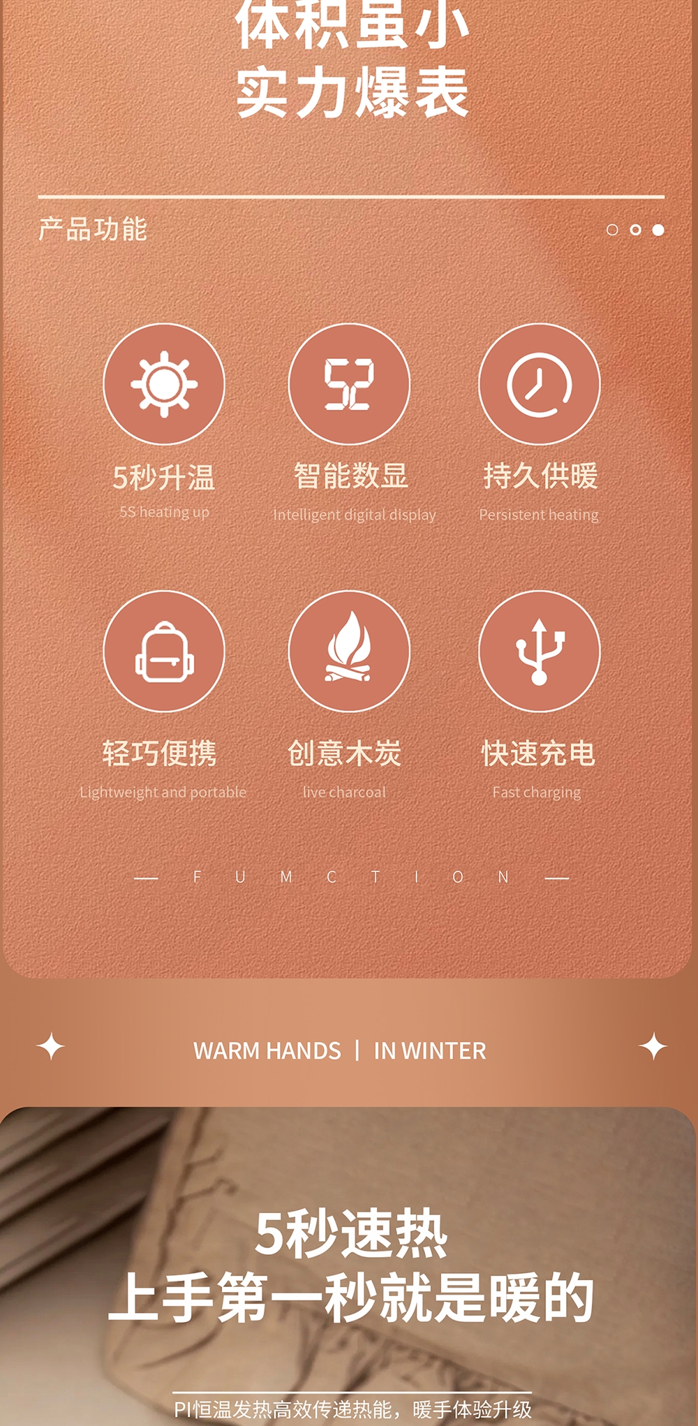 三档温度调节 满足多种需求;智能数显 实时电量;360度无死角发热