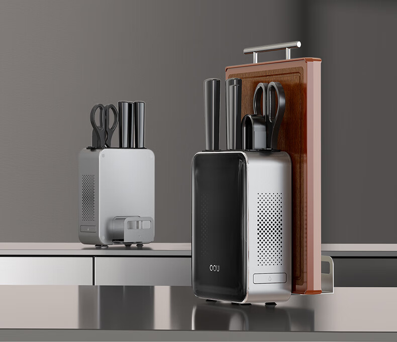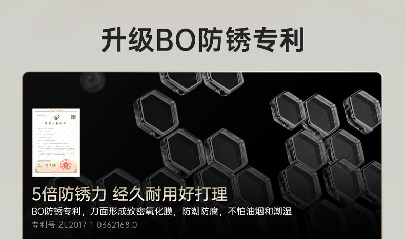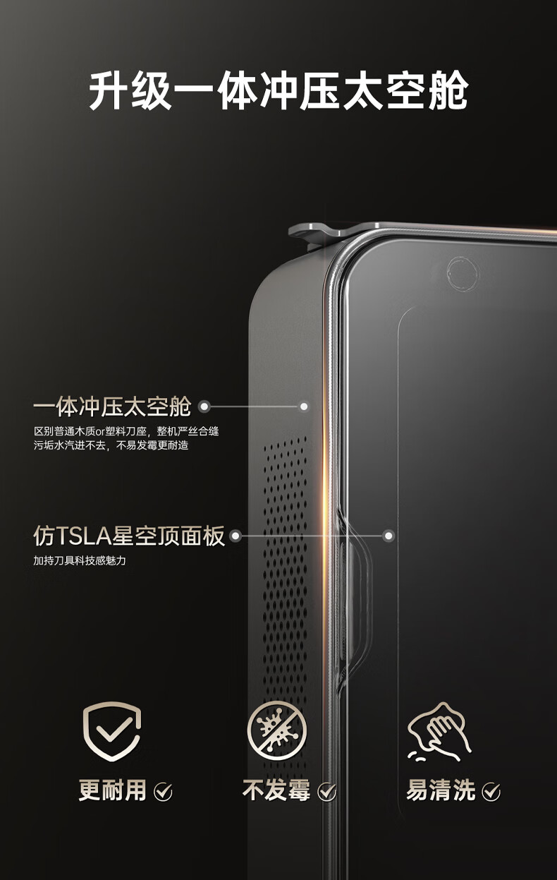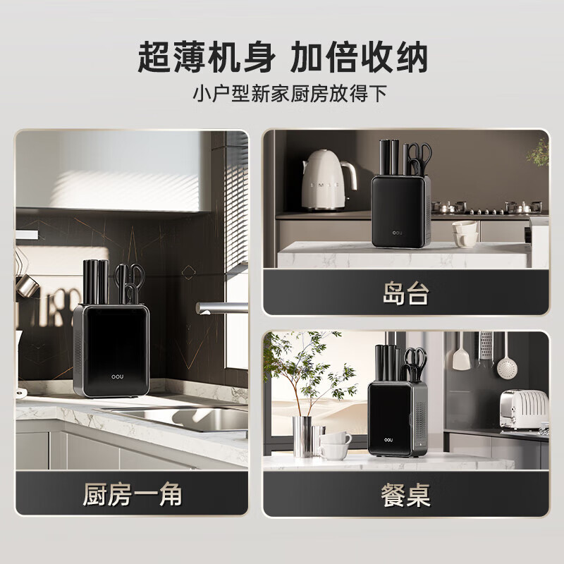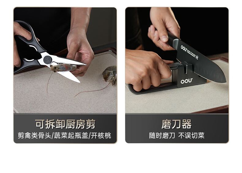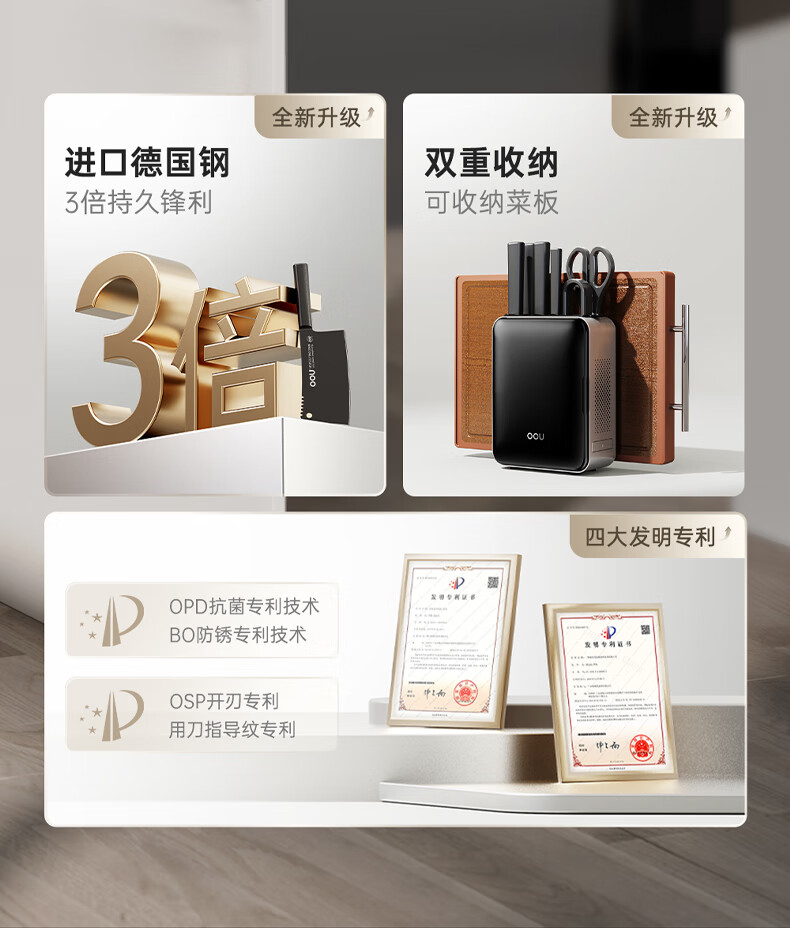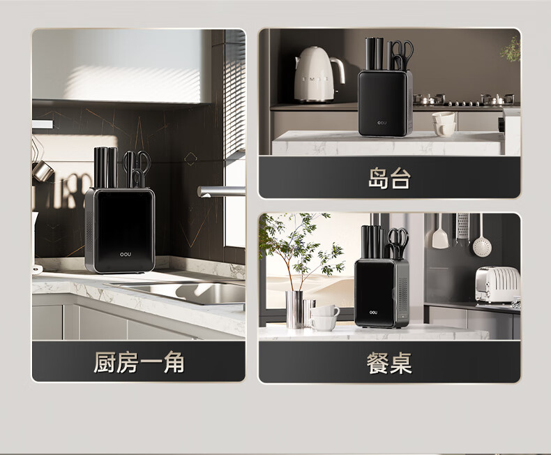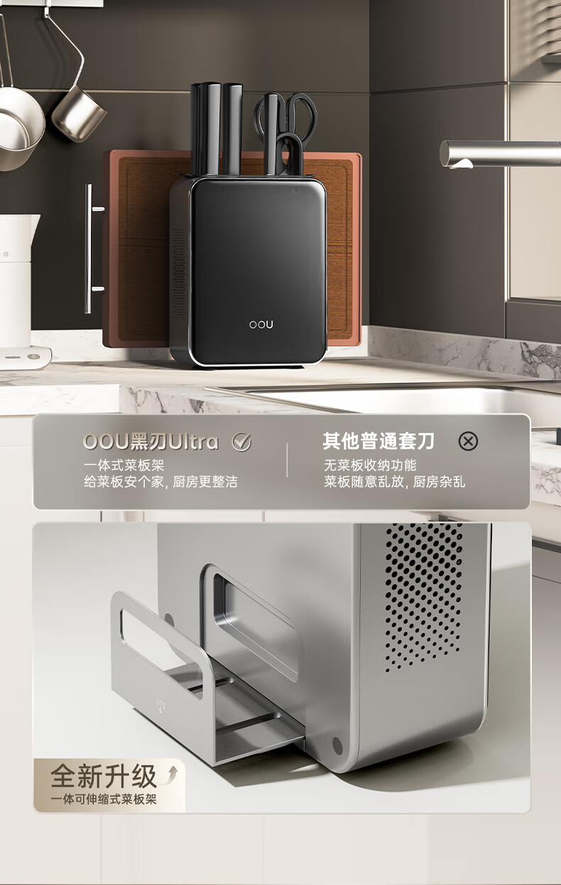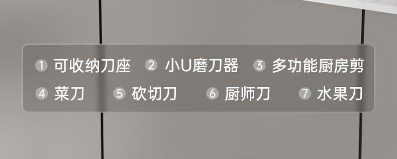 刀刃硬而不脆,持久锋利;刀座金属材质,不发霉不开裂;底部带隐藏式菜板架,拿取方便,收纳更整齐