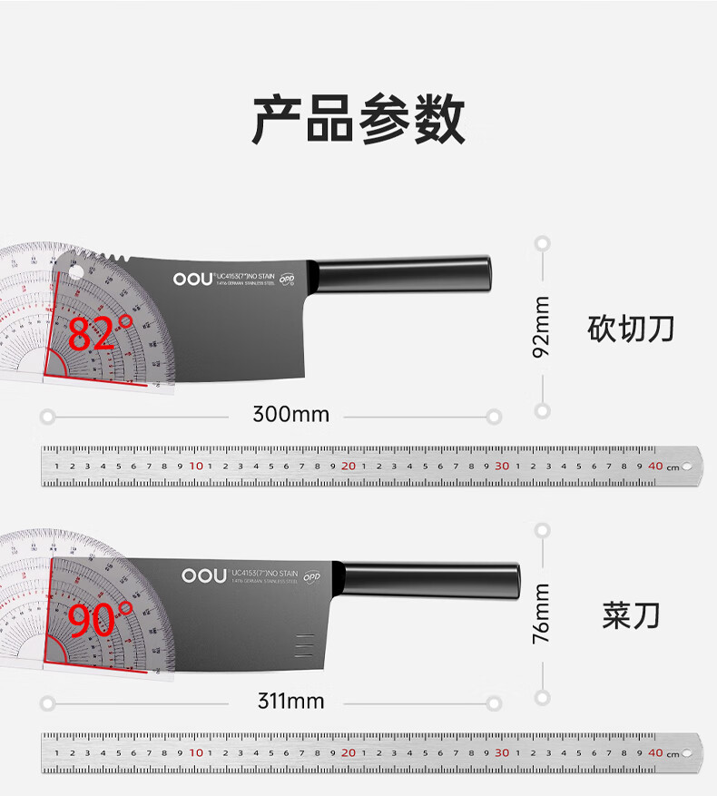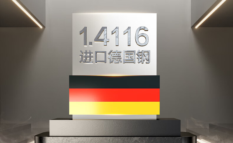 材质:刀具主材:刀片 1.4116+430手柄 砍骨刀:马氏体不锈钢 50Cr15MoV 磨刀器:ABS +钨钢+ 陶瓷 剪刀:刀片 30Cr13+手柄 ABS 刀 座:镀锌板+ABS+PC+PP