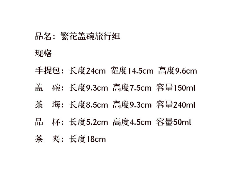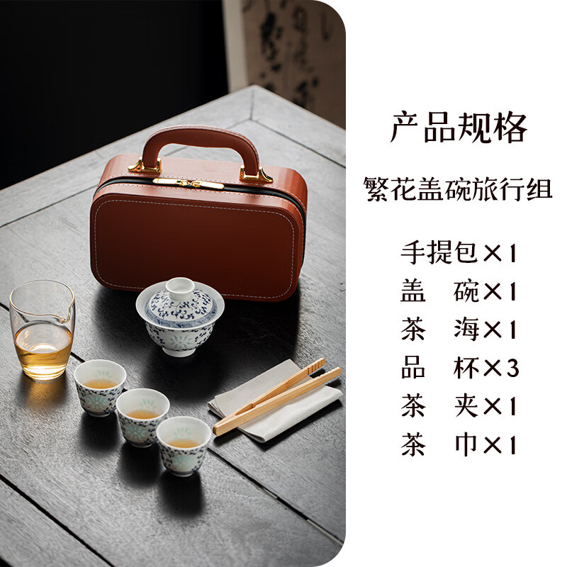 配置清单:1盖碗,1公道杯,3品茗杯,1茶夹,1茶巾,旅行包