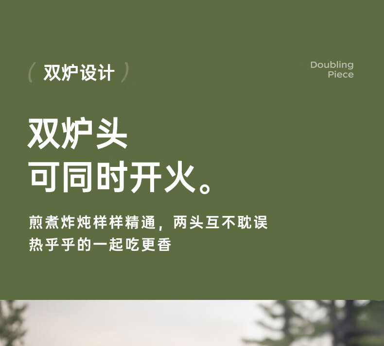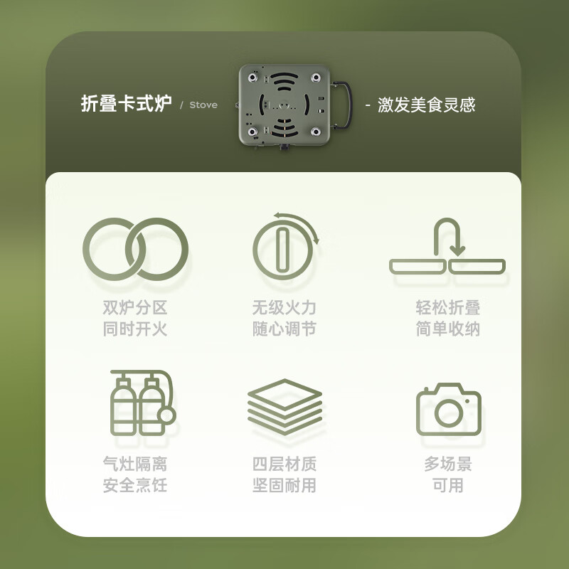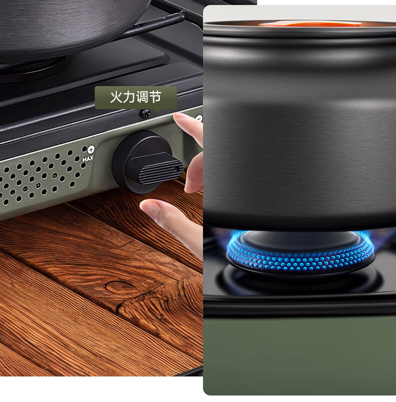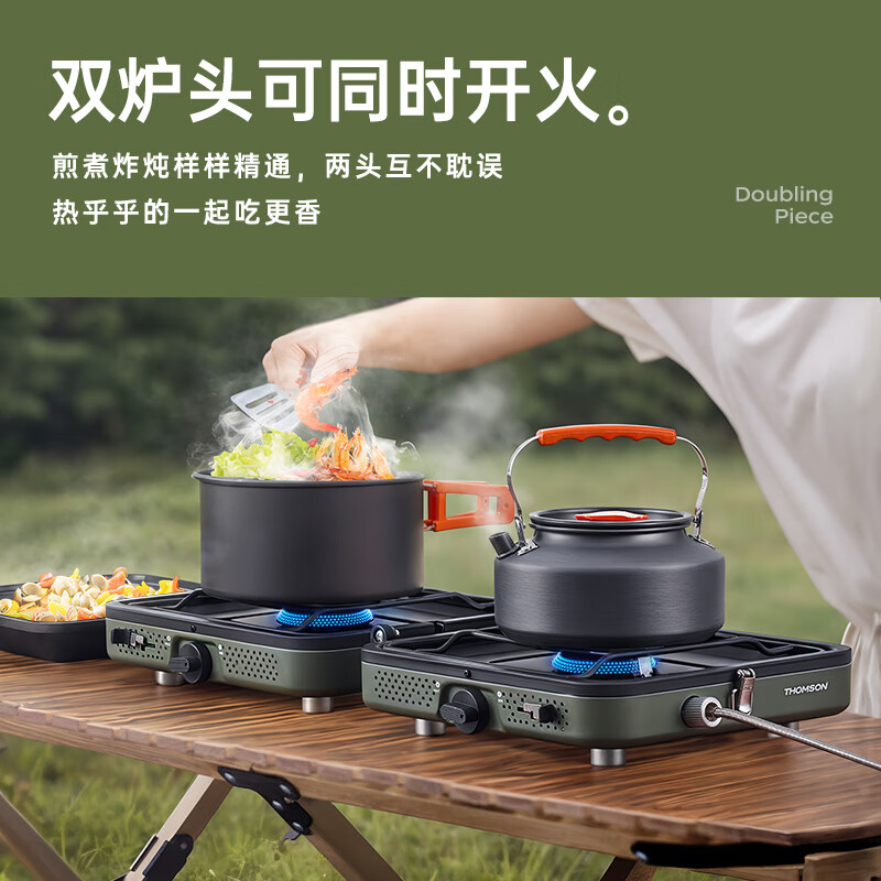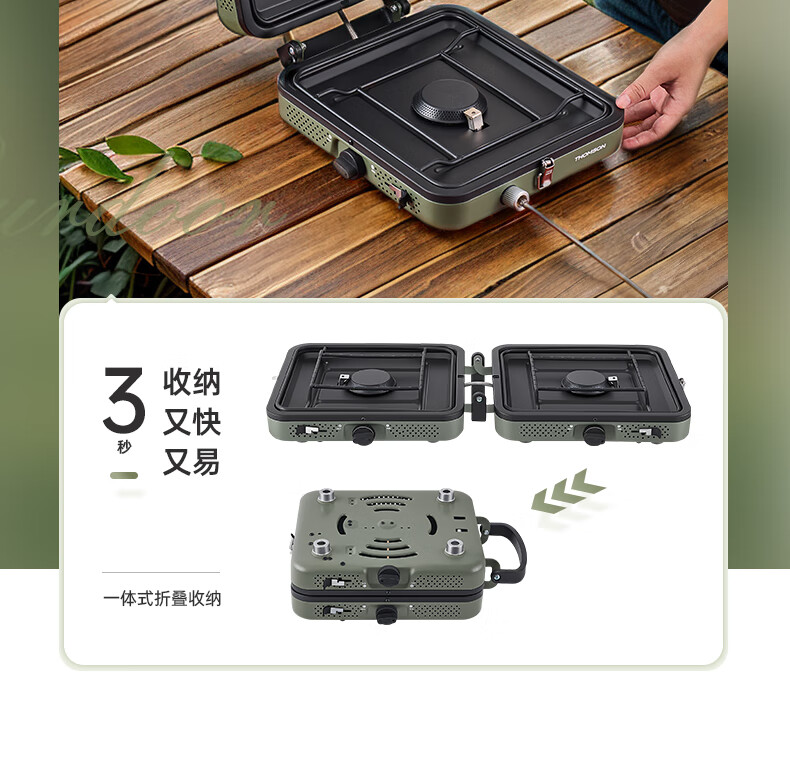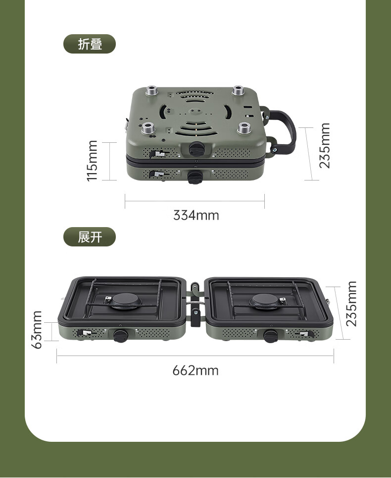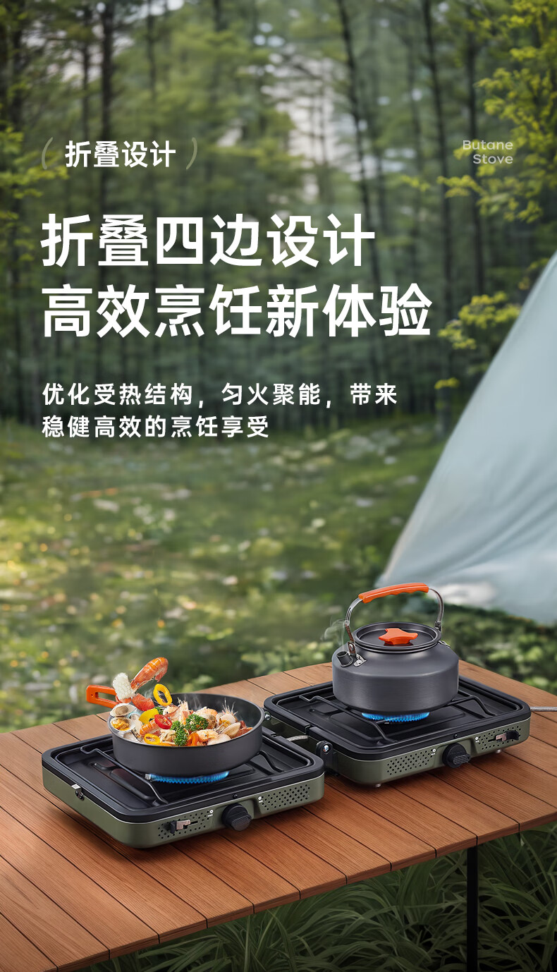 轻松携带,露营便携新选择。;折叠四边设计,可折叠收纳。;双炉头设计,可同时开火