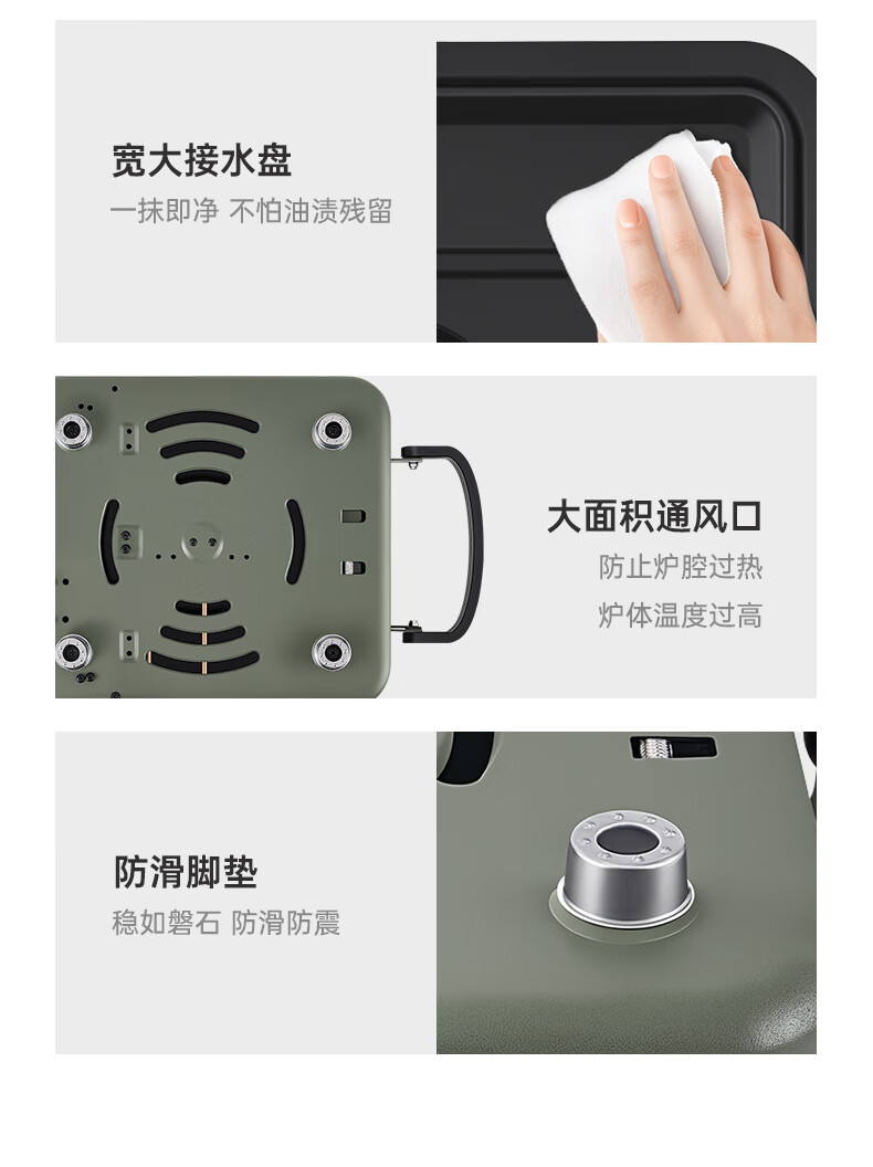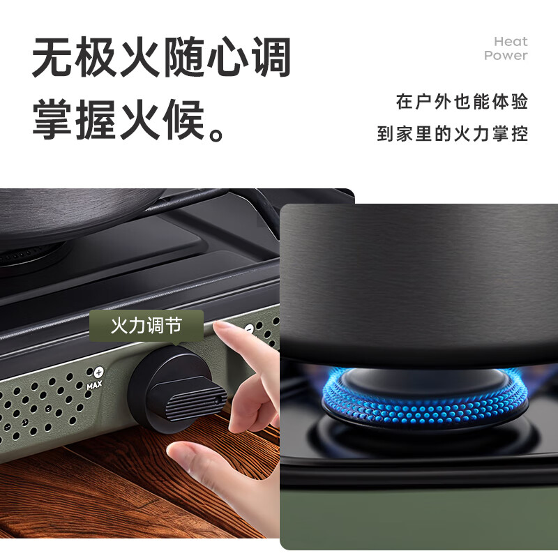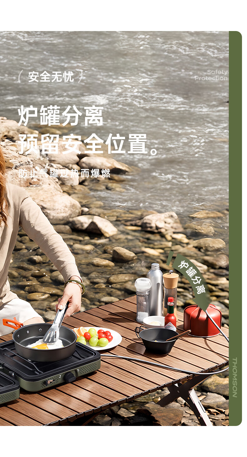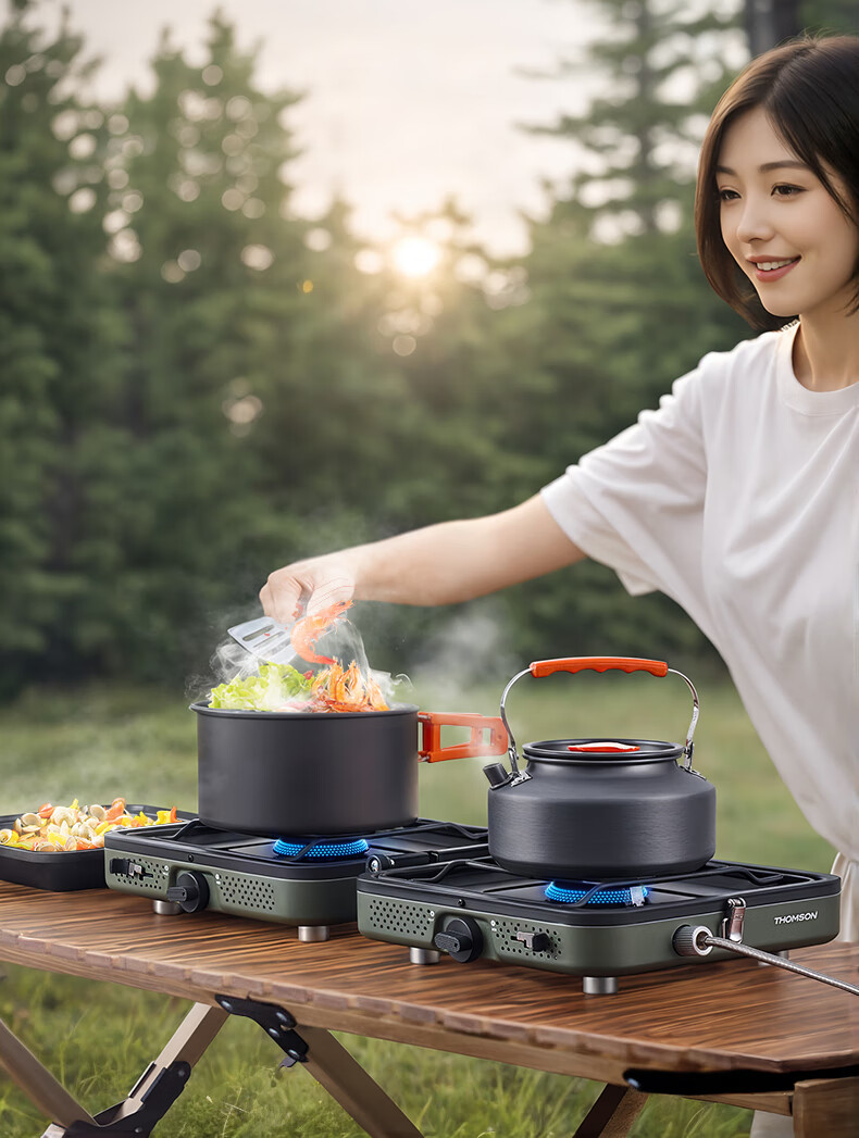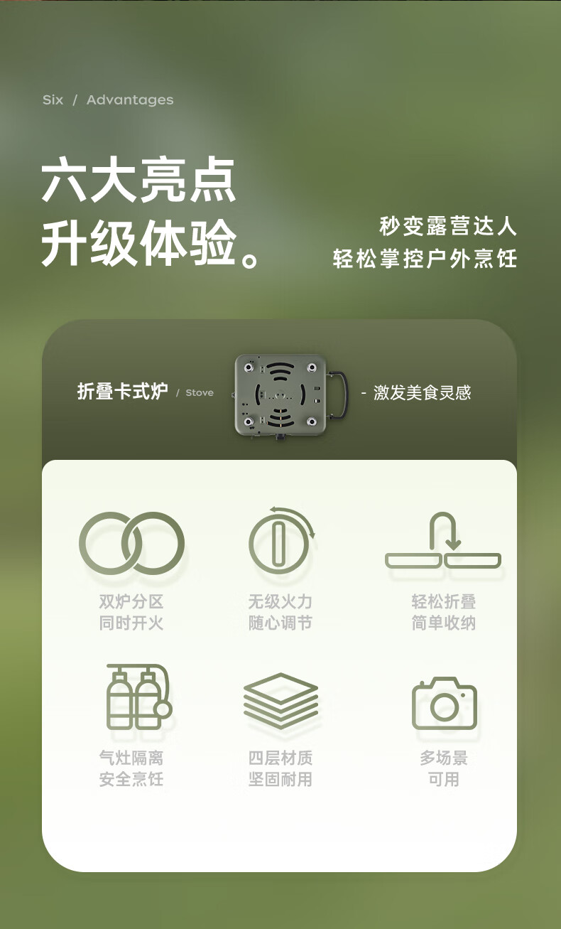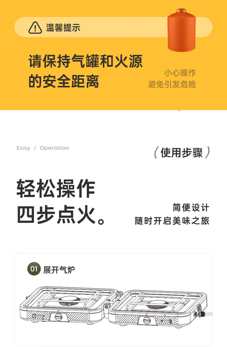 轻松携带,露营便携新选择。;折叠四边设计,可折叠收纳。;双炉头设计,可同时开火