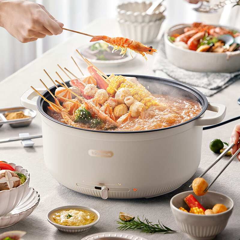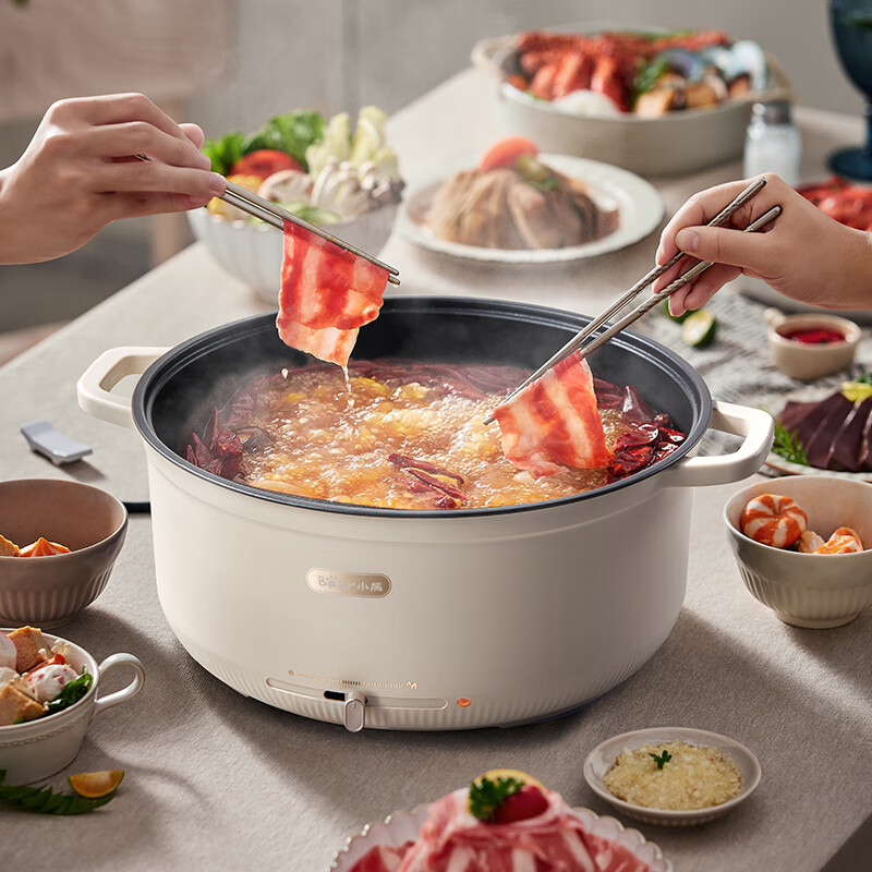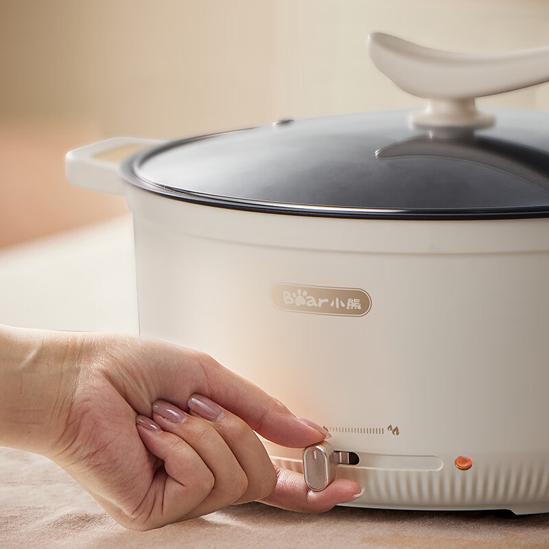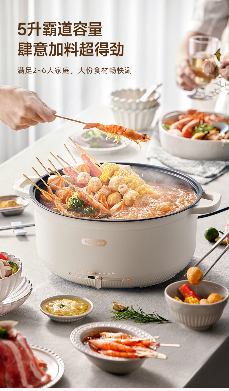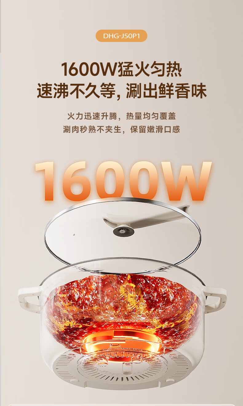 1600W大功率,火锅沸腾快;5L大容量,满足3-6人畅吃;无级拨杆控温,火候随心所调,涮煮不怕溢