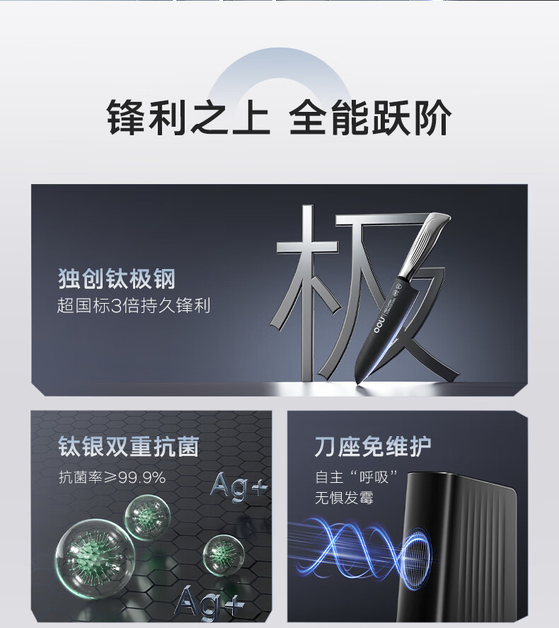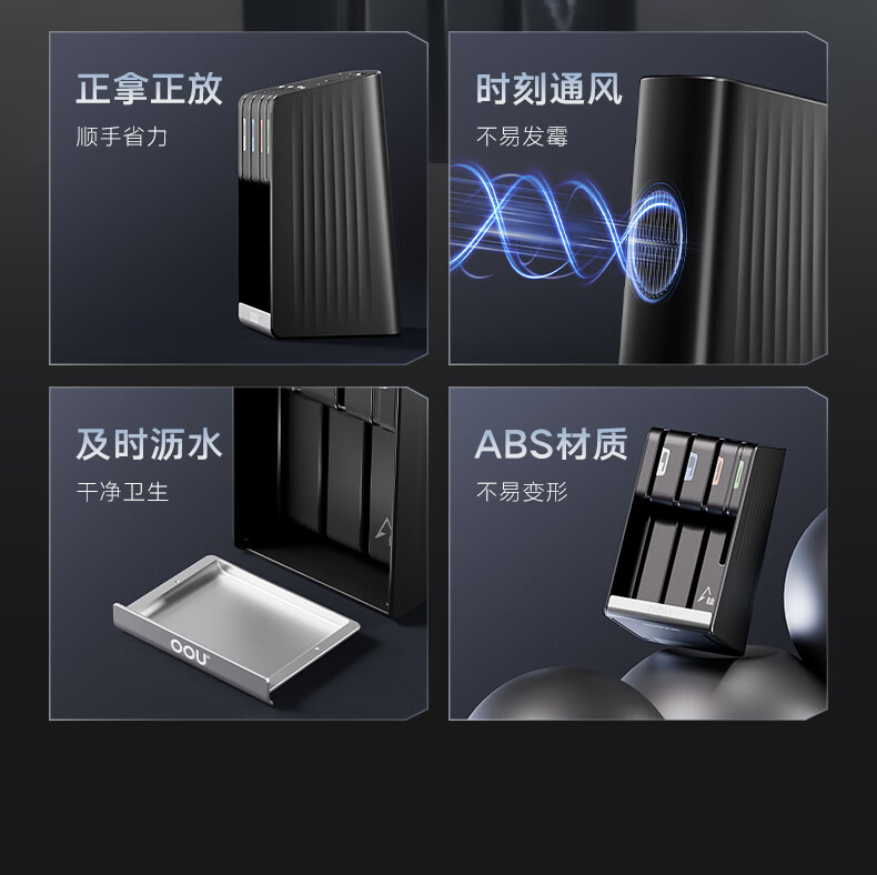 人体工学手柄;升级创新刀座,不易发霉;握感舒适,防滑耐磨