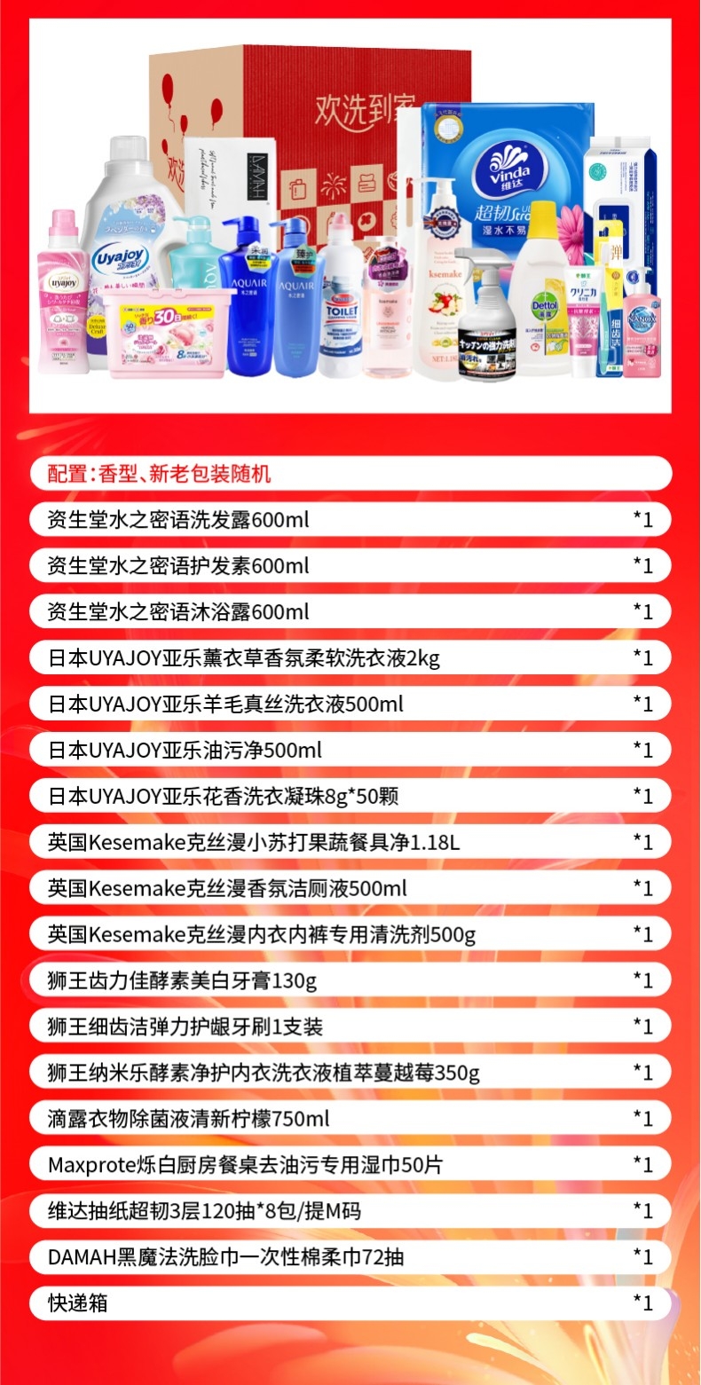 配置清单:资生堂水之密语洗发露600ml *1 资生堂水之密语护发素600ml*1 资生堂水之密语沐浴露600ml*1 UYAJOY亚乐薰衣草香氛柔软洗衣液2kg*1 UYAJOY亚乐羊毛真丝洗衣液500ml*1 UYAJOY亚乐油污净500ml*1 UYAJOY亚乐花香洗衣凝珠8g*50颗*1 英国进口Kesemake克丝漫小苏打果蔬餐具净1.18L*1 英国进口Kesemake克丝漫香氛洁厕液500ml*1 英国进口Kesemake克丝漫内衣内裤专用清洗剂500g*1 狮王(Lion)齿力佳酵素美白牙膏130g*1 狮王(Lion)细齿洁弹力护龈牙刷1支装*1 狮王(Lion)纳米乐酵素净护内衣洗衣液植萃蔓越莓350g*1 滴露衣物除菌液清新柠檬750ml*1 Maxprote烁白厨房餐桌去油污专用湿巾50片*1 维达(Vinda)抽纸 超韧3层120抽*8包/提M码*1提 DAMAH黑魔法洗脸巾一次性棉柔巾72抽*1 快递箱*1