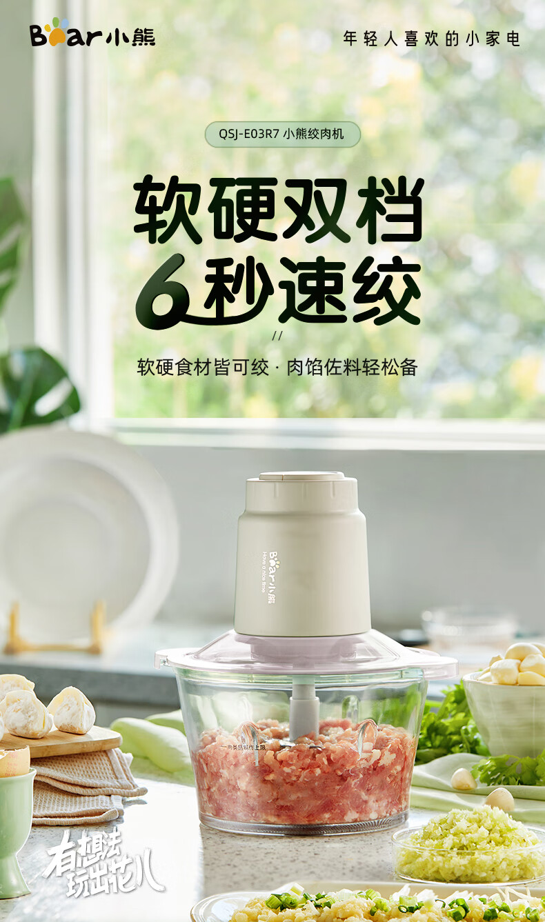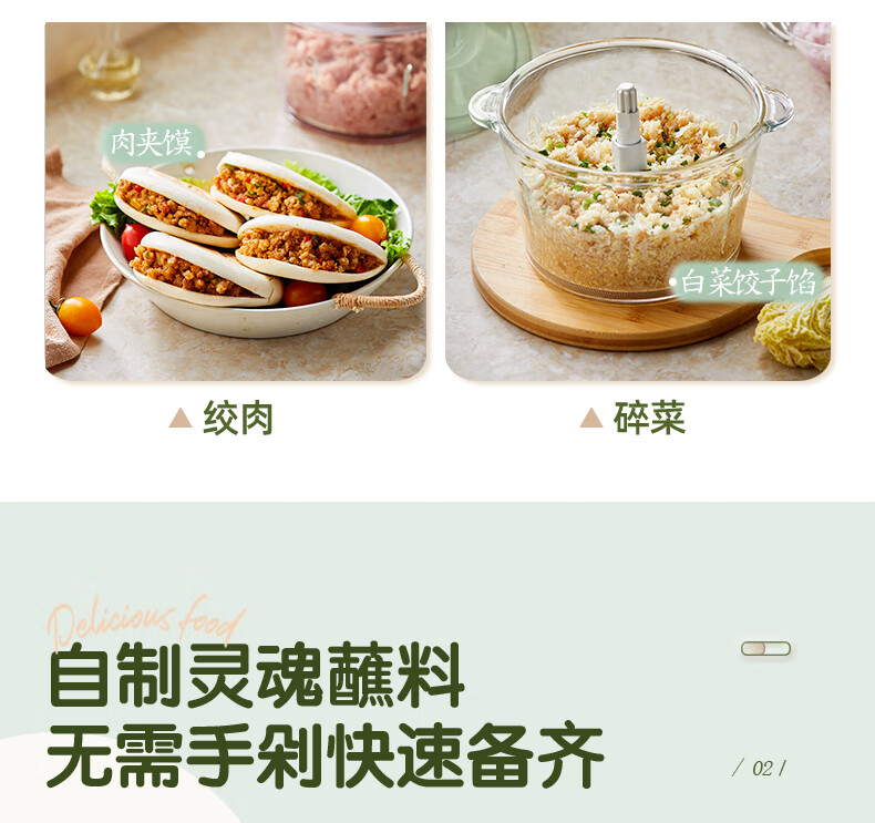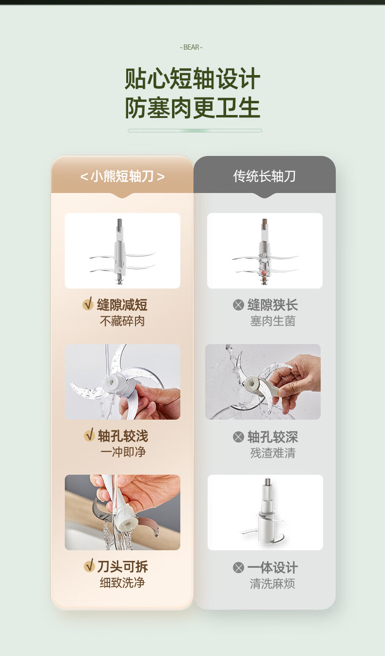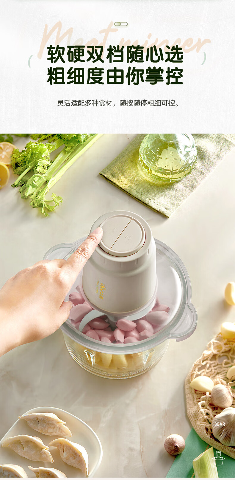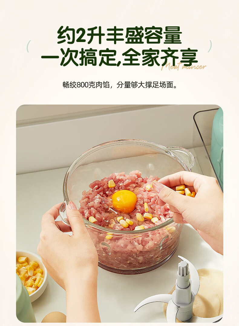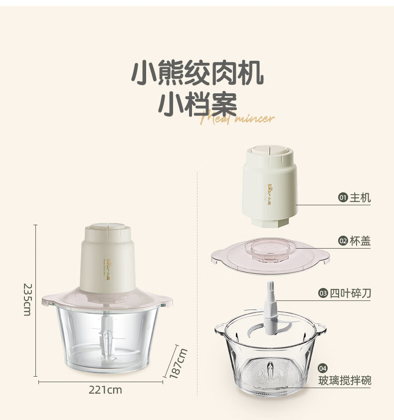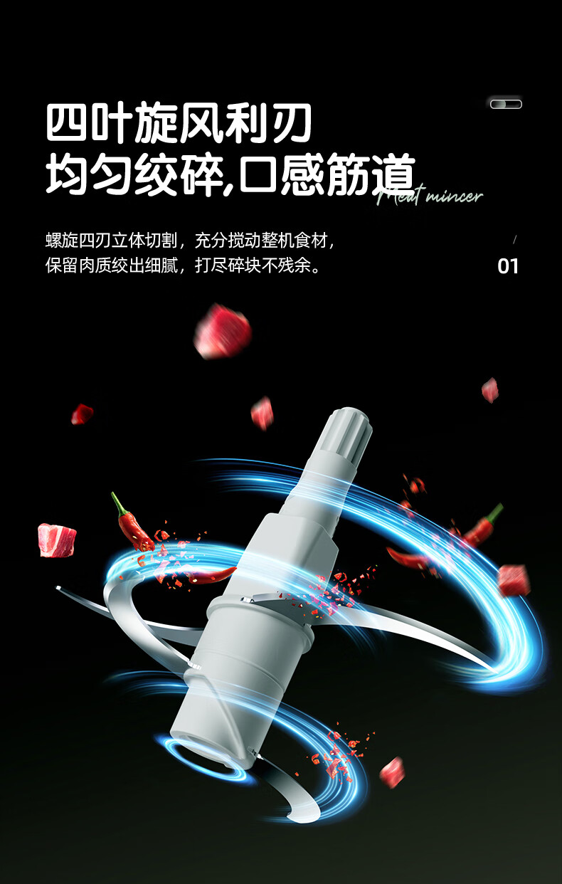 短轴四叶刀,易清洗不塞肉;300W整机大功率,耐用不易损;双档可选,软硬食材都兼顾