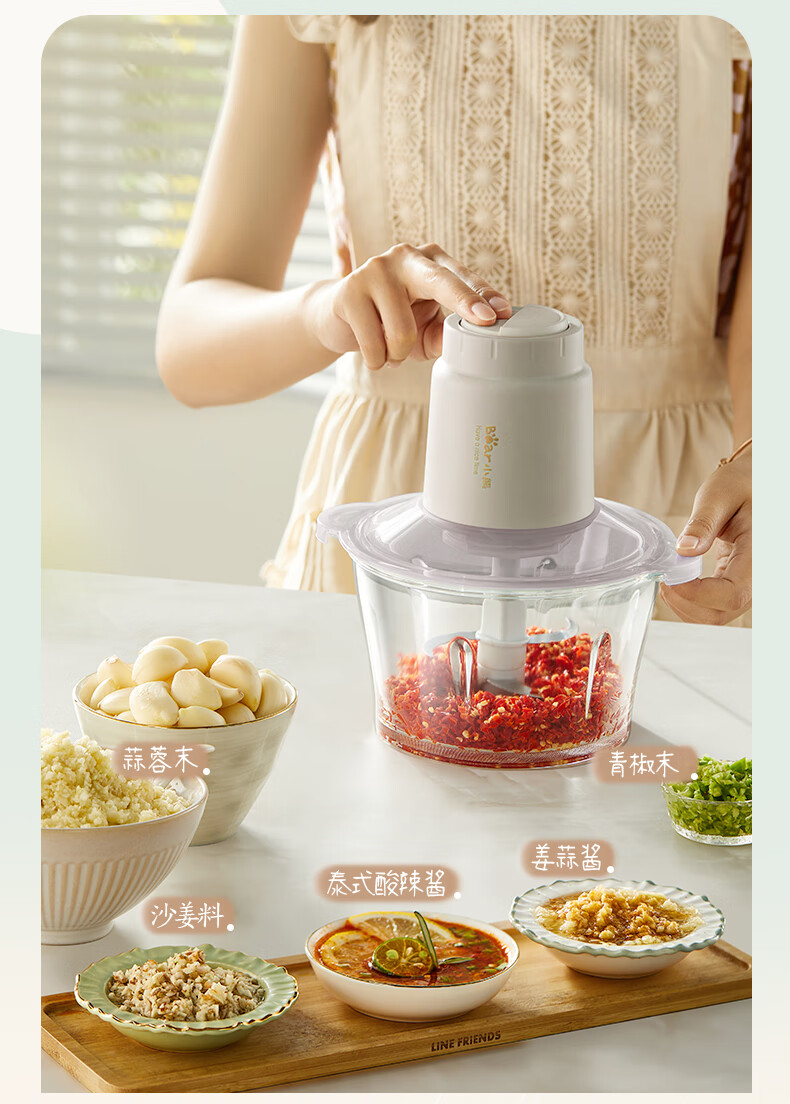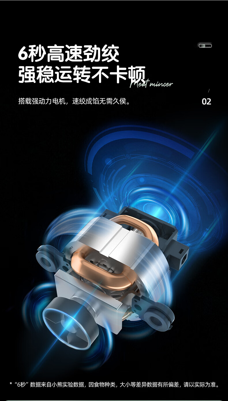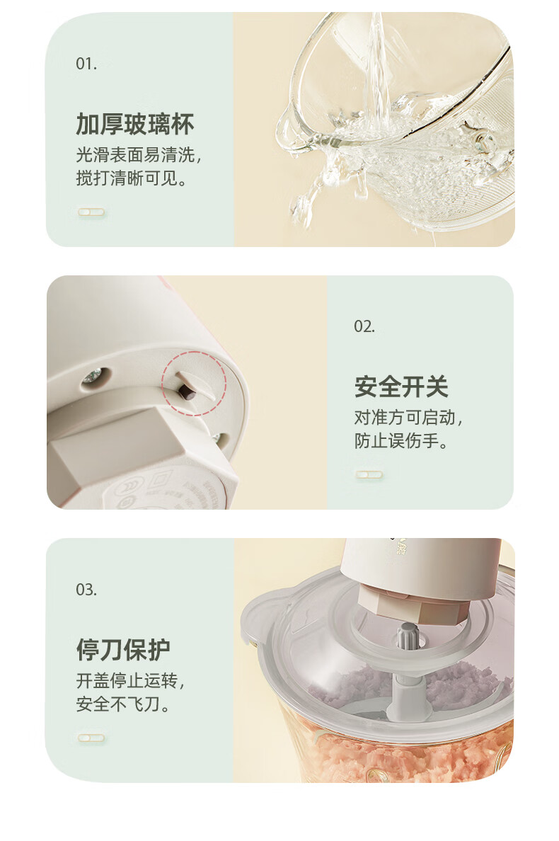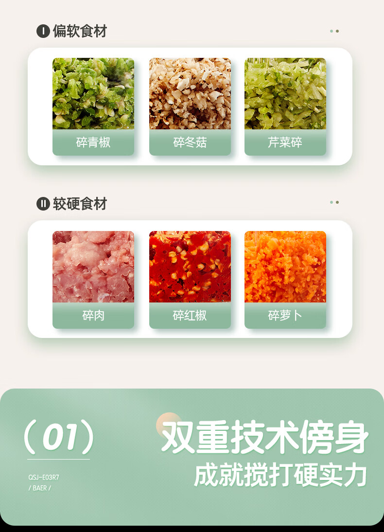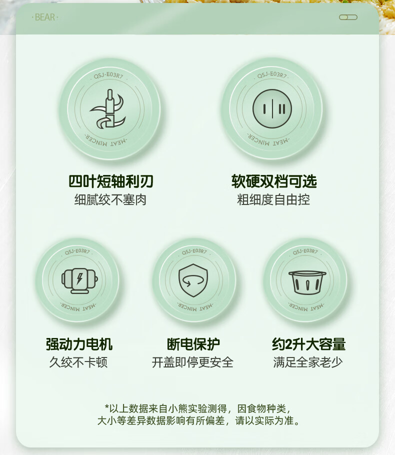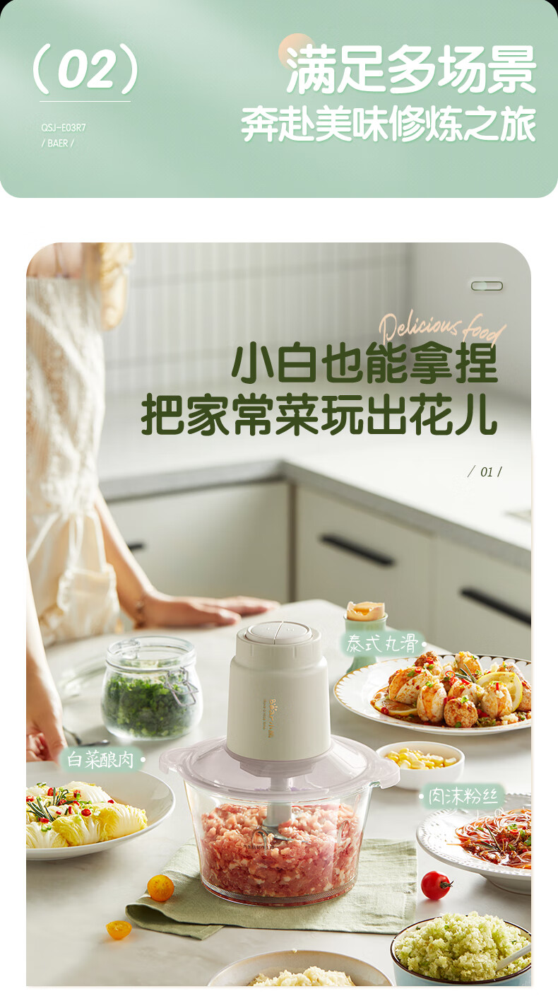 短轴四叶刀,易清洗不塞肉;300W整机大功率,耐用不易损;双档可选,软硬食材都兼顾