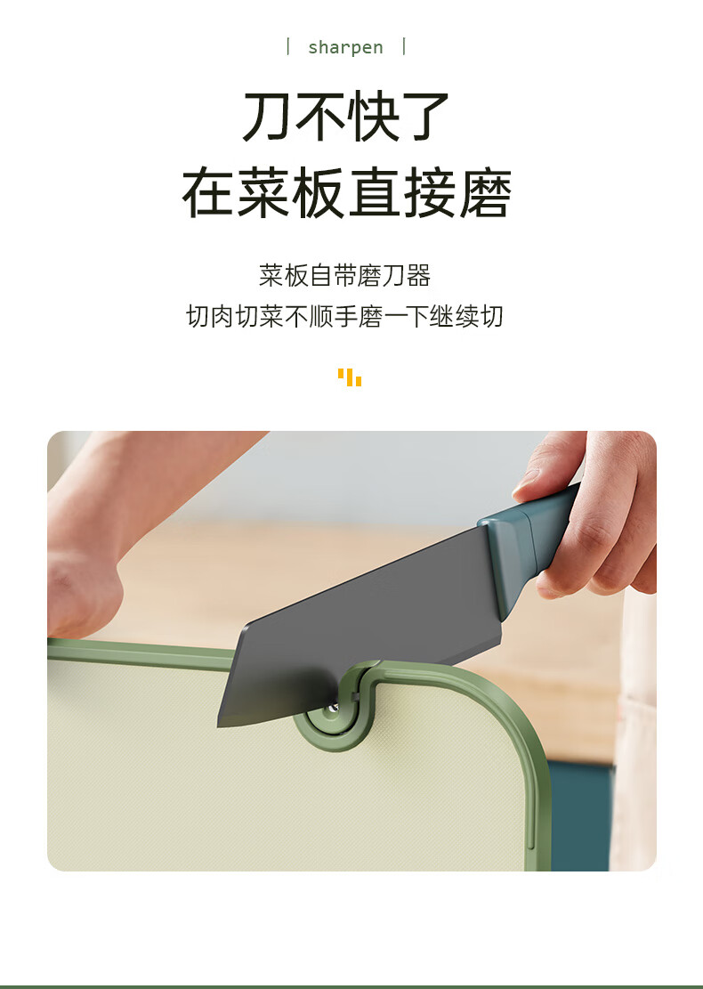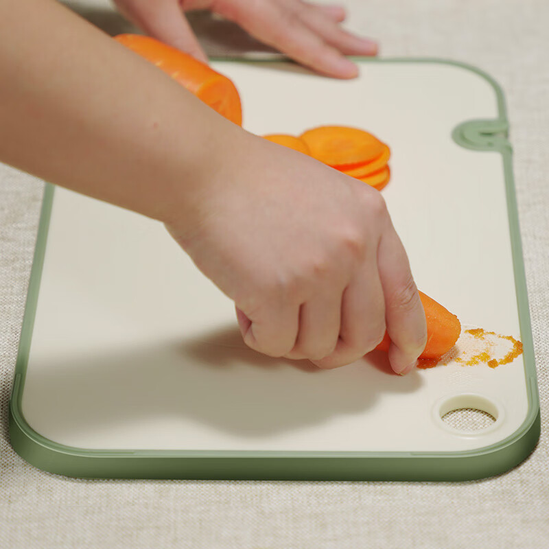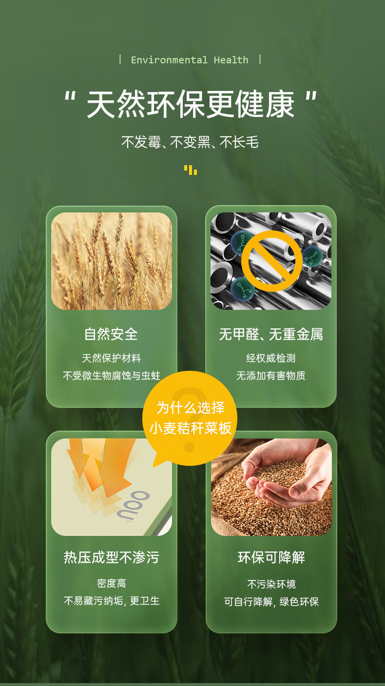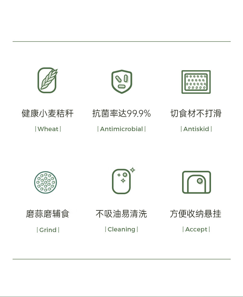 传统天然,健康小麦秸秆,不发霉,不变黑,不长毛; 设置研磨区,磨蒜磨辅食,轻松研磨不伤手;网格食材固定区,切生肉不打滑,好切更安全