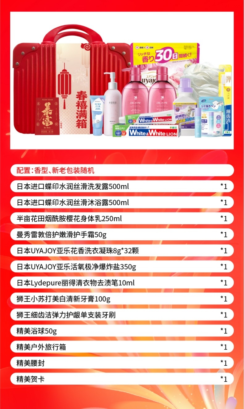 配置清单:日本进口蝶印水润丝滑洗发露500ml*1 日本进口蝶印水润丝滑沐浴露500ml*1 半亩花田烟酰胺樱花身体乳250ml*1 曼秀雷敦倍护嫩滑护手霜50g*1 日本UYAJOY亚乐花香洗衣凝珠8g*32颗*1 日本UYAJOY亚乐活氧极净爆炸盐350g*1 日本Lydepure丽得清衣物去渍笔10ml*1 狮王(Lion)小苏打美白清新牙膏100g*1 狮王(Lion)细齿洁弹力护龈单支装牙刷*1 精美浴球50g*1(赠品) 精美户外旅行箱*1 精美腰封*1(量大可定制) 精美贺卡*1(量大可定制)