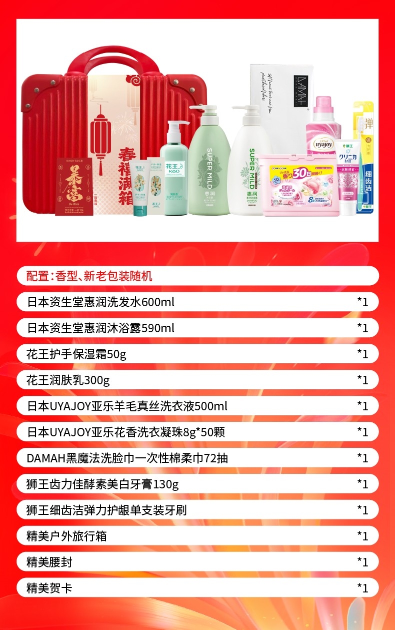 配置清单:日本资生堂惠润洗发水600ml*1 日本资生堂惠润沐浴露590ml*1 花王(KAO)护手保湿霜50g*1 花王(KAO)润肤乳300g*1 日本UYAJOY亚乐羊毛真丝洗衣液500ml*1 日本UYAJOY亚乐花香洗衣凝珠8g*50颗*1 DAMAH黑魔法洗脸巾一次性棉柔巾72抽*1 狮王(Lion)齿力佳酵素美白牙膏130g*1 狮王(Lion)细齿洁弹力护龈单支装牙刷*1 精美户外旅行箱*1 精美腰封*1(量大可定制) 精美贺卡*1(量大可定制)