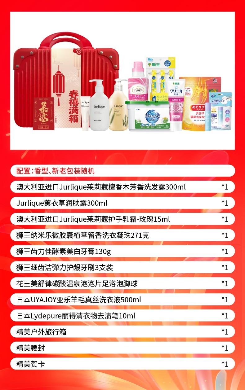 配置清单:澳大利亚进口Jurlique茱莉蔻檀香木芳香洗发露300ml*1 Jurlique薰衣草润肤露300ml(酒店新版)*1 澳大利亚进口Jurlique茱莉蔻护手乳霜-玫瑰15ml*1 狮王(Lion)纳米乐微胶囊植萃留香洗衣凝珠271克(23颗)*1 狮王(Lion)齿力佳酵素美白牙膏130g*1 狮王(Lion)细齿洁弹力护龈牙刷3支装*1 花王(KAO)美舒律碳酸温泉泡泡片足浴泡脚球(助力好眠)(35gx5片装)*1 日本UYAJOY亚乐羊毛真丝洗衣液500ml*1 日本Lydepure丽得清衣物去渍笔10ml*1 精美户外旅行箱*1(零售价79元) 精美腰封*1(量大可定制) 精美贺卡*1(量大可定制)