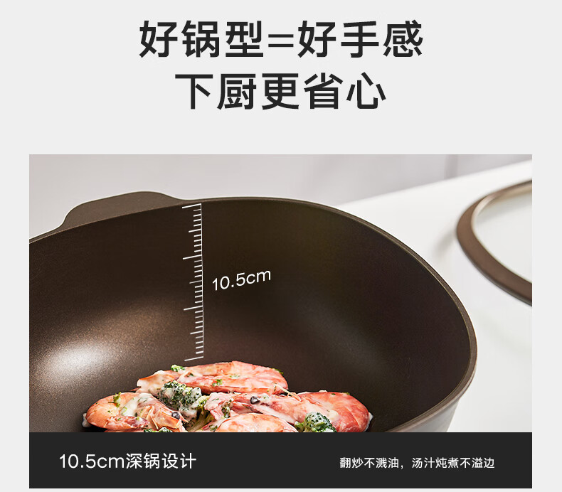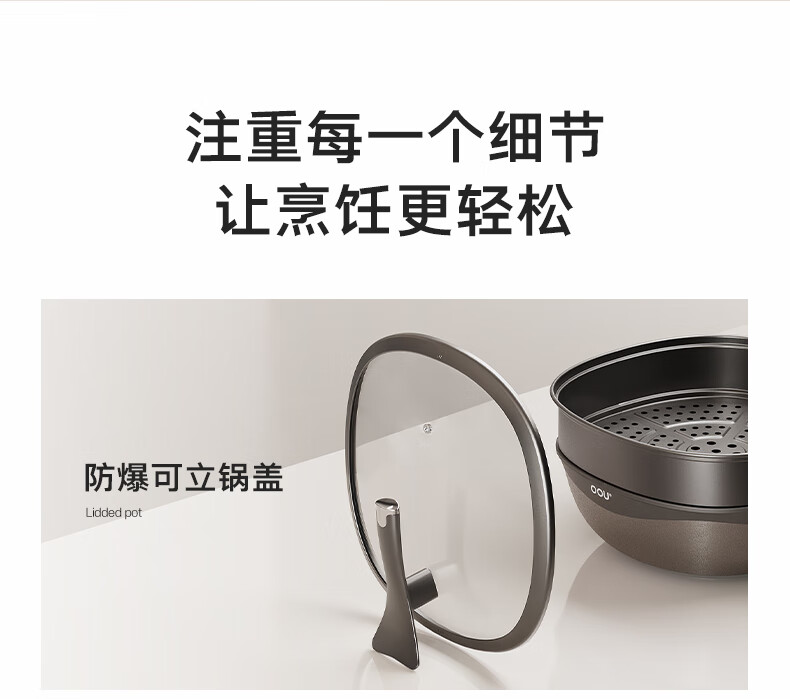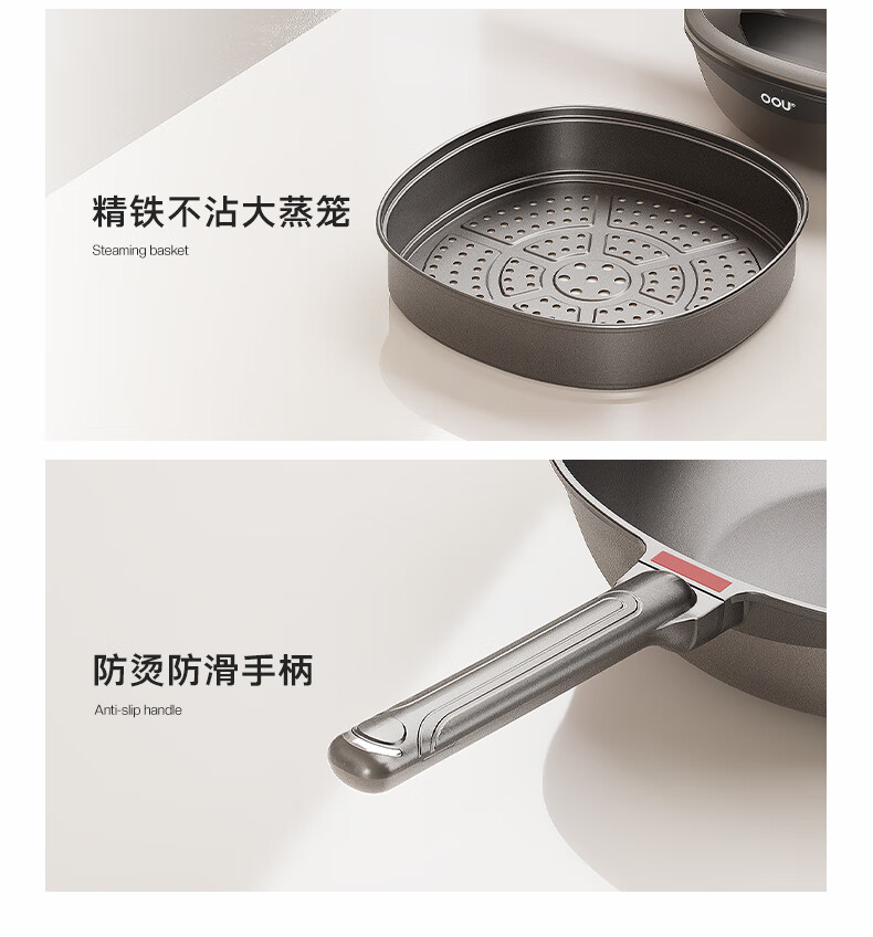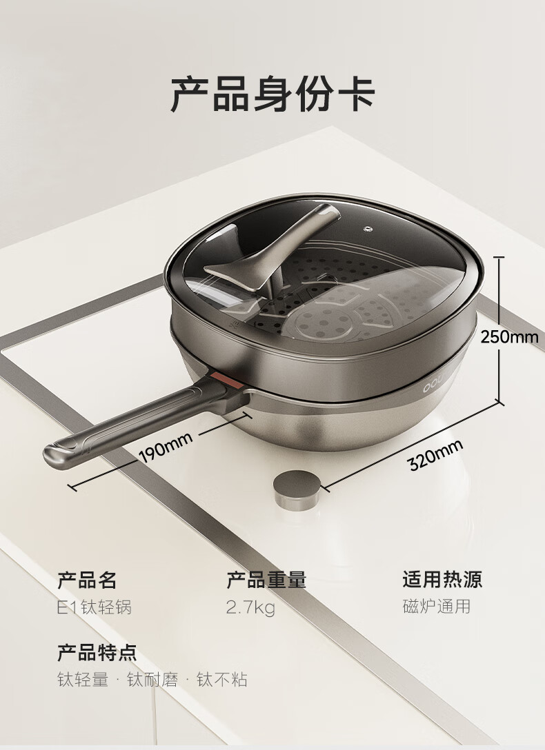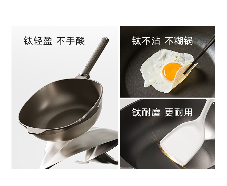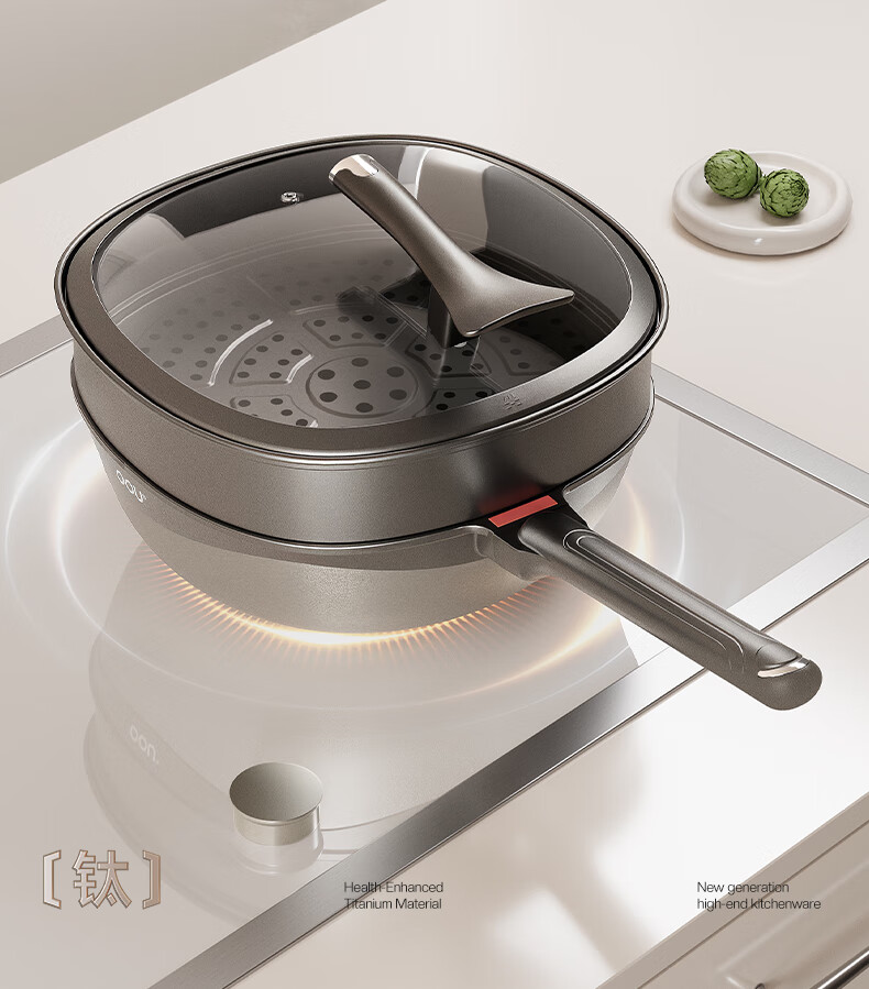 健康无涂层钛持久不粘锅,越用越滑;防爆可立锅盖 ,精铁不沾大蒸笼,防烫防滑手柄;钛金属莫氏硬度达到6级