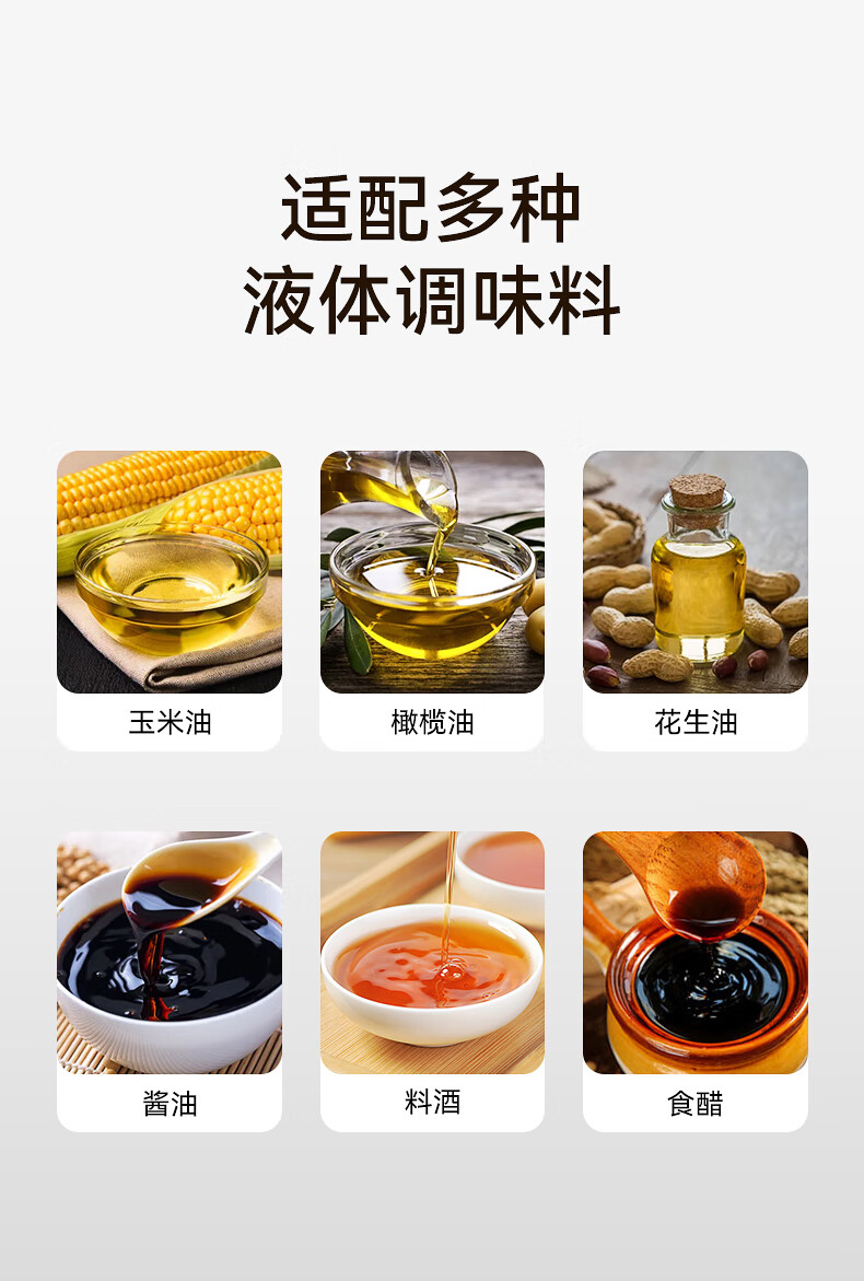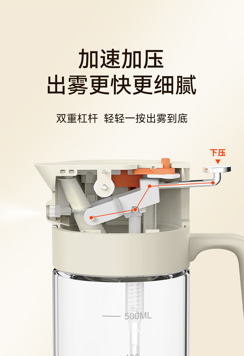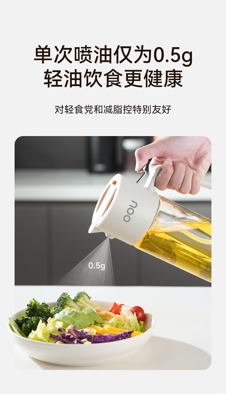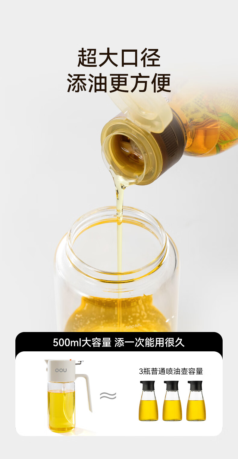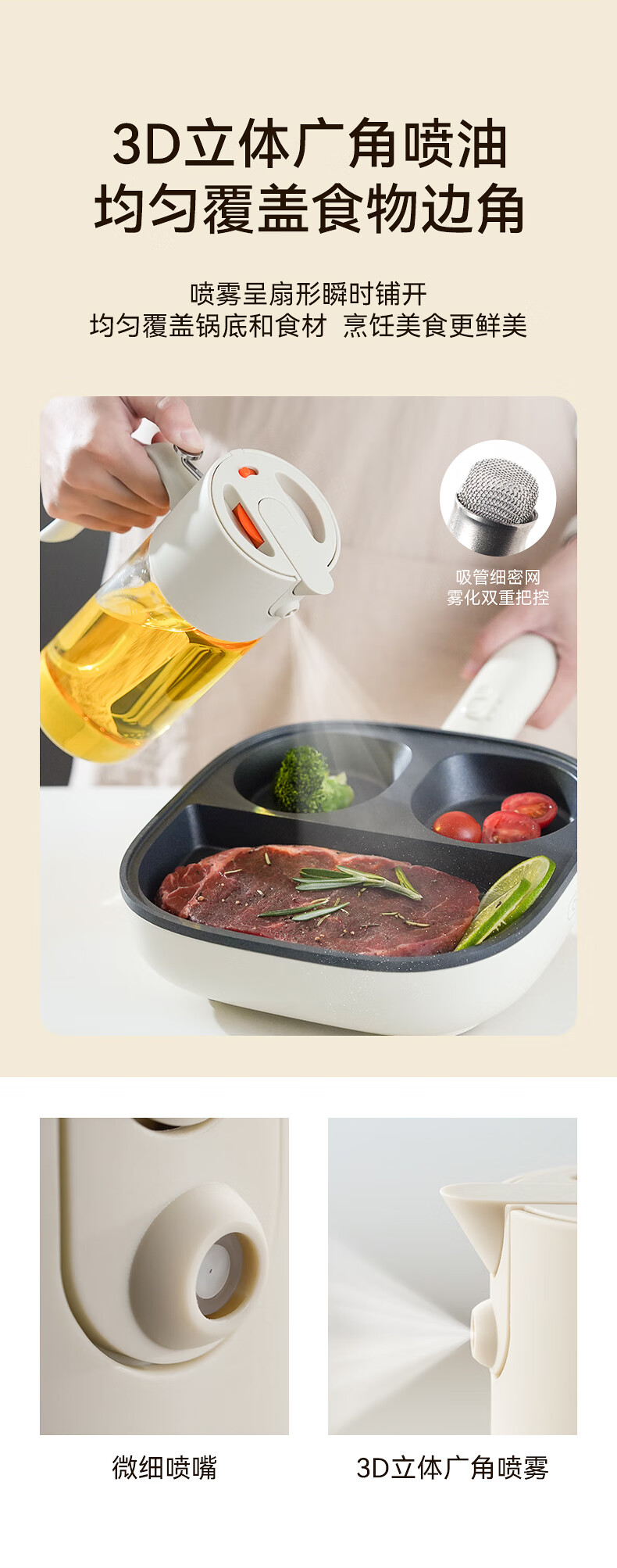 食品级加厚玻璃,通透性好硬度高;采用3D立体广角喷洒,食油均匀雾化,烹饪美食更鲜美;超大口径,添油更方便