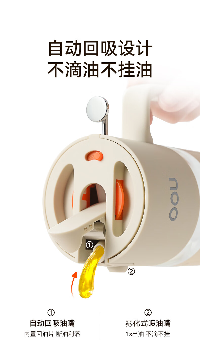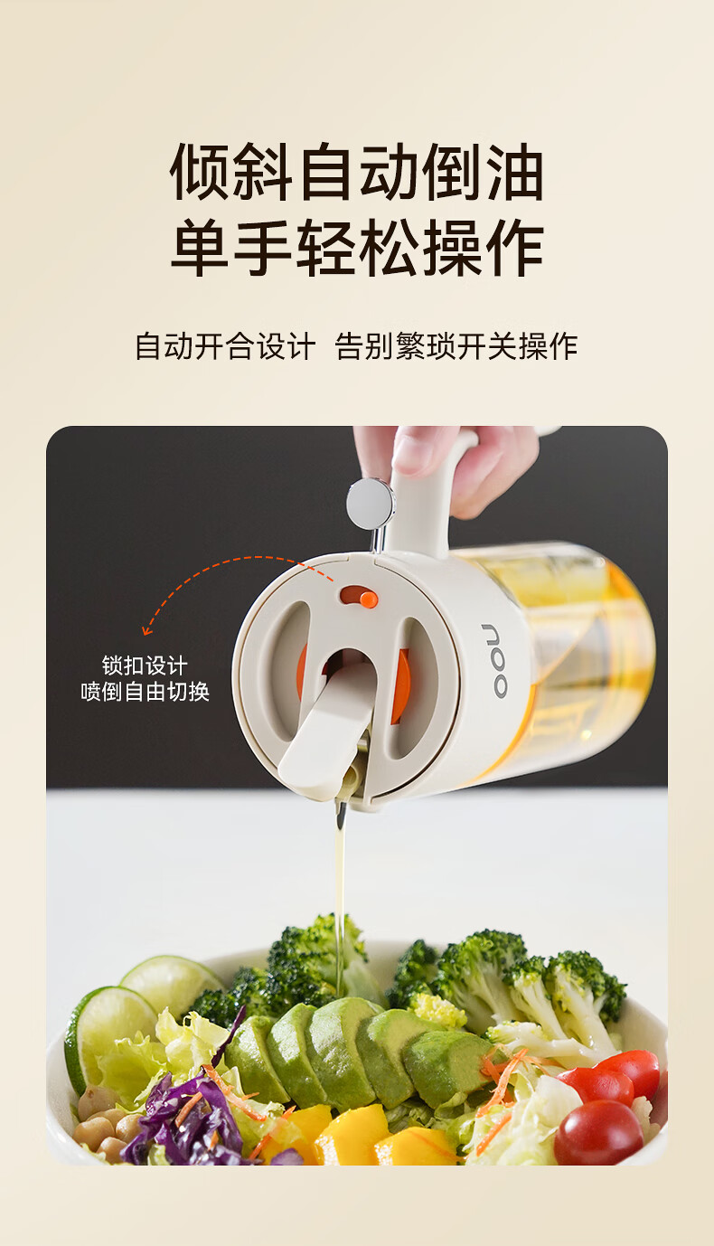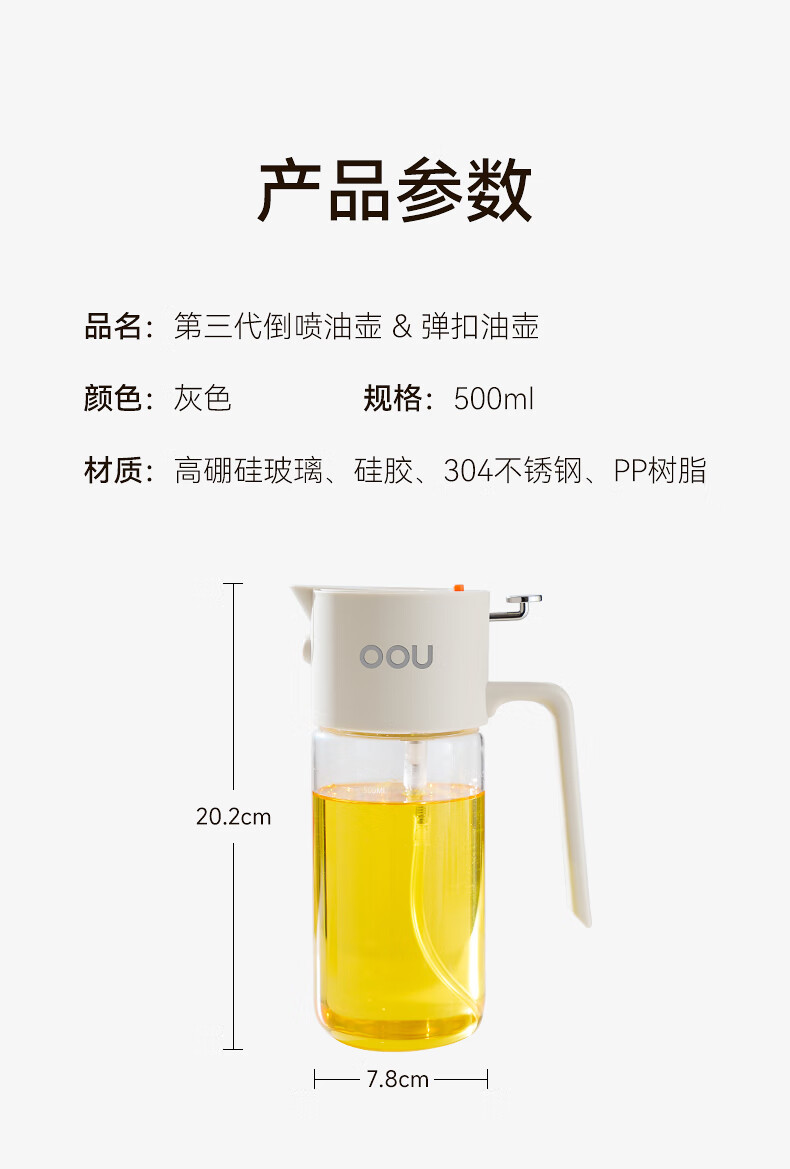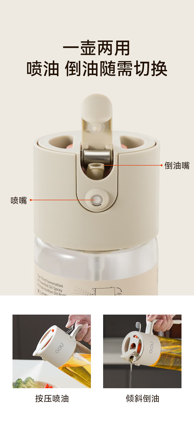 食品级加厚玻璃,通透性好硬度高;采用3D立体广角喷洒,食油均匀雾化,烹饪美食更鲜美;超大口径,添油更方便