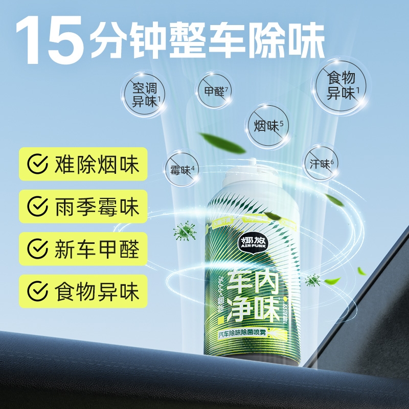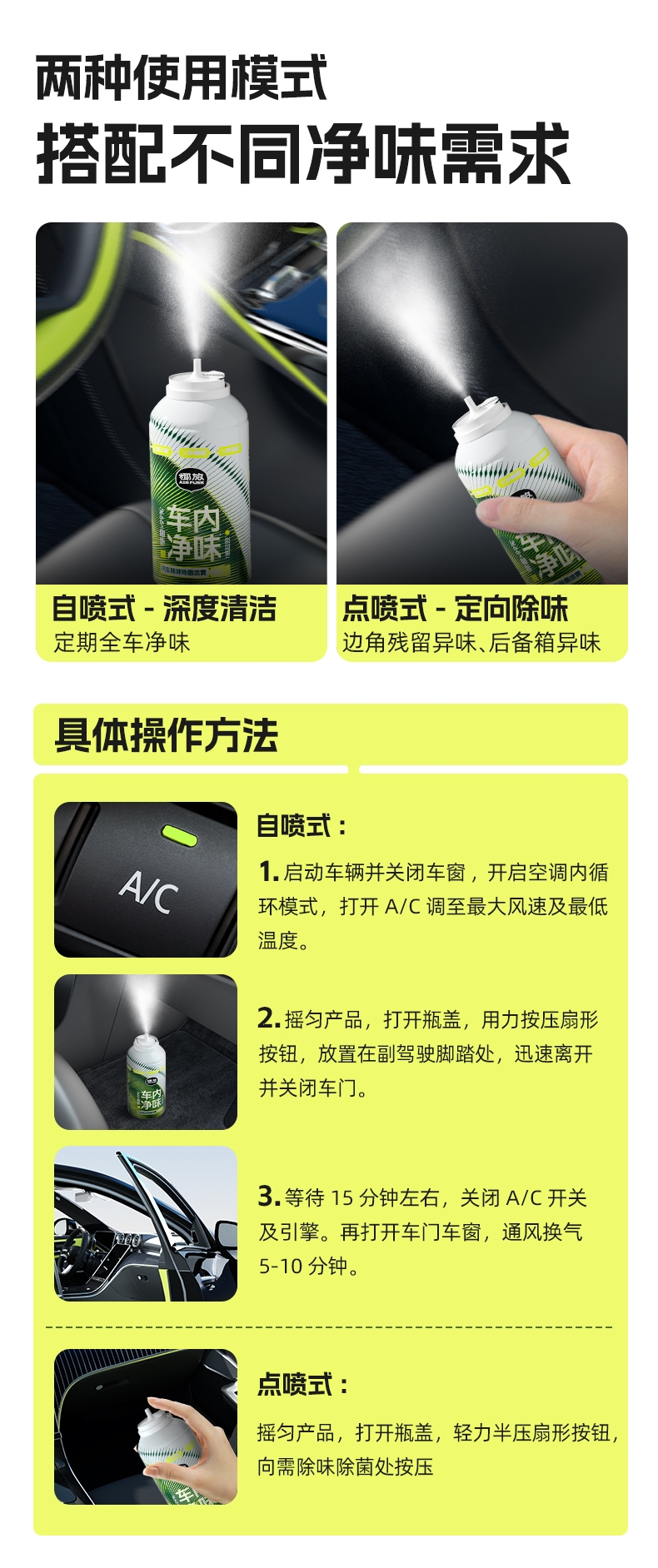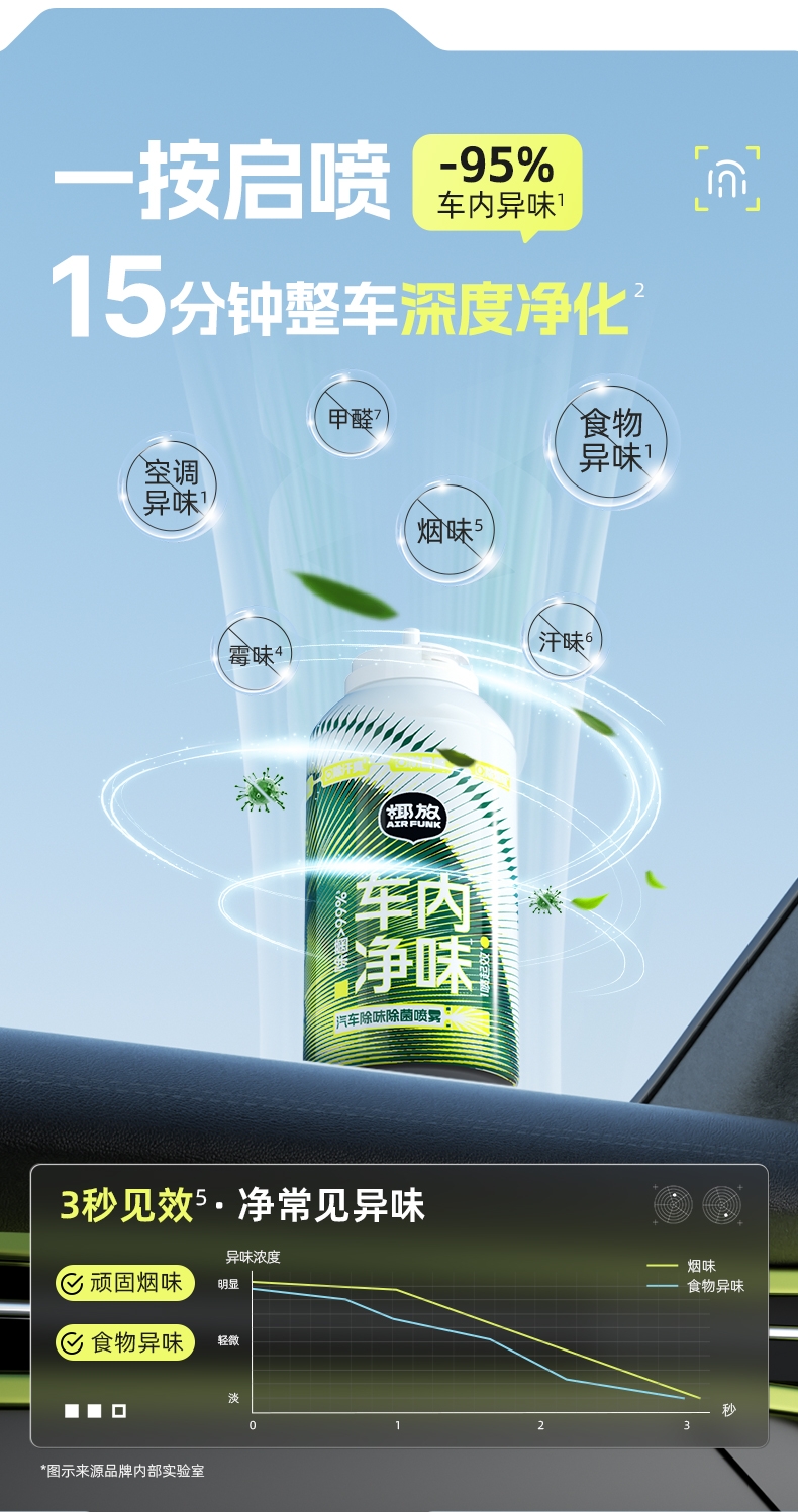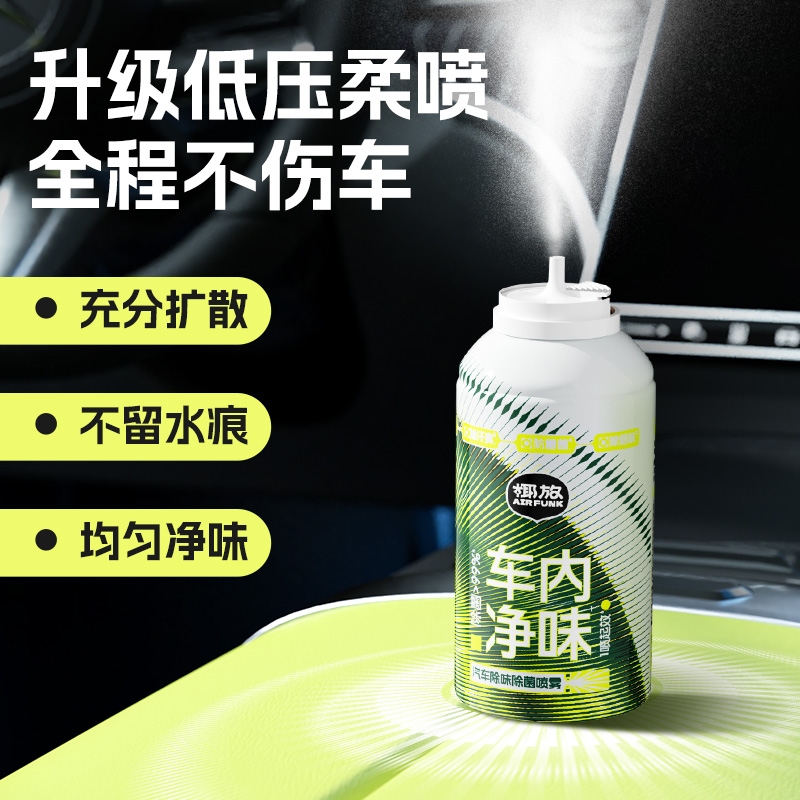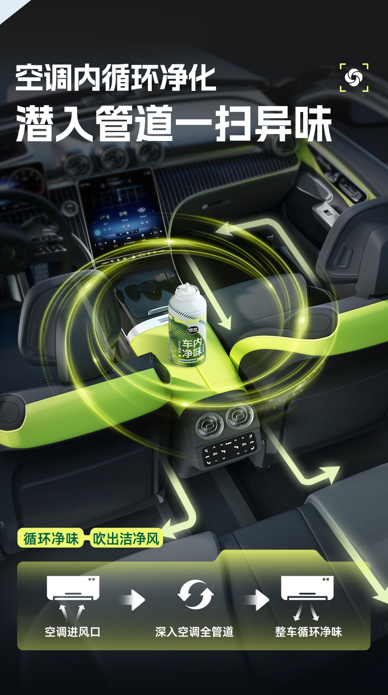 拆洗速净异味 解放双手 15分钟净化车内顽固异味 ;内循环扩散整车净化除菌/防霉/除醛/净味;创新柔喷技术免爆冲不湿车顶/不伤内饰,细雾均匀净化