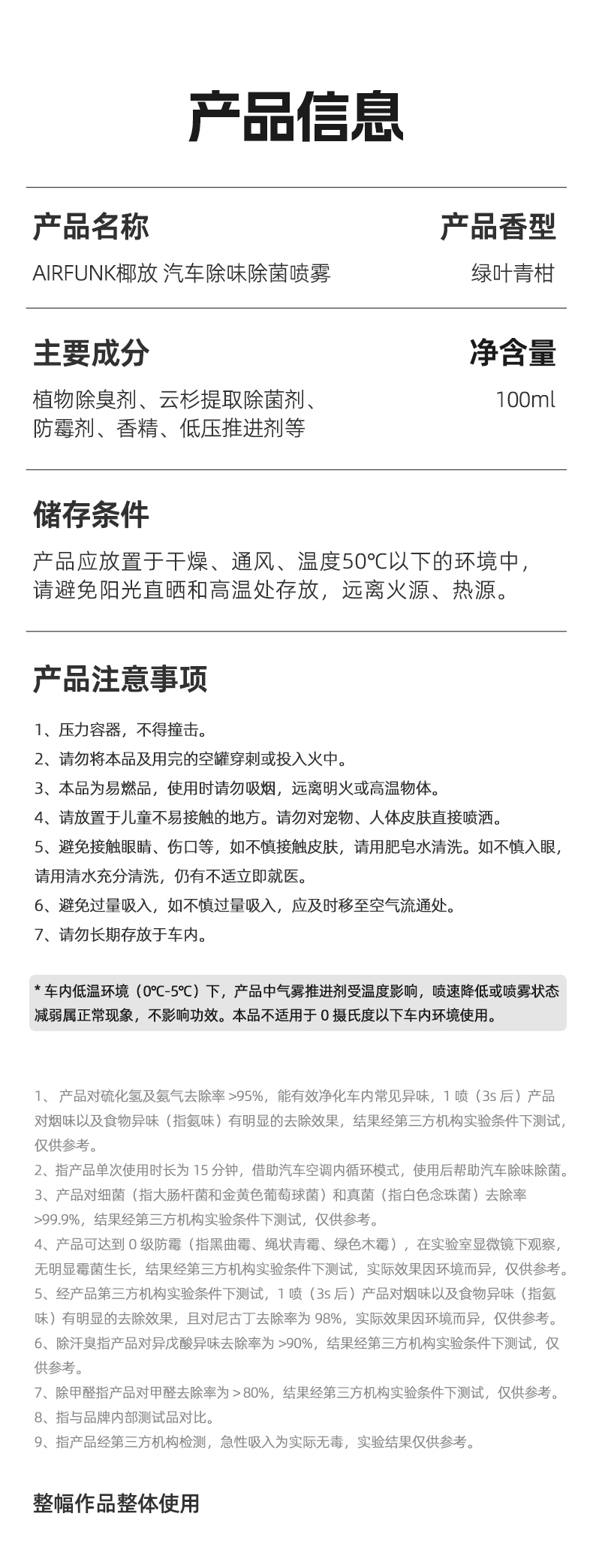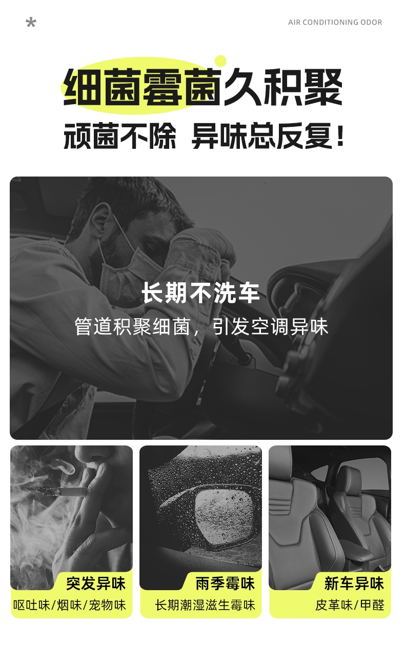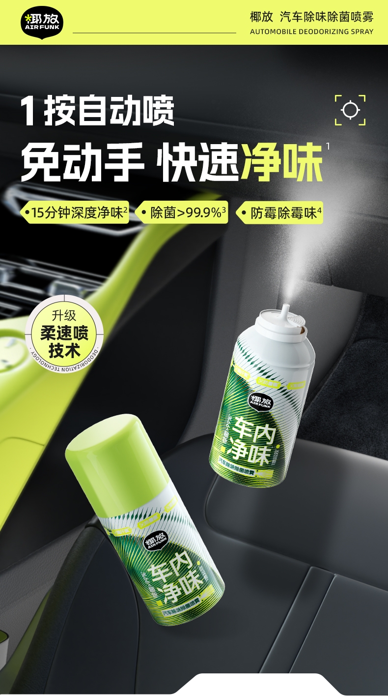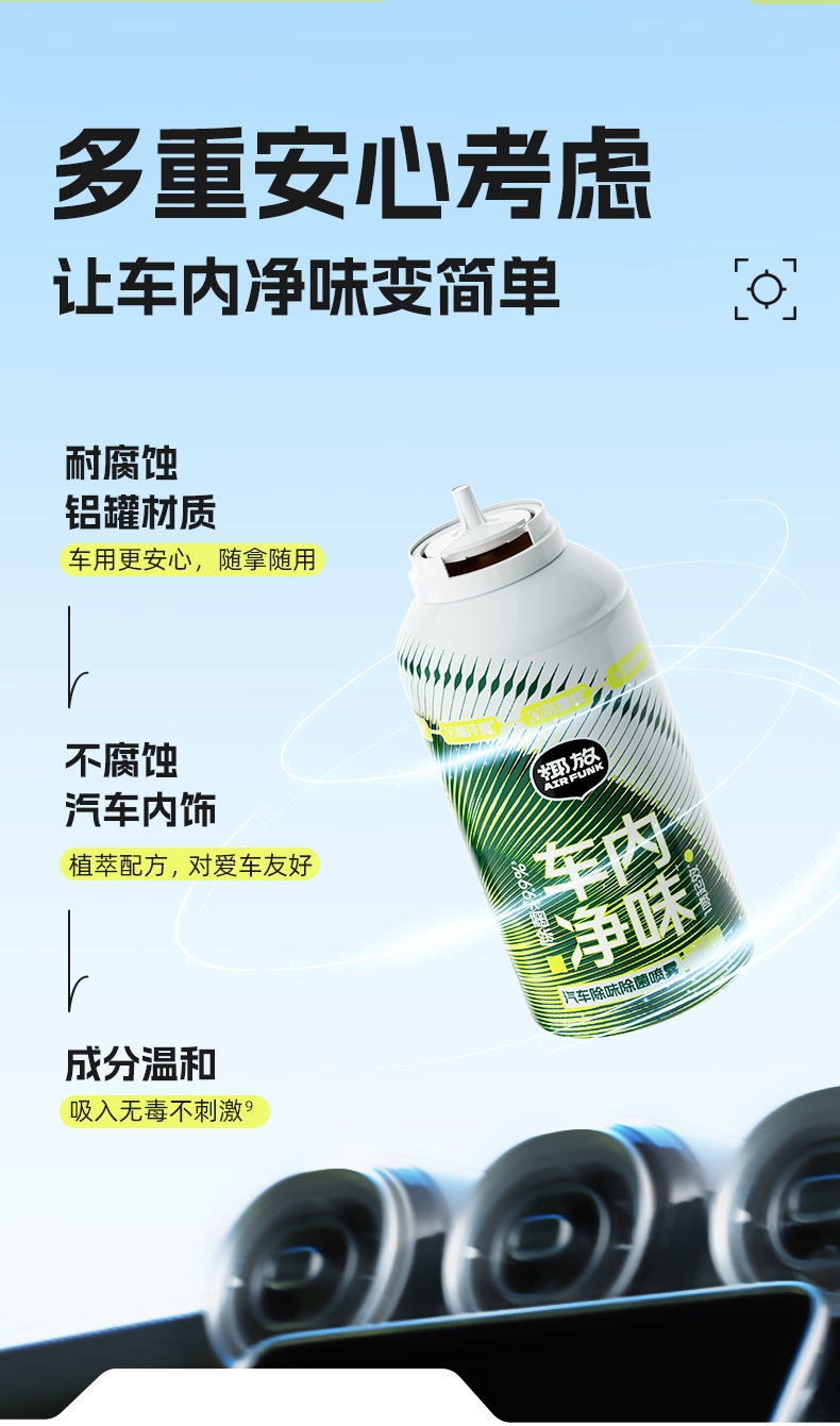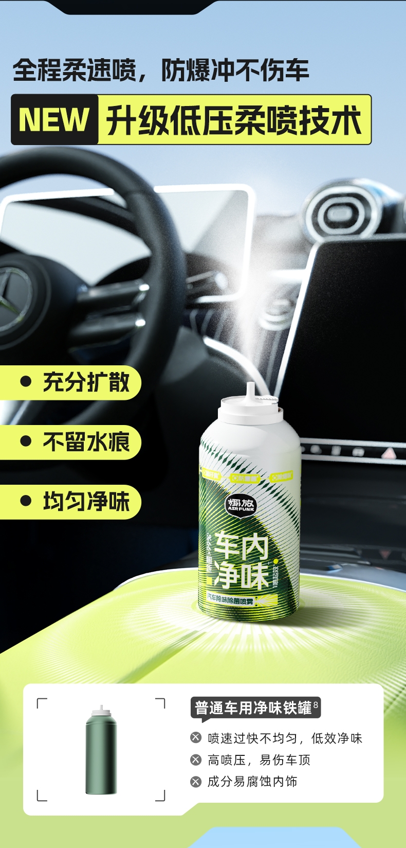 拆洗速净异味 解放双手 15分钟净化车内顽固异味 ;内循环扩散整车净化除菌/防霉/除醛/净味;创新柔喷技术免爆冲不湿车顶/不伤内饰,细雾均匀净化