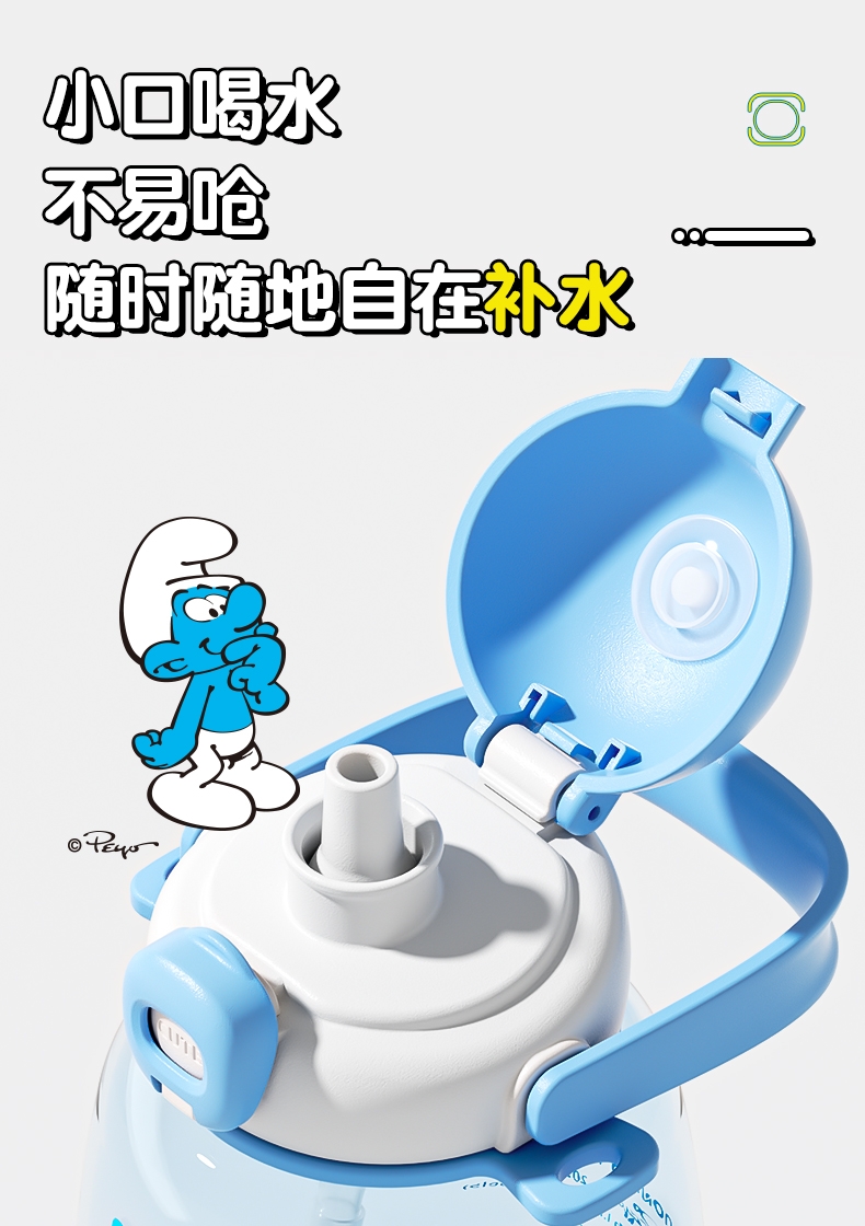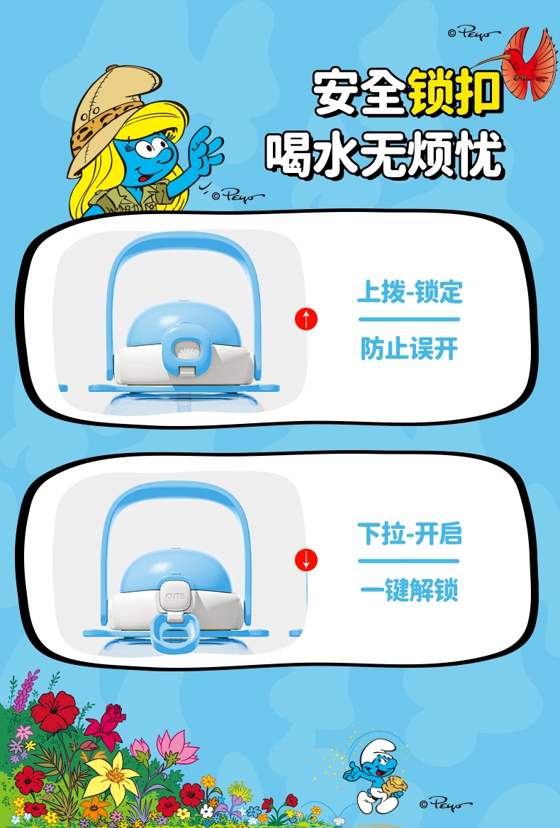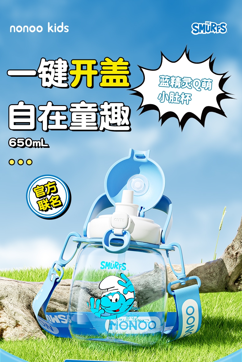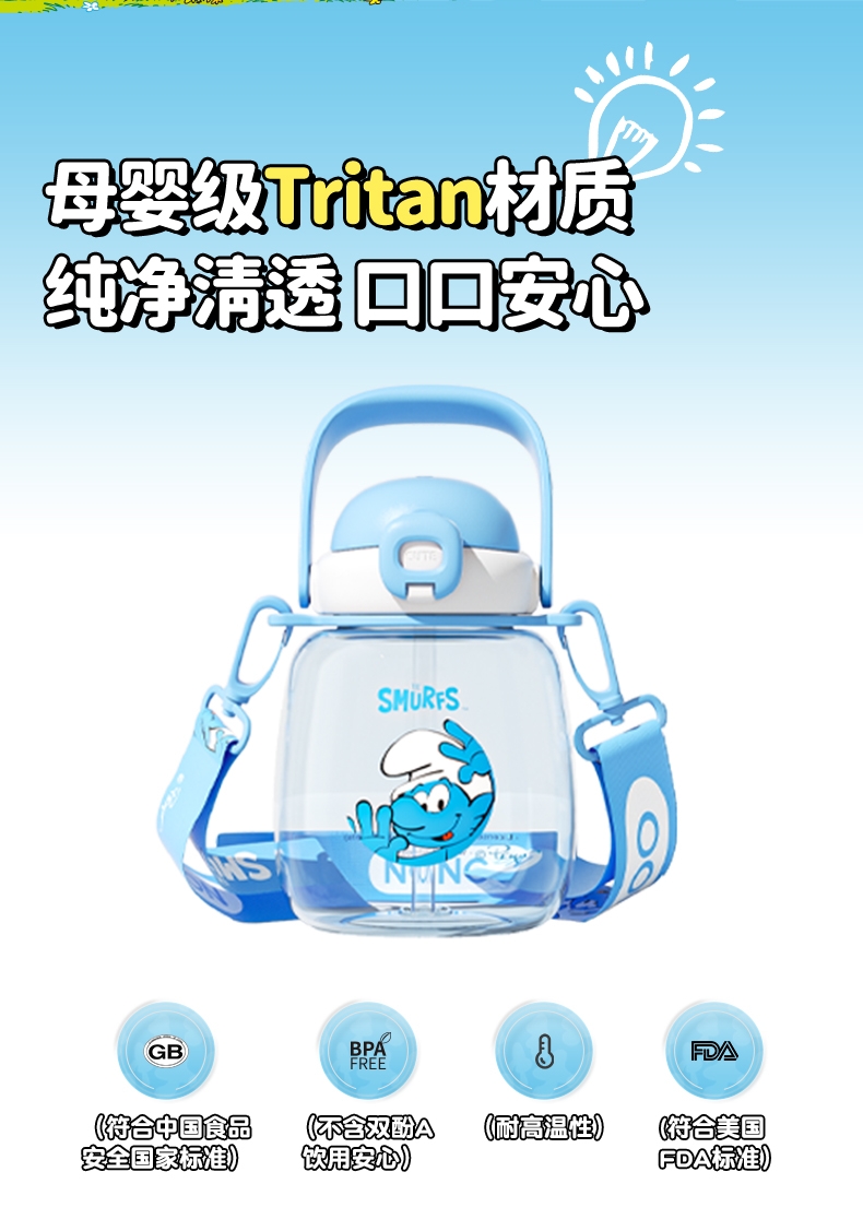 蓝精灵官方授权,Q萌格调,趣味出场;一键开盖,食品接触级硅胶吸管,耐咬可拆卸;杯体母婴级Tritan材质 ,纯净安全