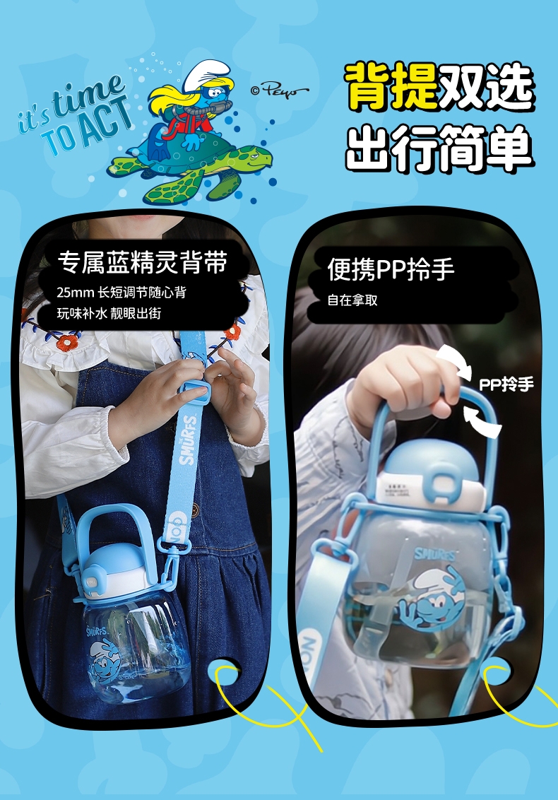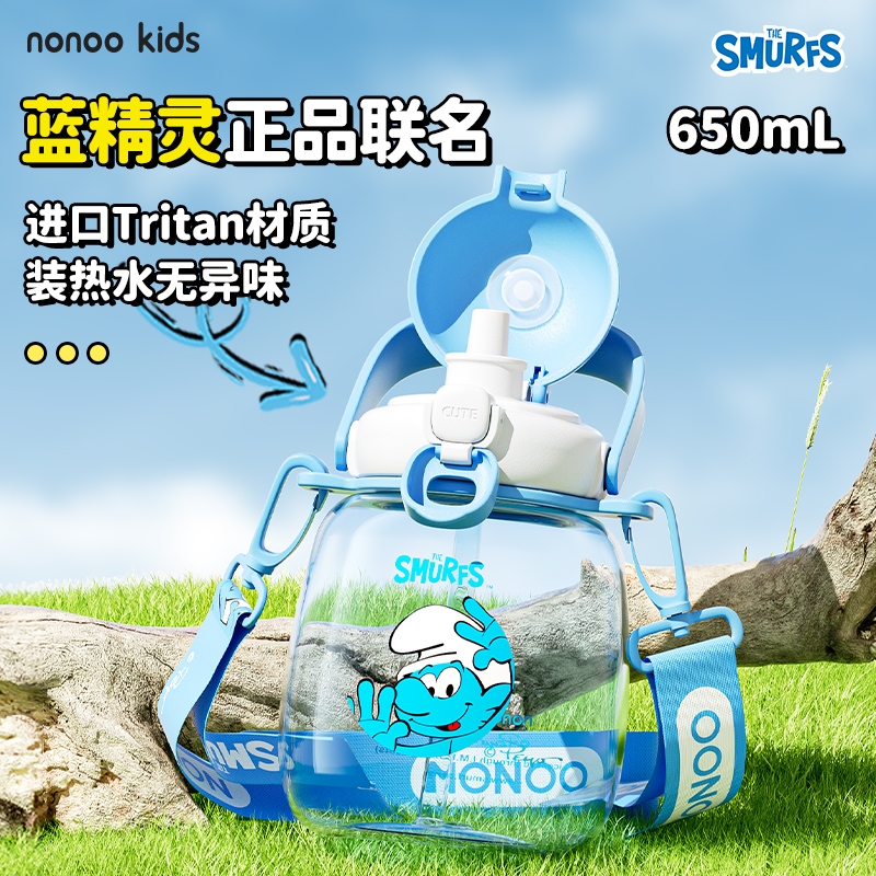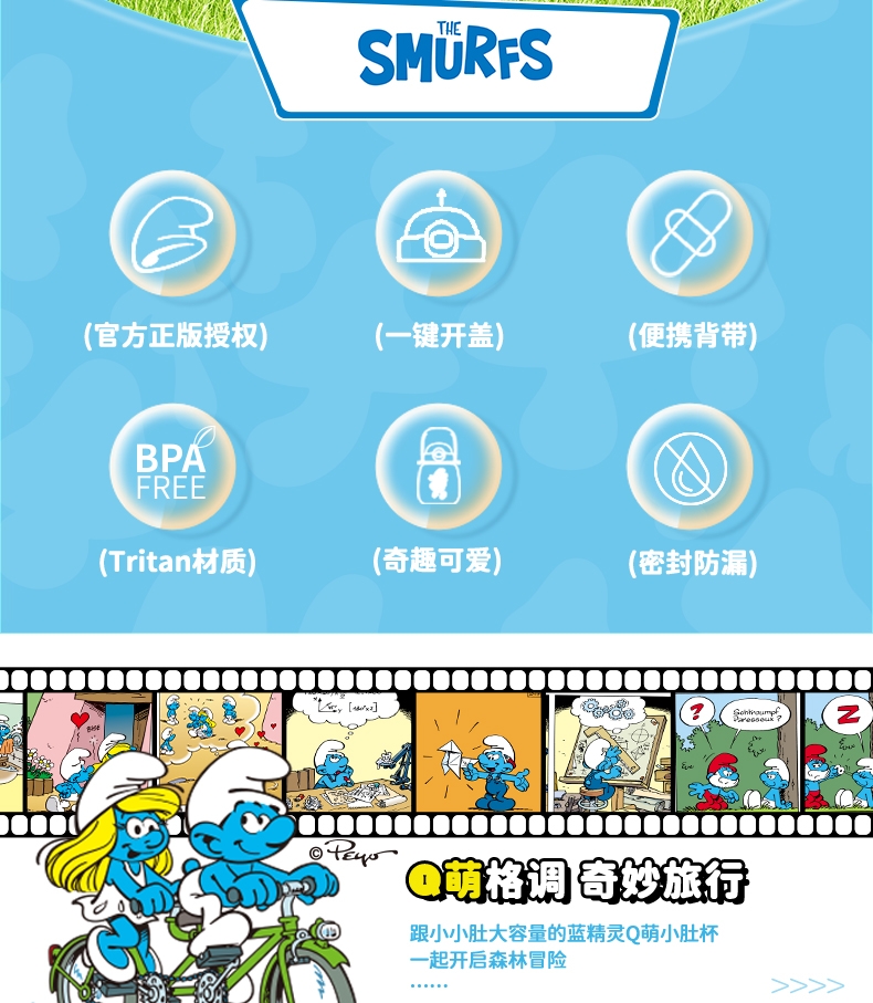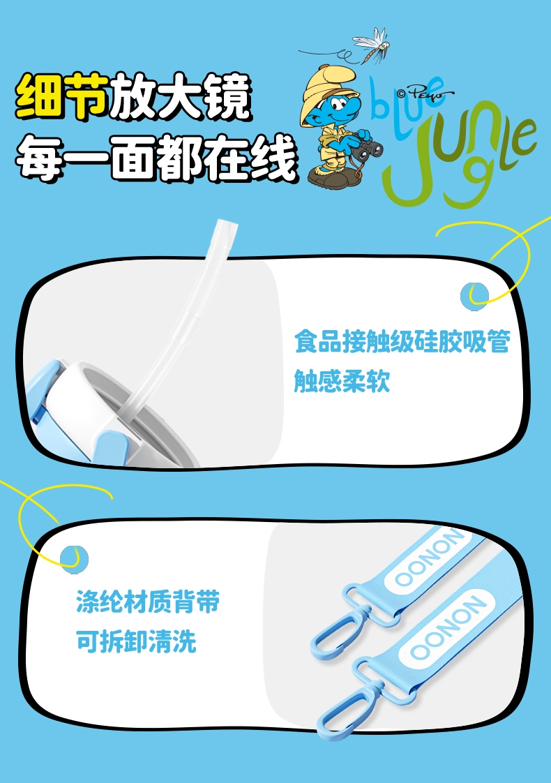 蓝精灵官方授权,Q萌格调,趣味出场;一键开盖,食品接触级硅胶吸管,耐咬可拆卸;杯体母婴级Tritan材质 ,纯净安全