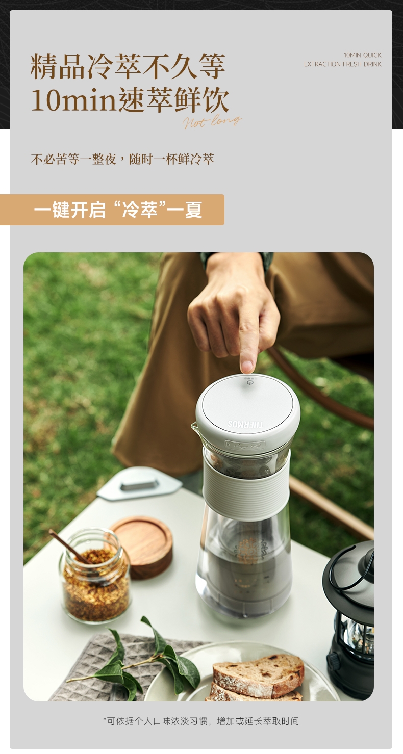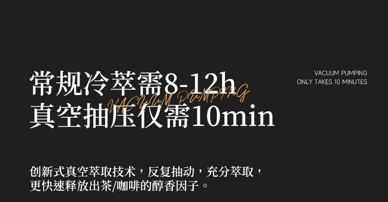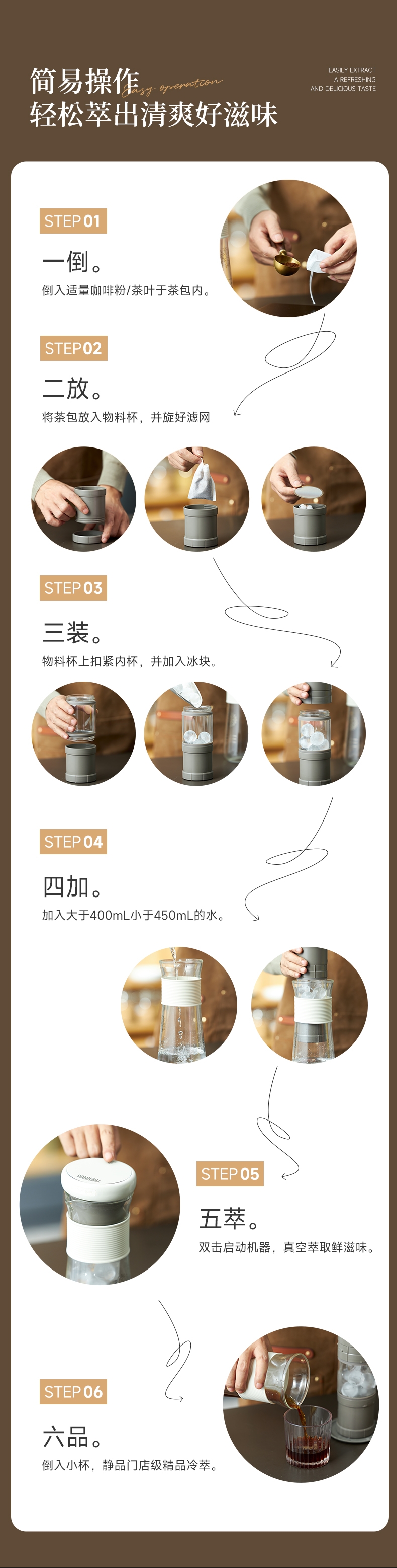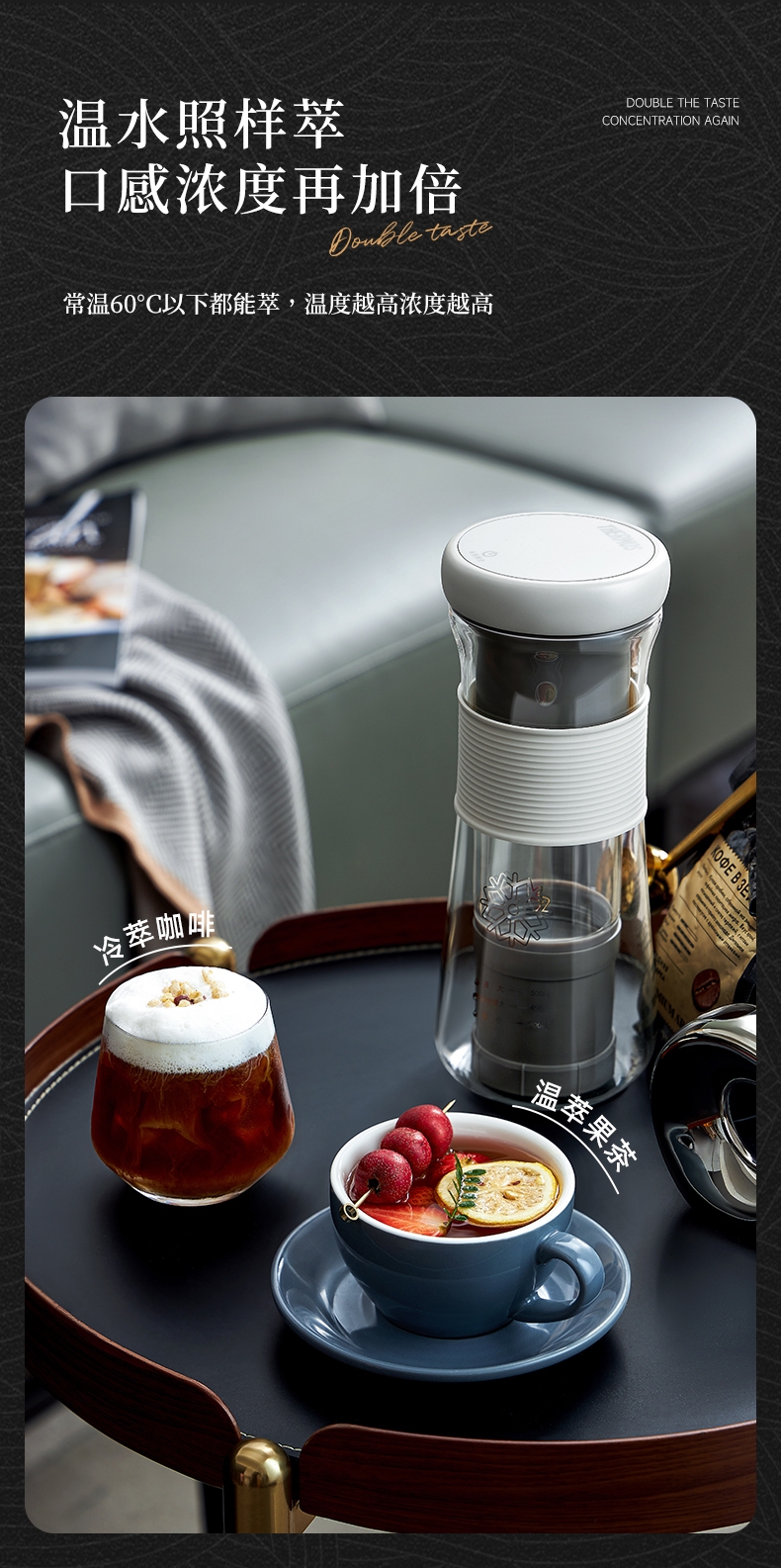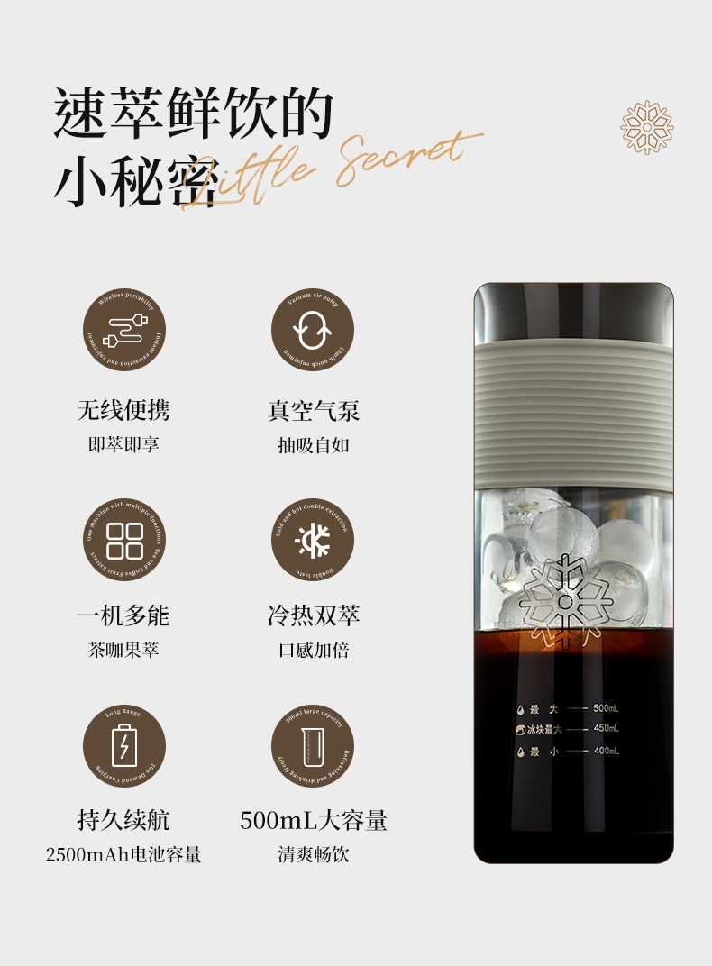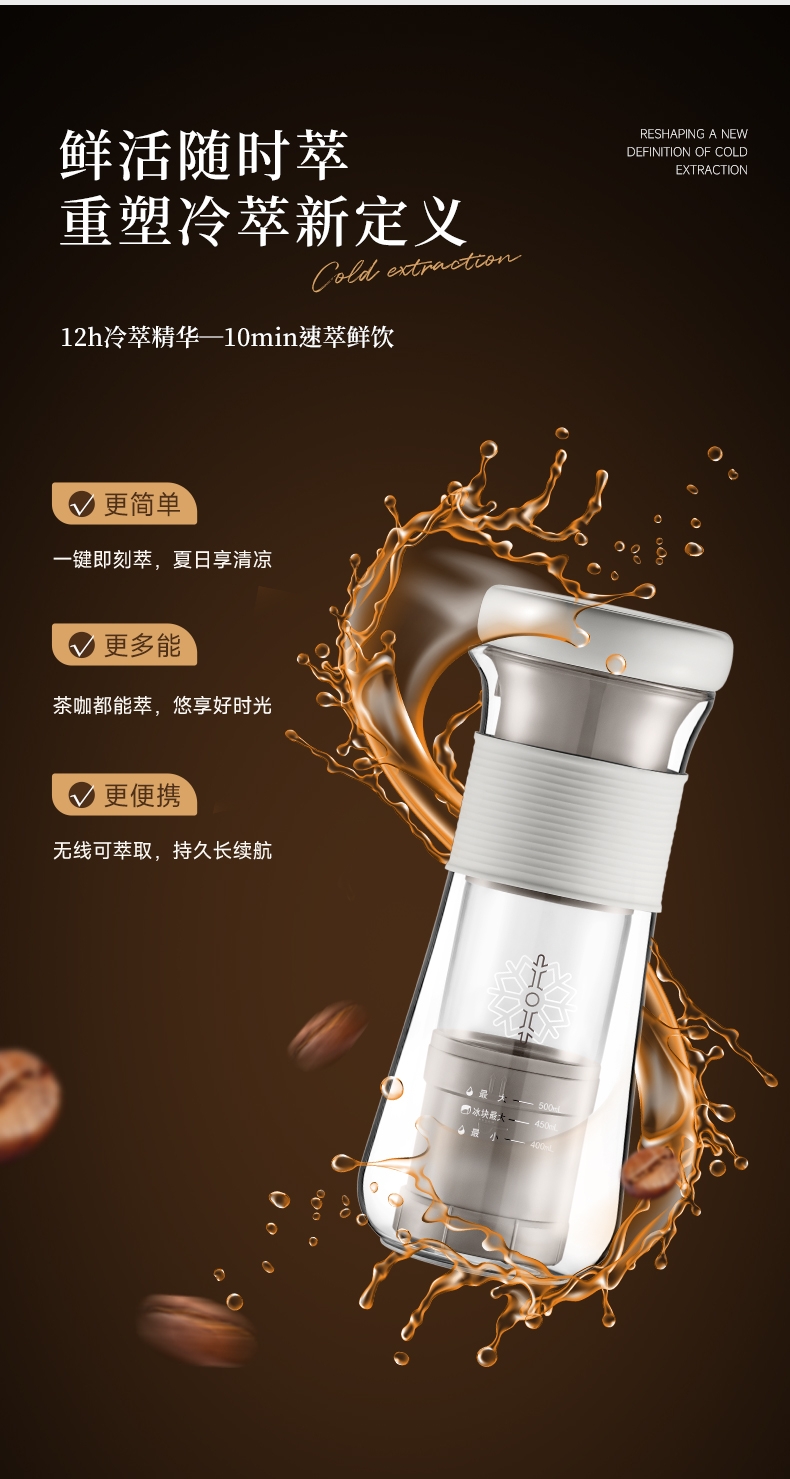 双击开启,15分钟速萃,茶咖皆可萃取;创新萃取技术,真空抽压,萃出浓醇;持久续航,内置2500mAh大容量电池