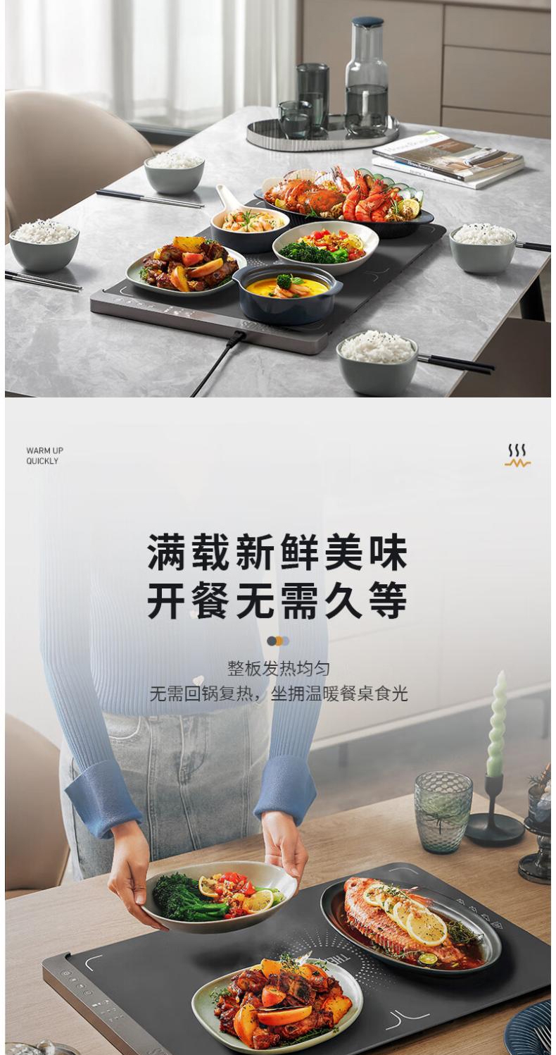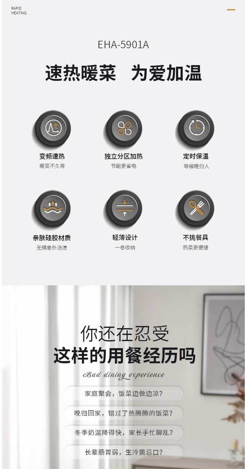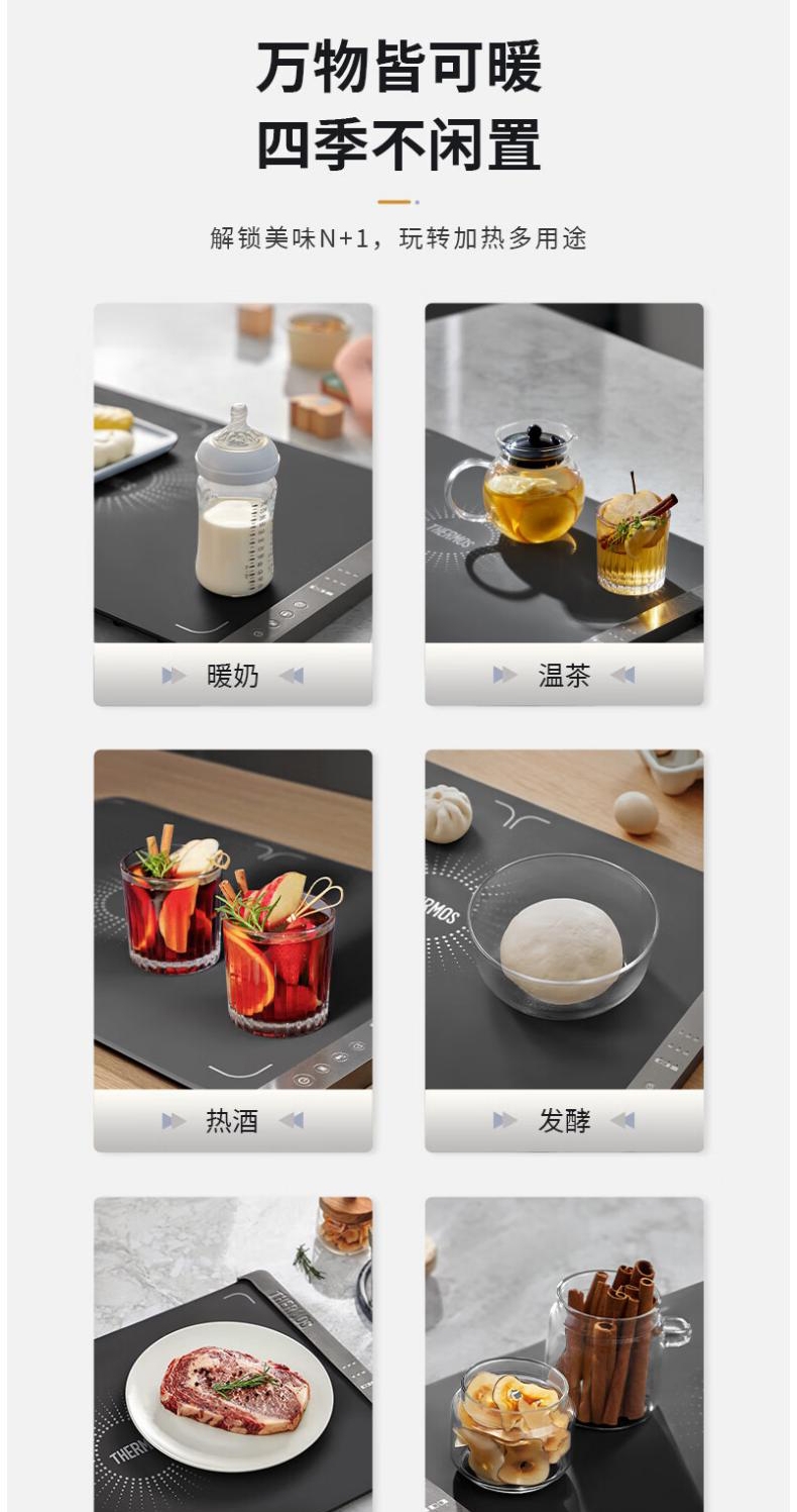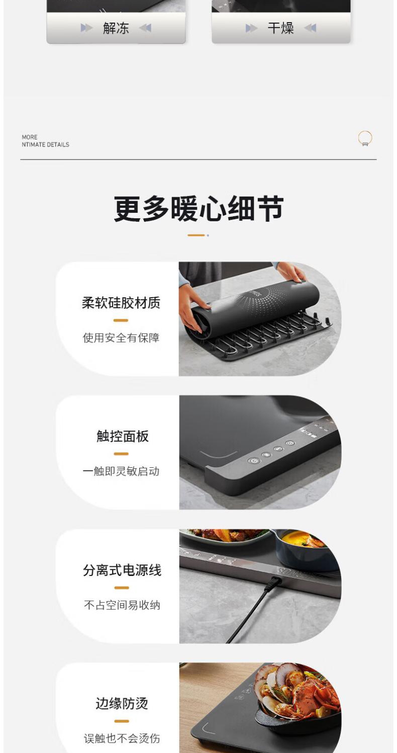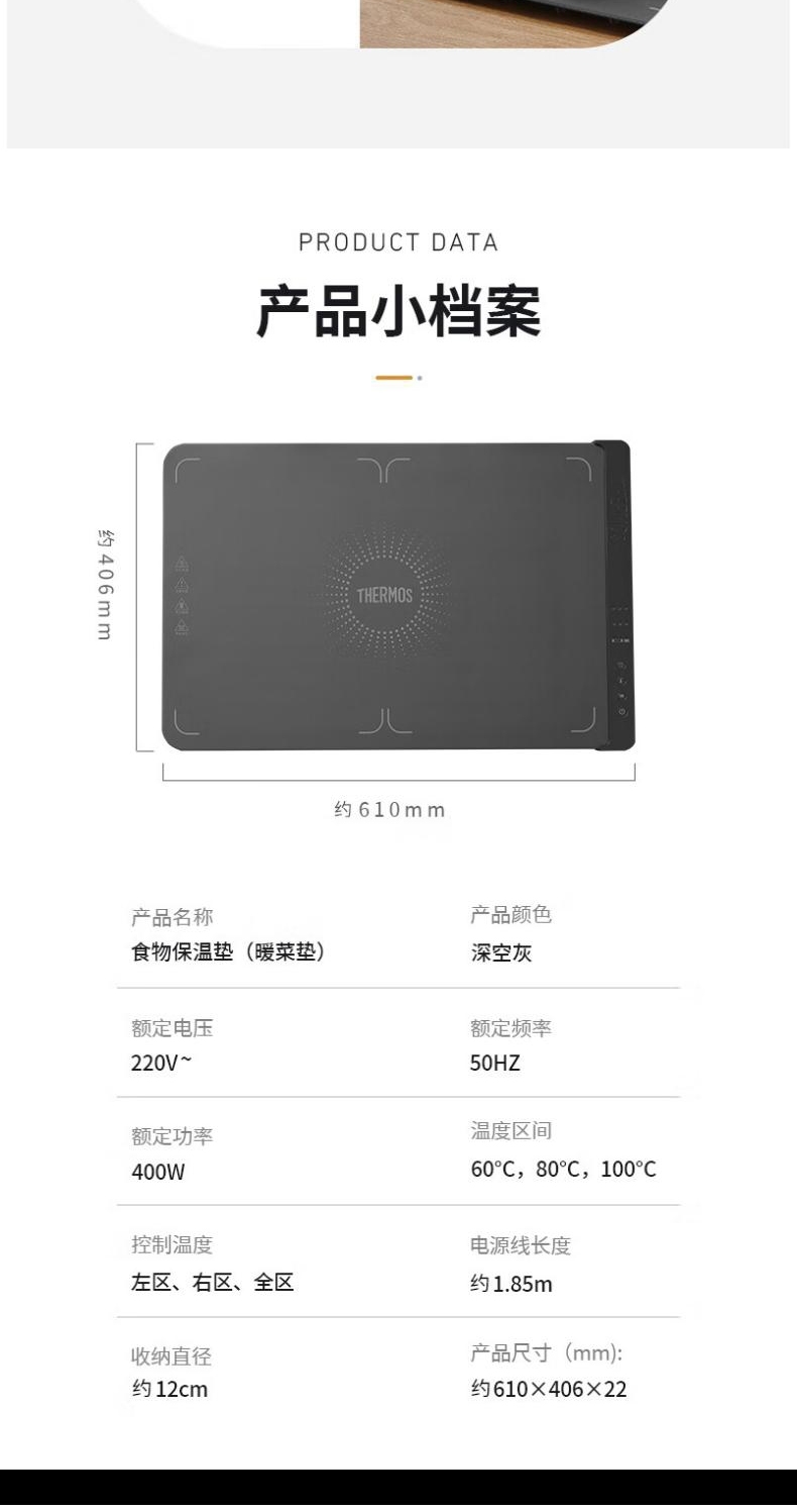 NTC自动控温系统,可单独控制左/右进行加热;6mm超薄设计,有弹性,可卷曲收纳;内置硅胶发热丝,边缘有防烫设计