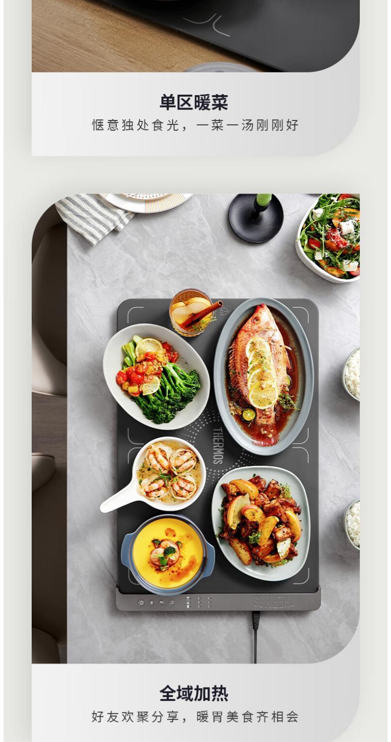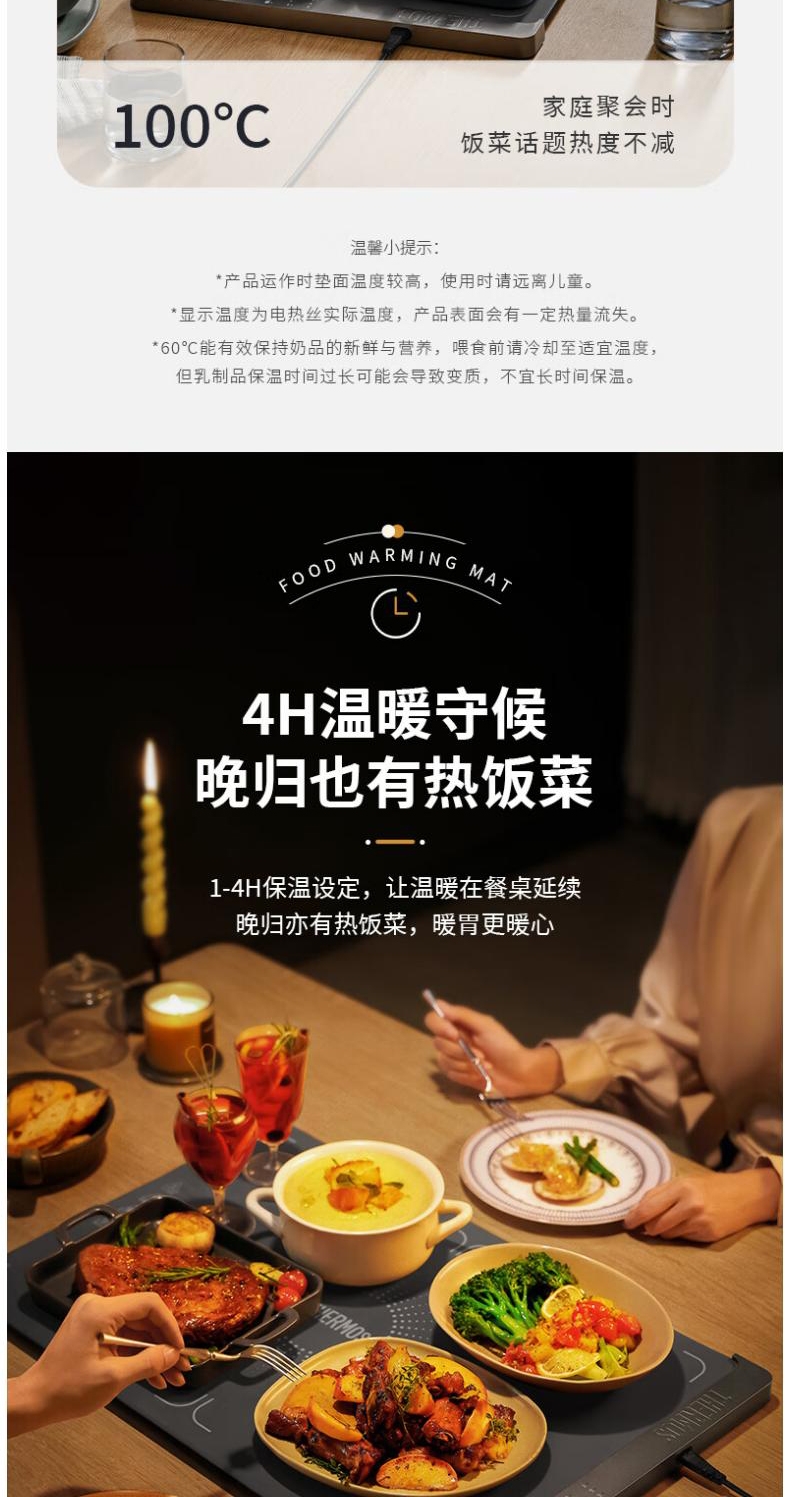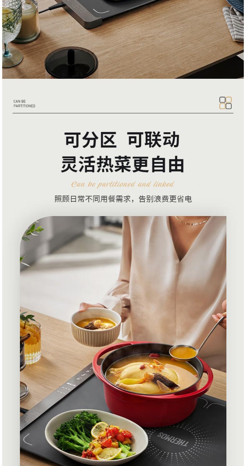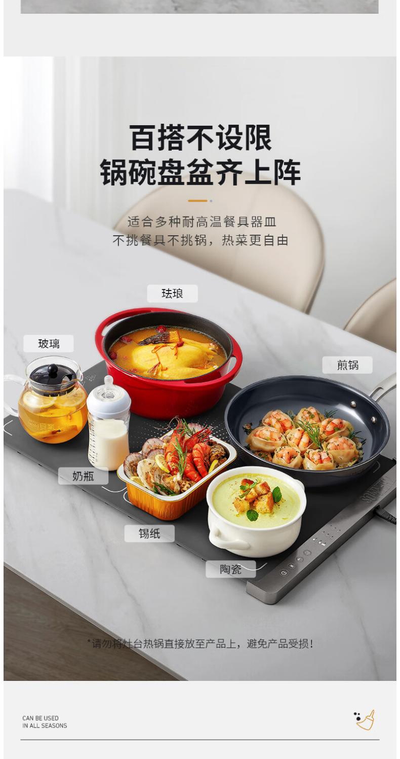 NTC自动控温系统,可单独控制左/右进行加热;6mm超薄设计,有弹性,可卷曲收纳;内置硅胶发热丝,边缘有防烫设计