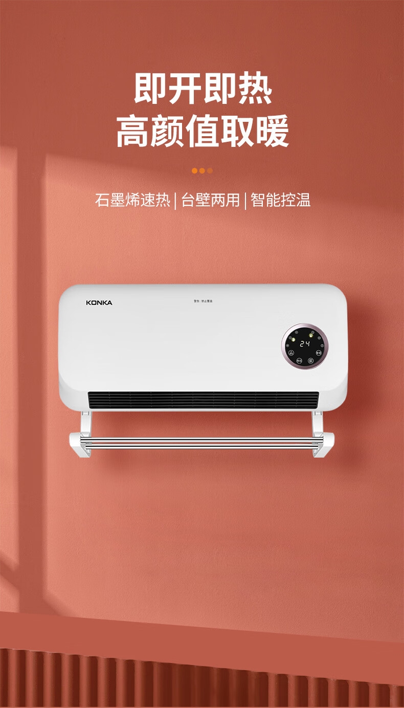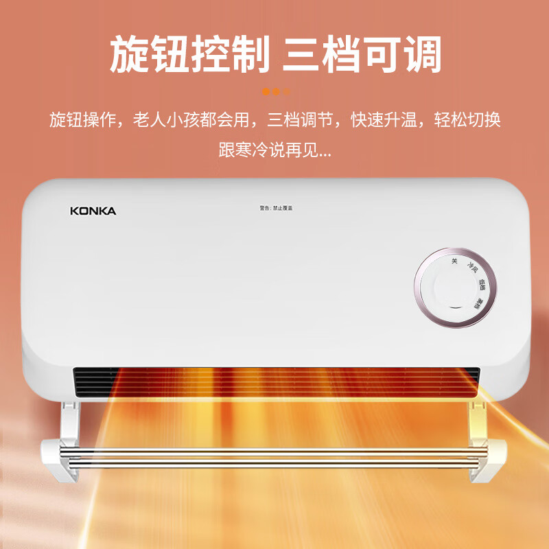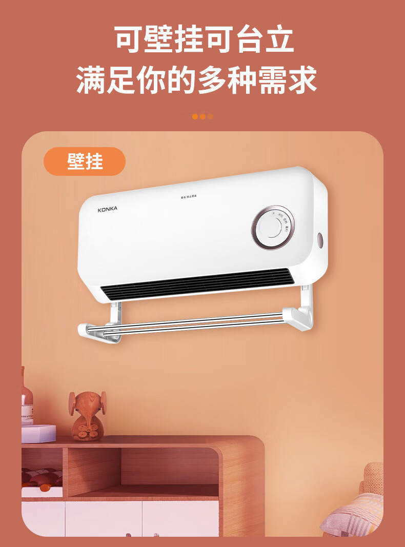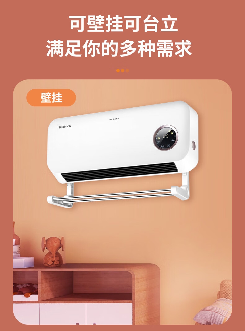 三档位开关;壁挂台式,多场合适用; 即开即热