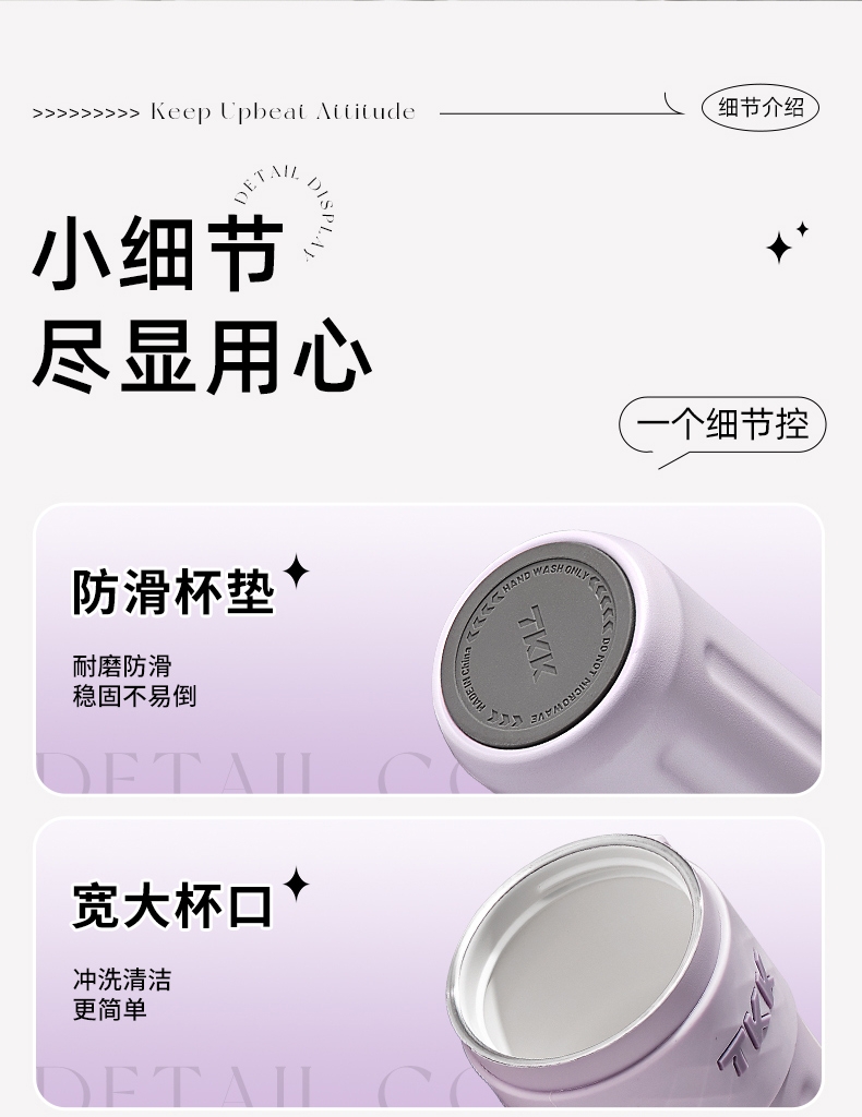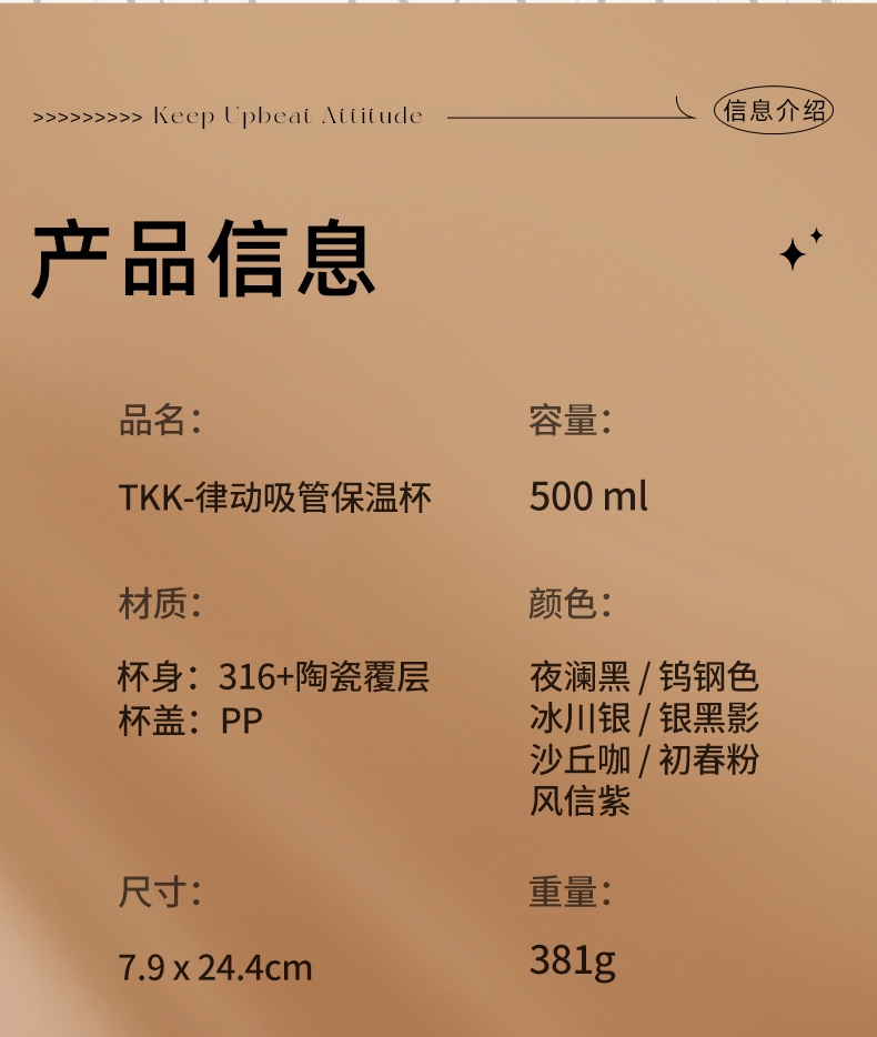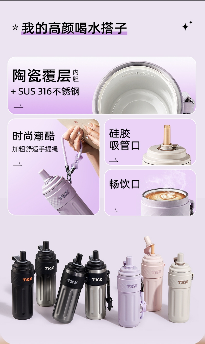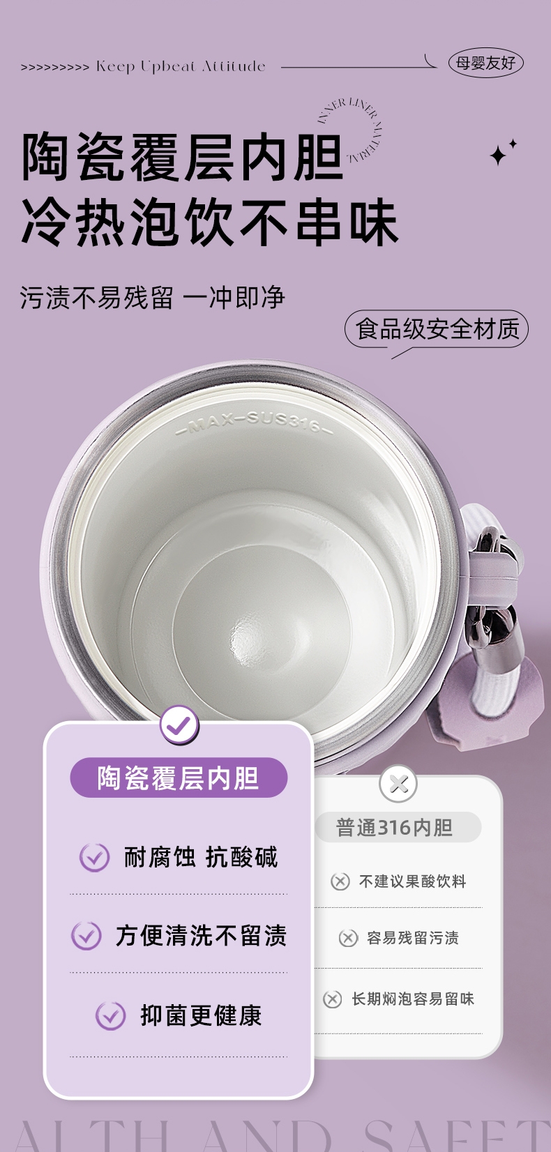 陶瓷内胆涂层,抗酸碱耐腐蚀;甄选316不锈钢材质;精密防漏硅胶圈,多重防漏,无惧晃动,随身携带不湿包;食品级硅胶吸管,安全又健康