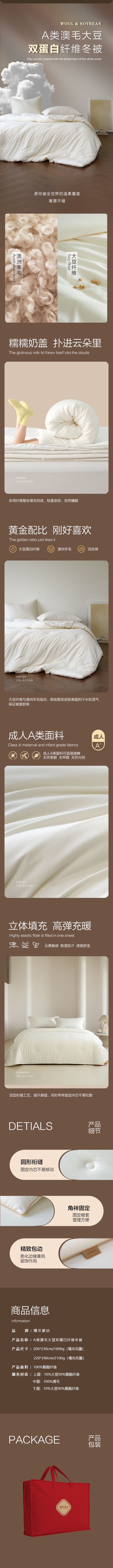 填充:上层:10%大豆90%聚酯纤维/40% 中层:100%澳毛/20% 下层:10%大豆90%聚酯纤维/40%