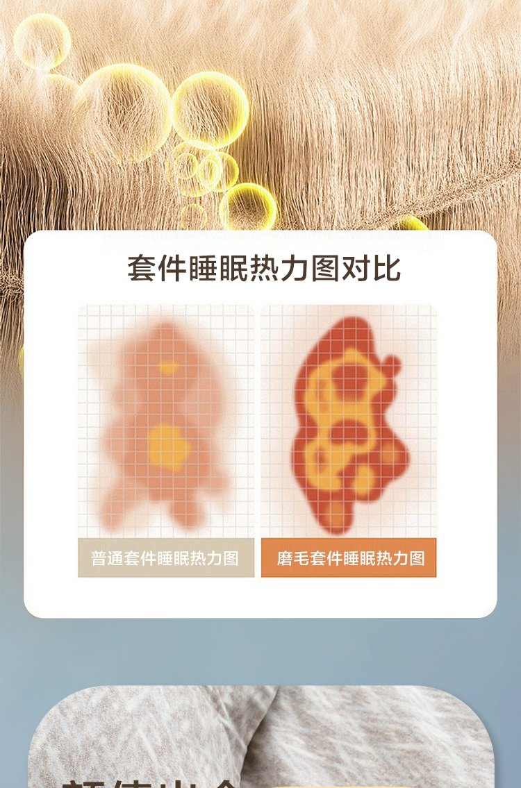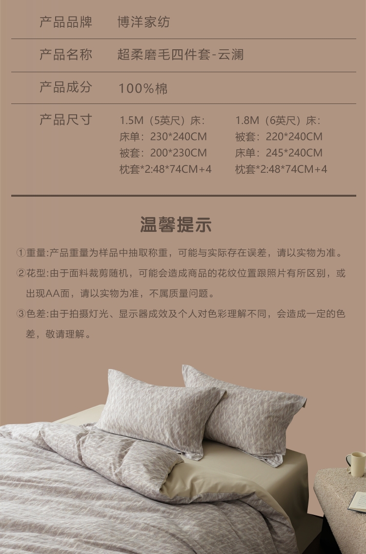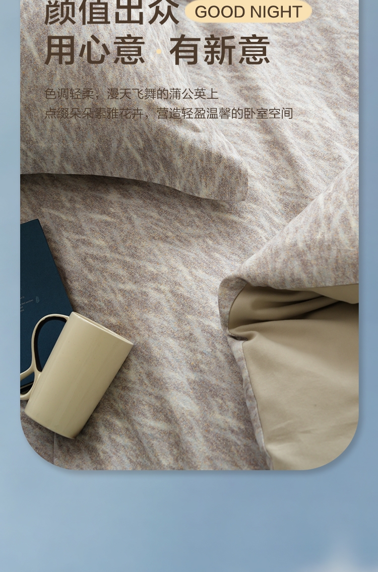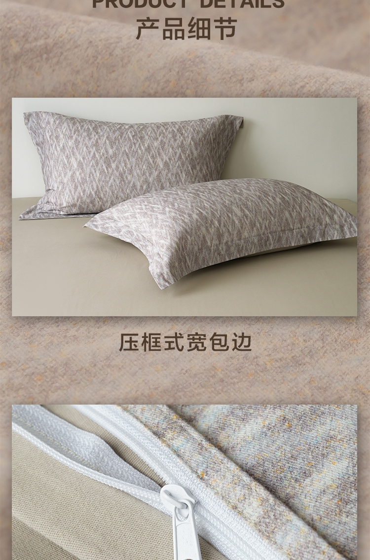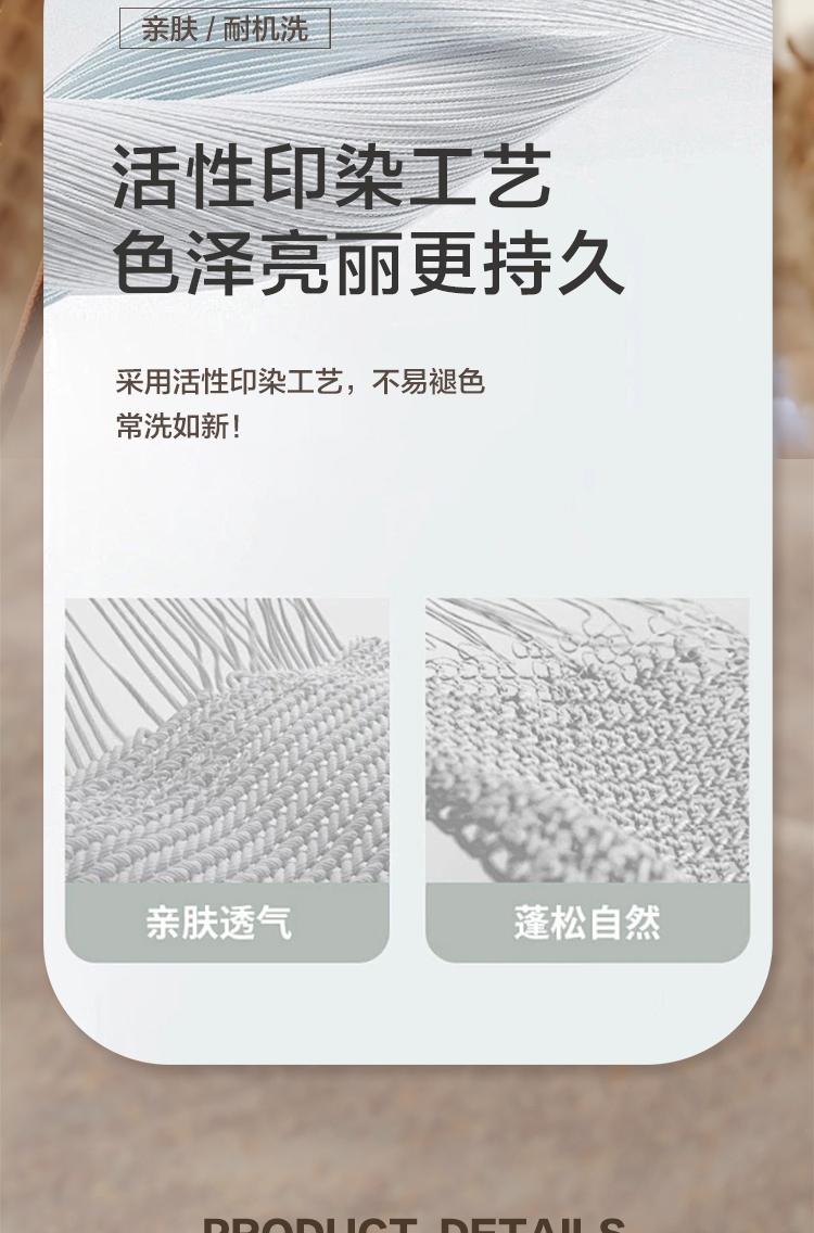 采用精梳棉面料,用磨毛工艺,使面料更柔软轻盈;低饱和度温柔显贵,极简设计,流畅走线勾勒轻奢气场;精湛印染工艺,色牢度高,机洗方便,不易起球