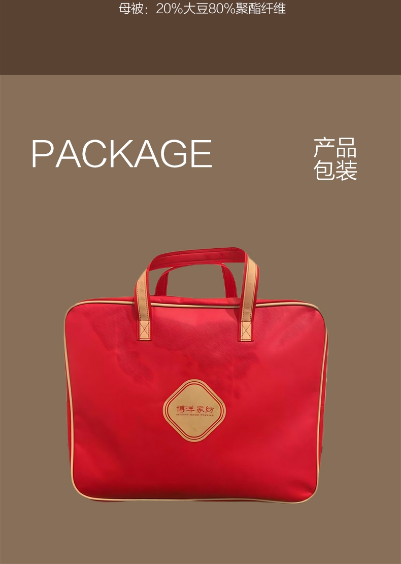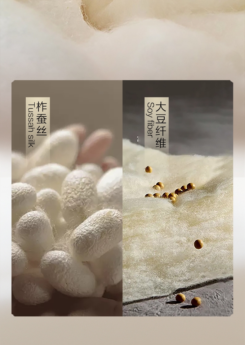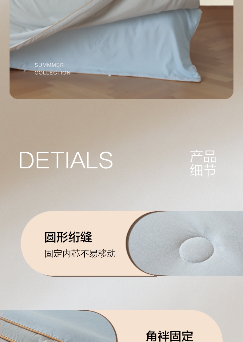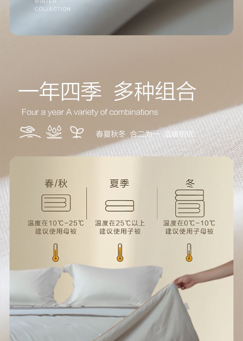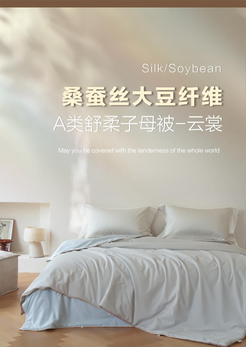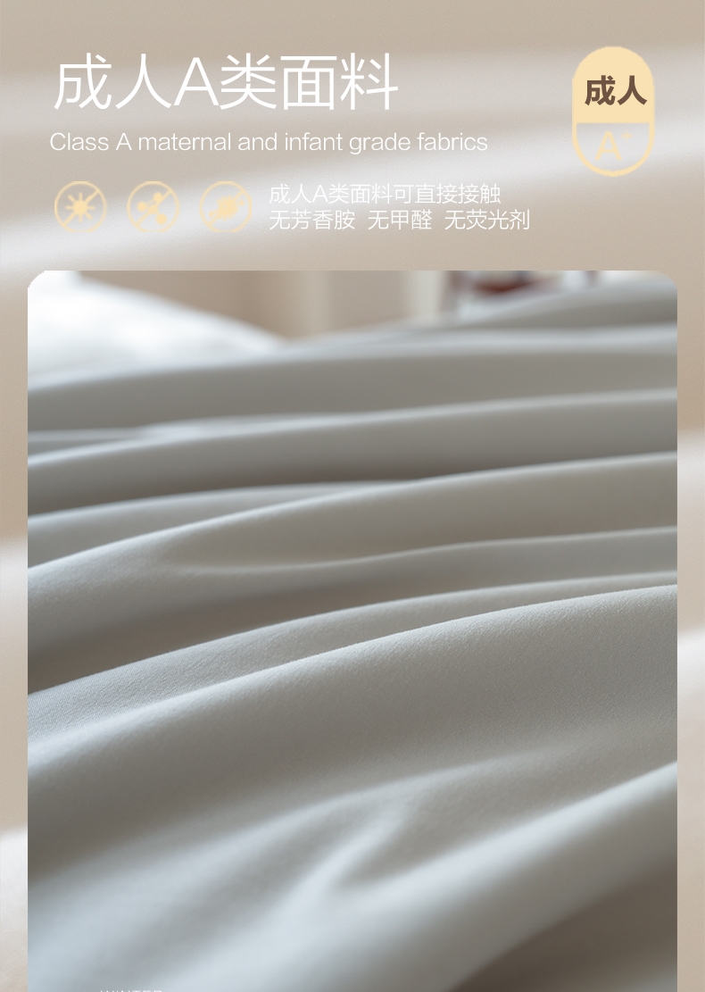 A类面料采用超柔面料,子母被搭配,多种组合适应一年;合理配比采用20%大豆纤维+80%超细纤维填充;简约绗缝,固定填充,不易跑绒