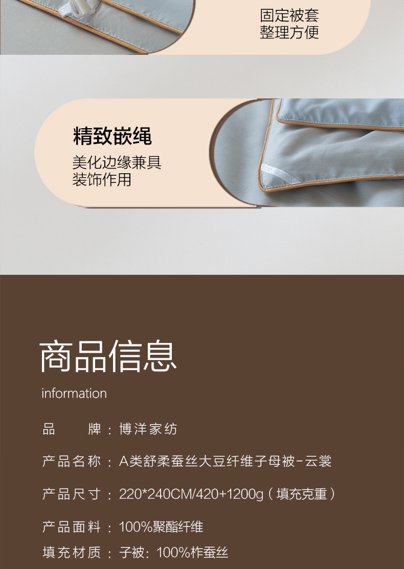 填充:子被:100%柞蚕丝/420g 母被:20%大豆80%聚酯纤维/1200g