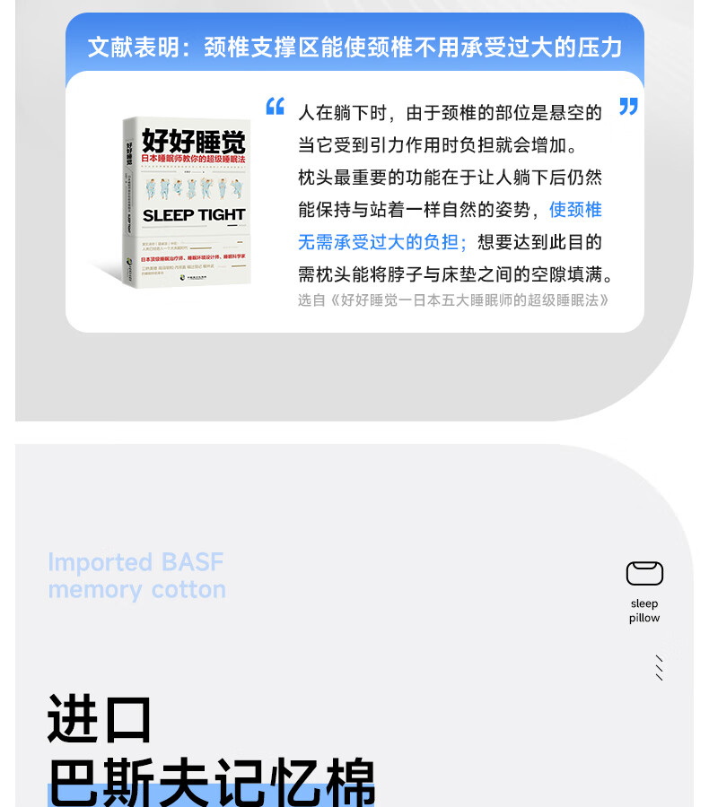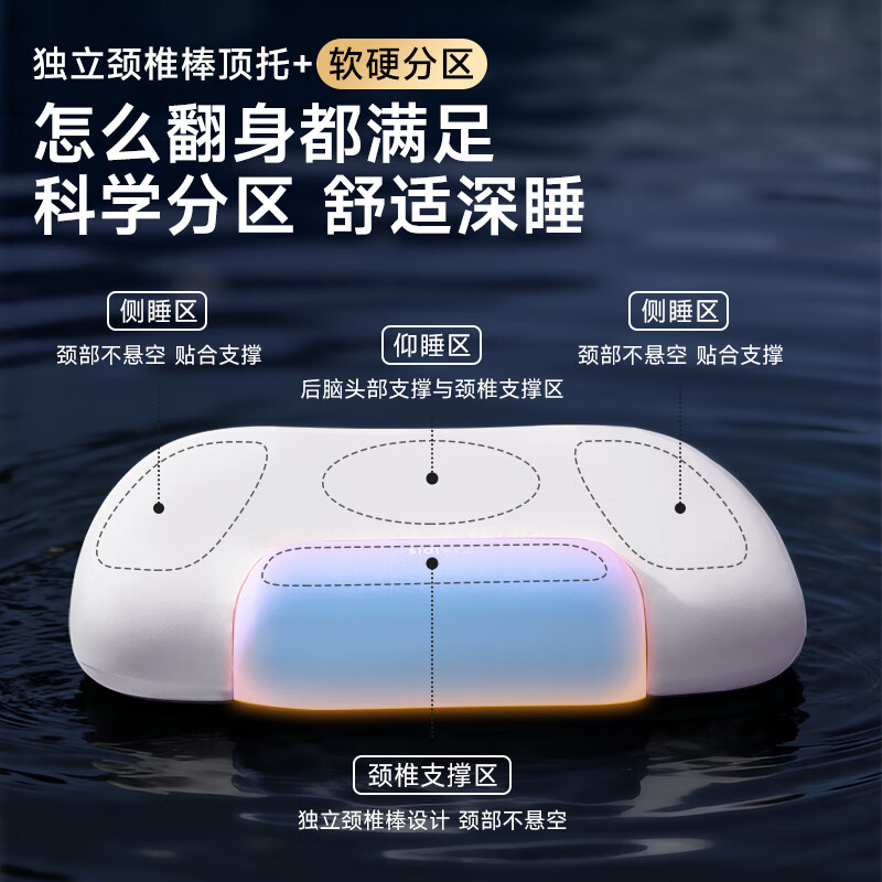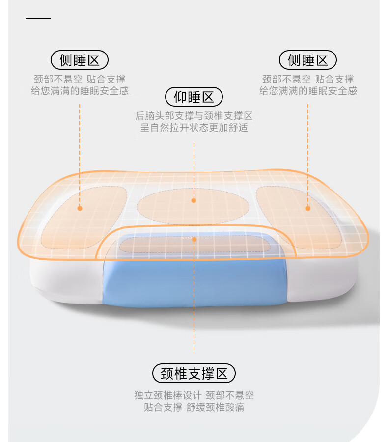 【双向可睡】颈椎专用枕;高枕区】高密度12厘米拉伸,还原健康颈椎弧度;【低枕区】9厘米舒适承托更适合整夜熟睡