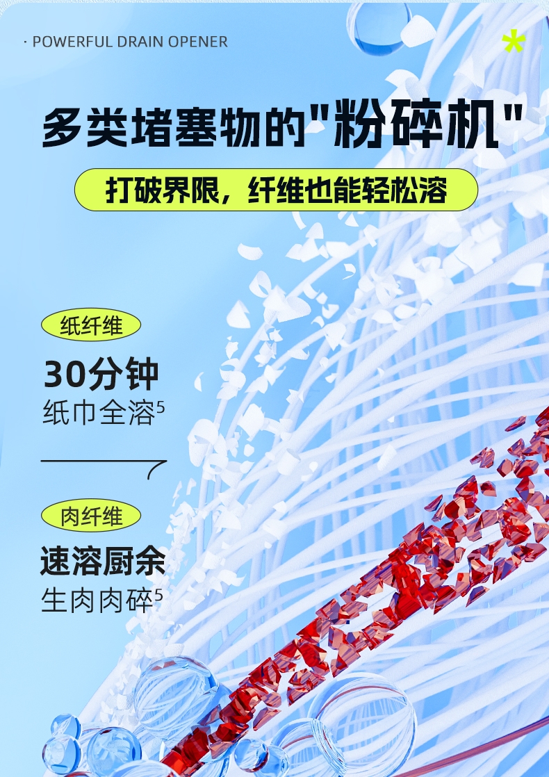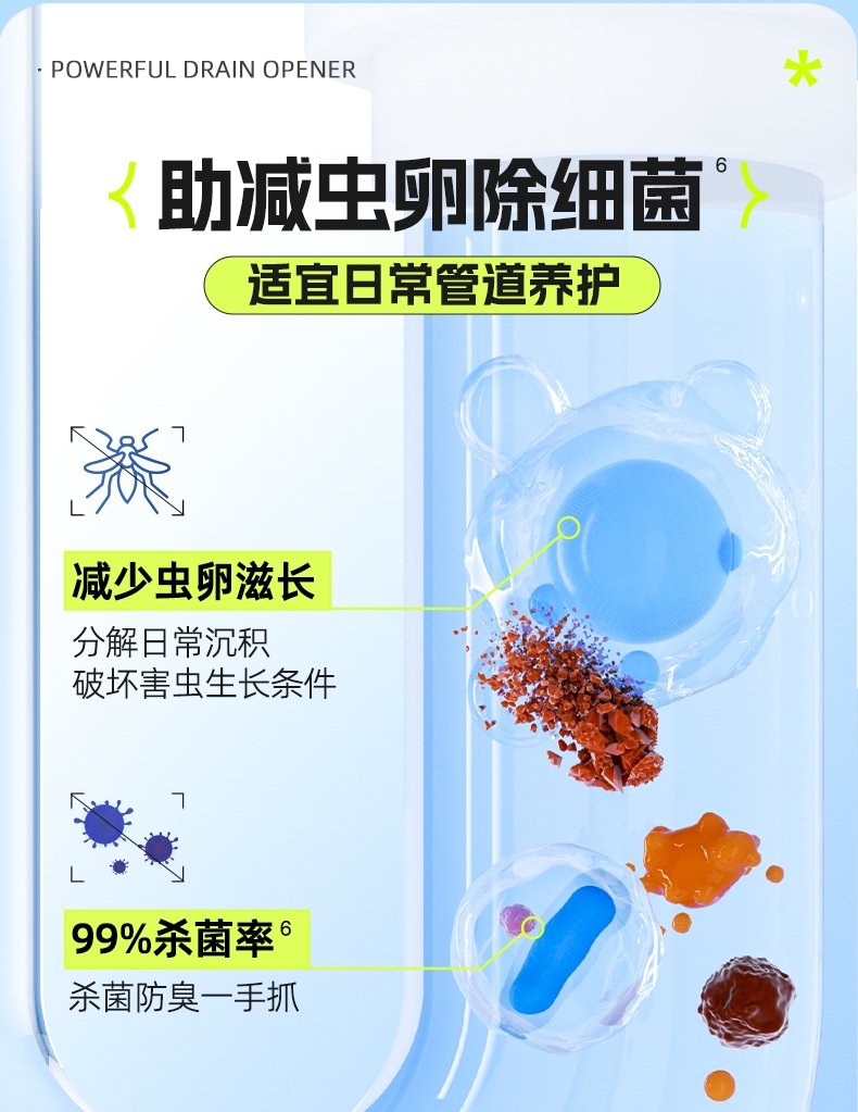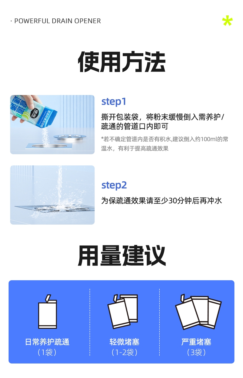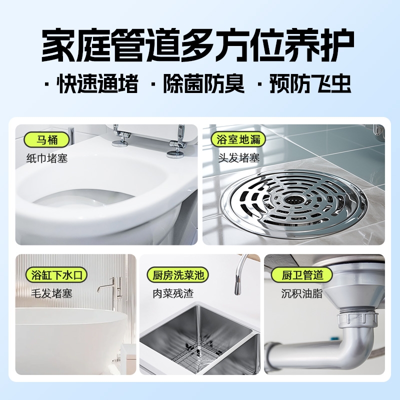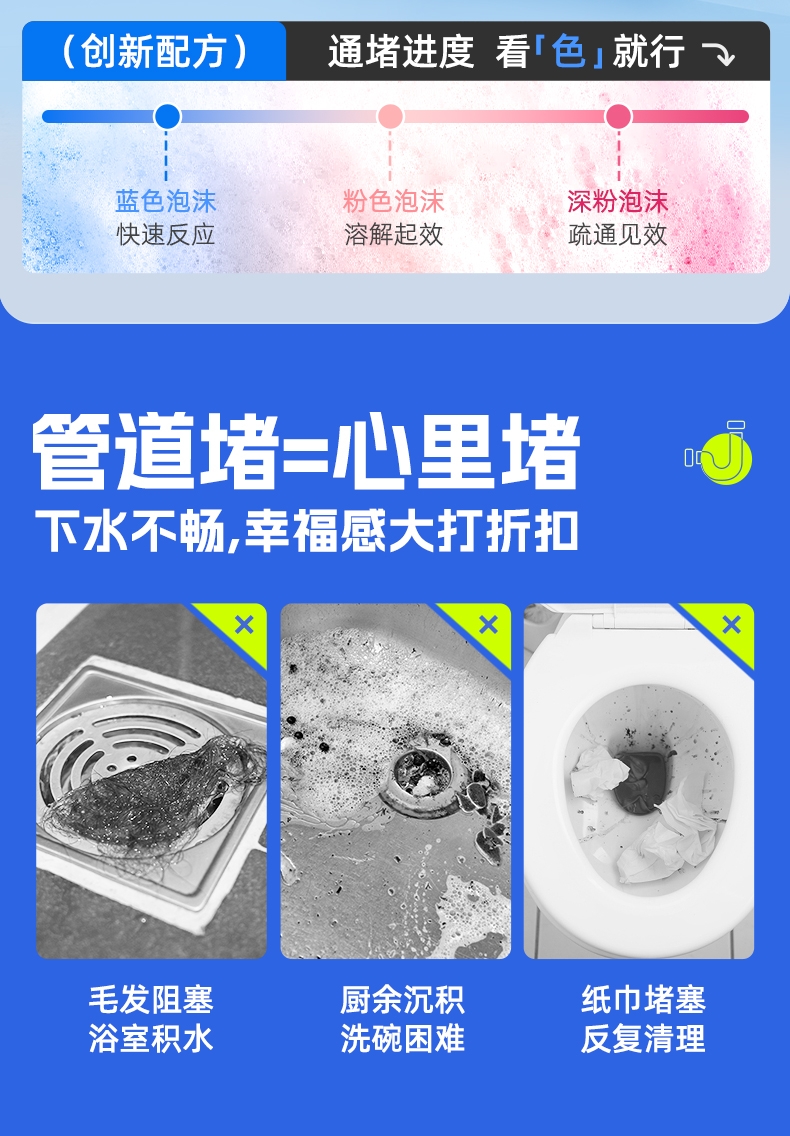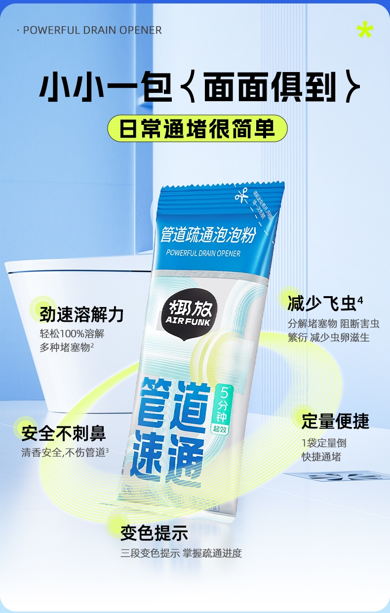畅顺下水,解决沐浴积水及管道清理烦恼;养护清洁管道,除菌|防臭|防虫 ,1袋搞定;创新变色疏通 通堵进程肉眼可见
