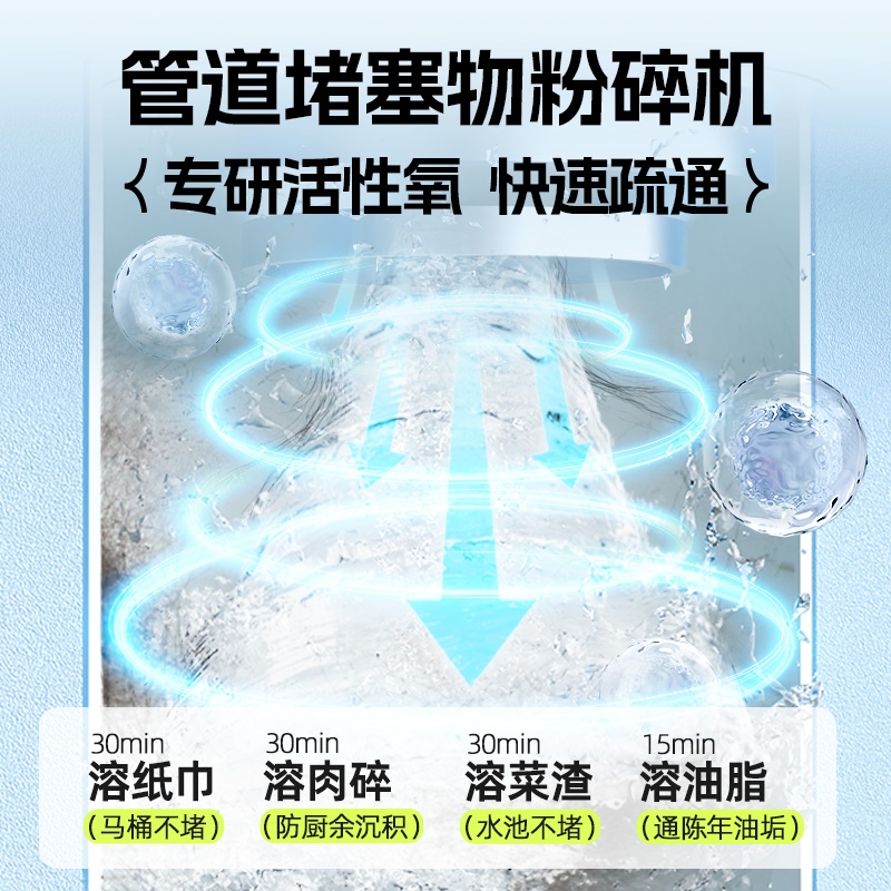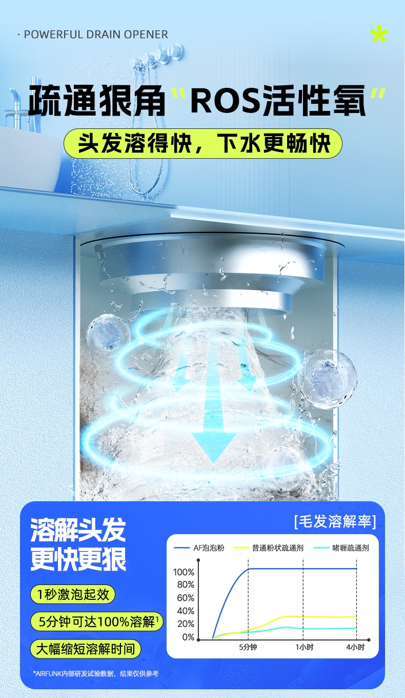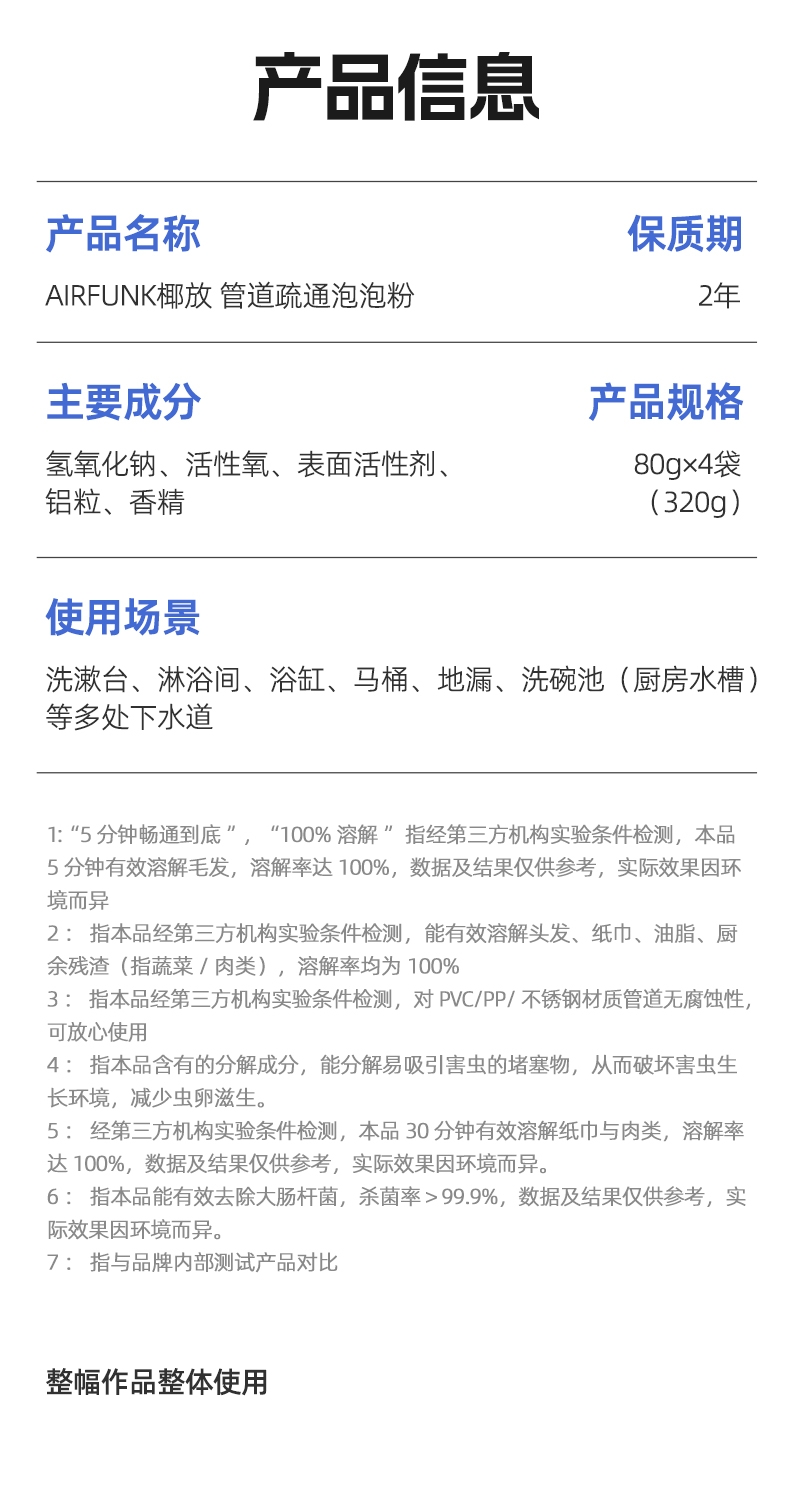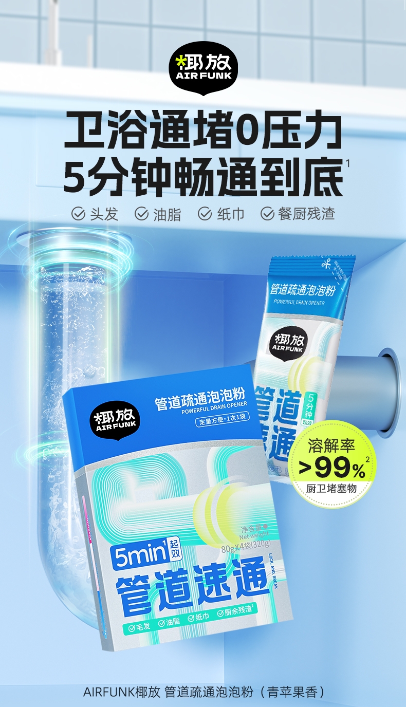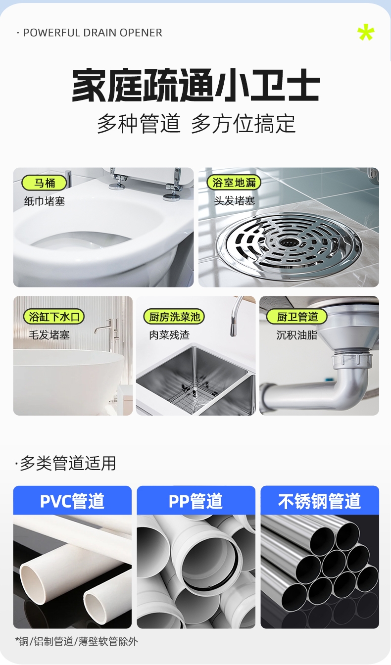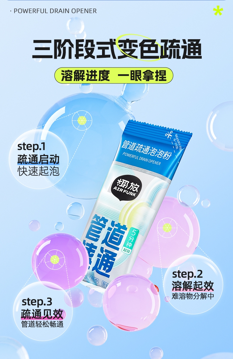 畅顺下水,解决沐浴积水及管道清理烦恼;养护清洁管道,除菌|防臭|防虫 ,1袋搞定;创新变色疏通 通堵进程肉眼可见